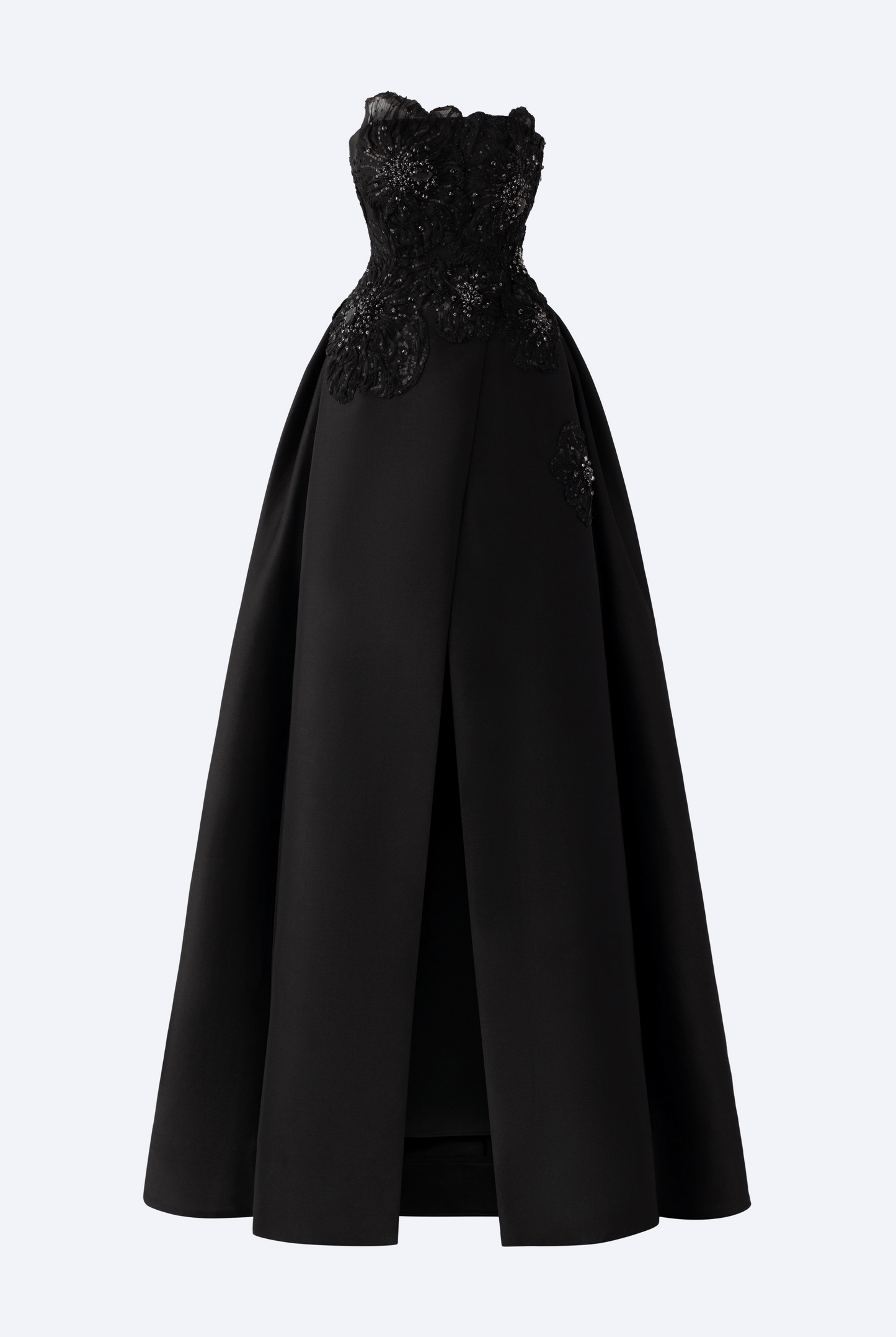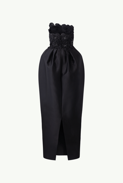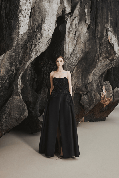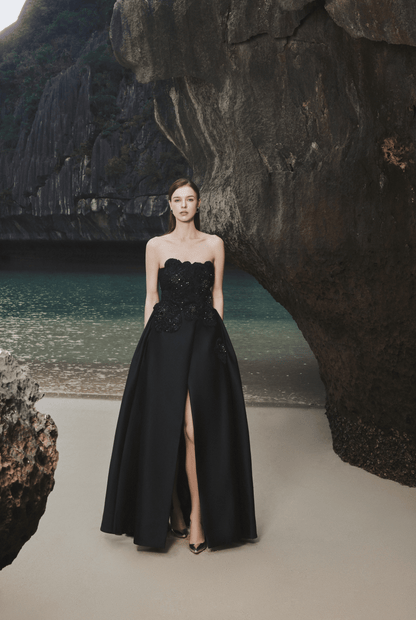 The Full Dress by Tracy Studio embodies luxury, femininity, and elegance. With its strapless design, embellished with flower embroidery and high-quality tailoring and hand-cutting techniques, this dress is a statement piece for formal events. The split skirt adds a touch of glamour, ensuring that the wearer will turn heads at any dinner party or red carpet event. This dress is a perfect choice for the stylish and confident woman who wants to make a lasting impression.