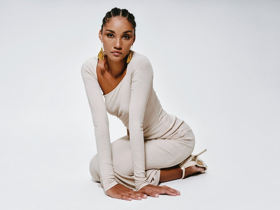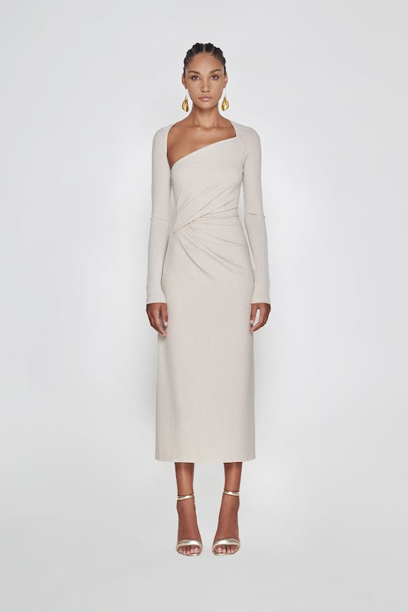 Tonyy adds playful details to its designs as showcased by this ribbed knit long dress. Its asymmetric silhouette features cut-out detailing, presented in a bright cream color.