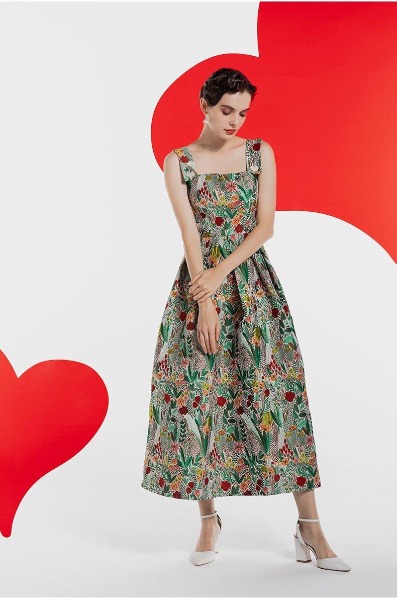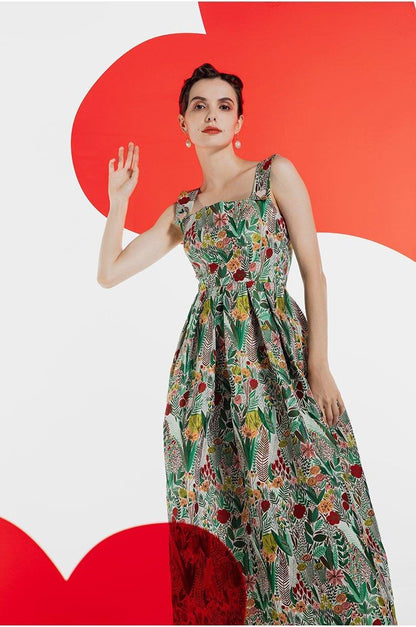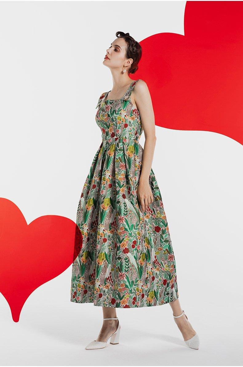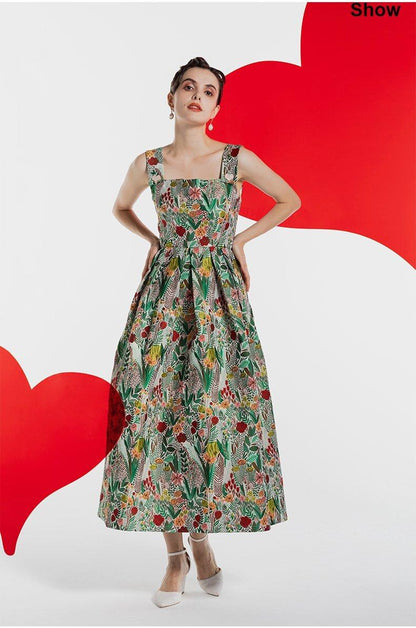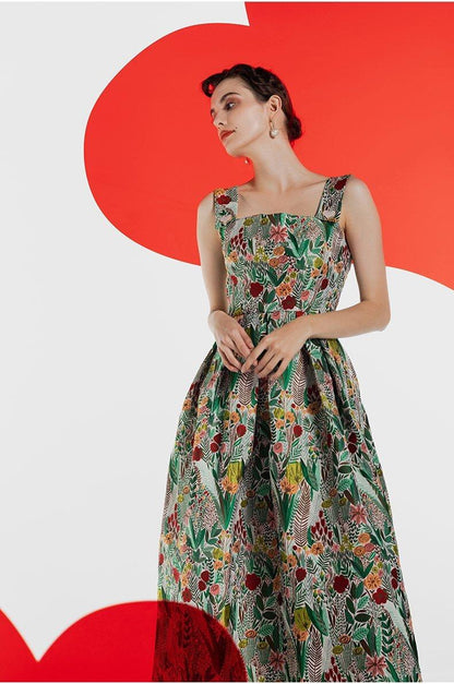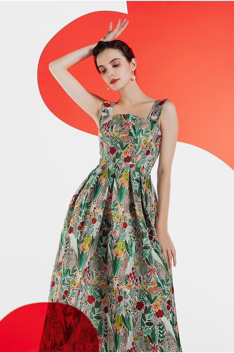 Custom green floral jacquard princess sling fairy dress - Ruila