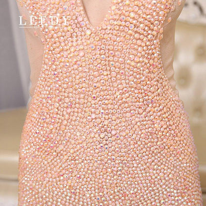 Deep V-neck sexy fashion tulle mesh fishtail slim fit beaded sequins skirt apricot pink dress- Octavia