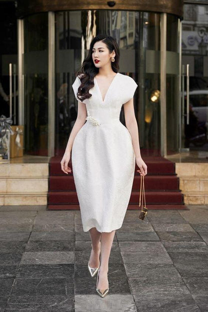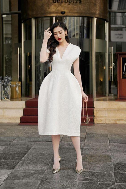 DIAMONDE V-NECK MIDI WHITE DRESS- Creusa
