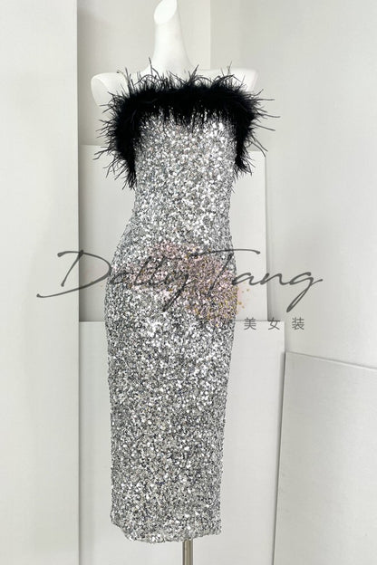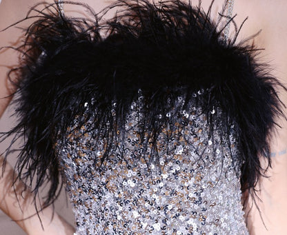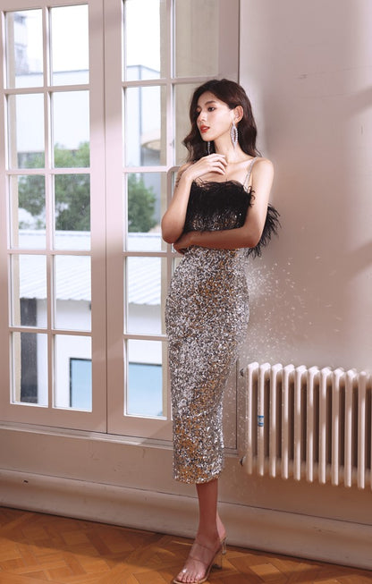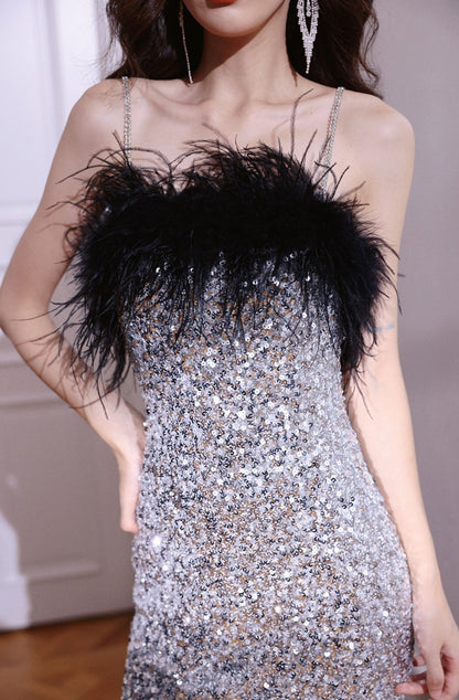 Indulge in this elegant black feather sliver sleeveless slim fit cocktail dress. Embody the essence of luxury and sophistication with the demure yet sexy design. Perfect for any occasion, this dress effortlessly combines style and grace, making you the center of attention. Truly a must-have for any fashion-forward individual.