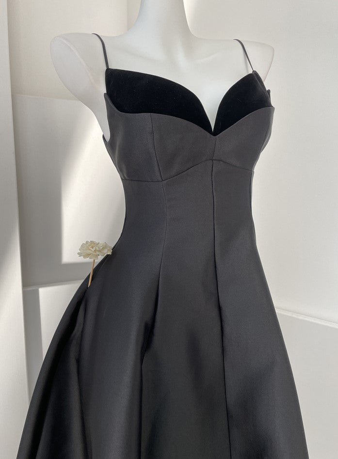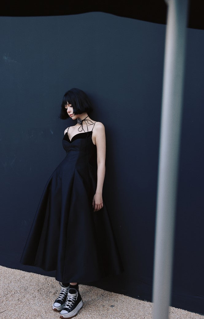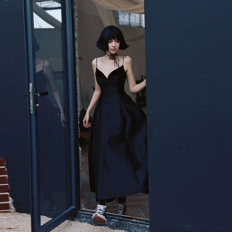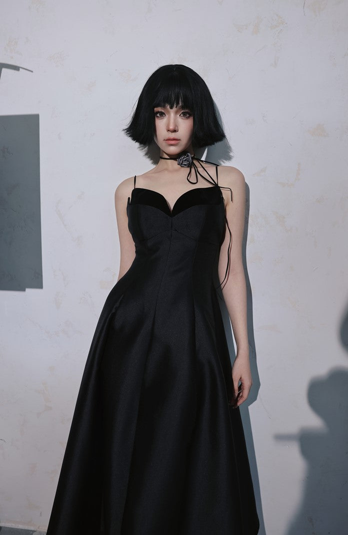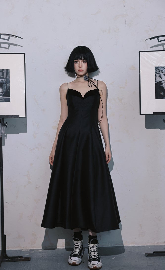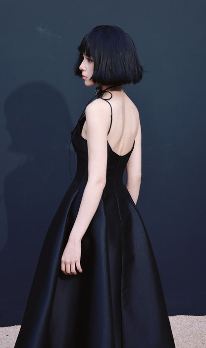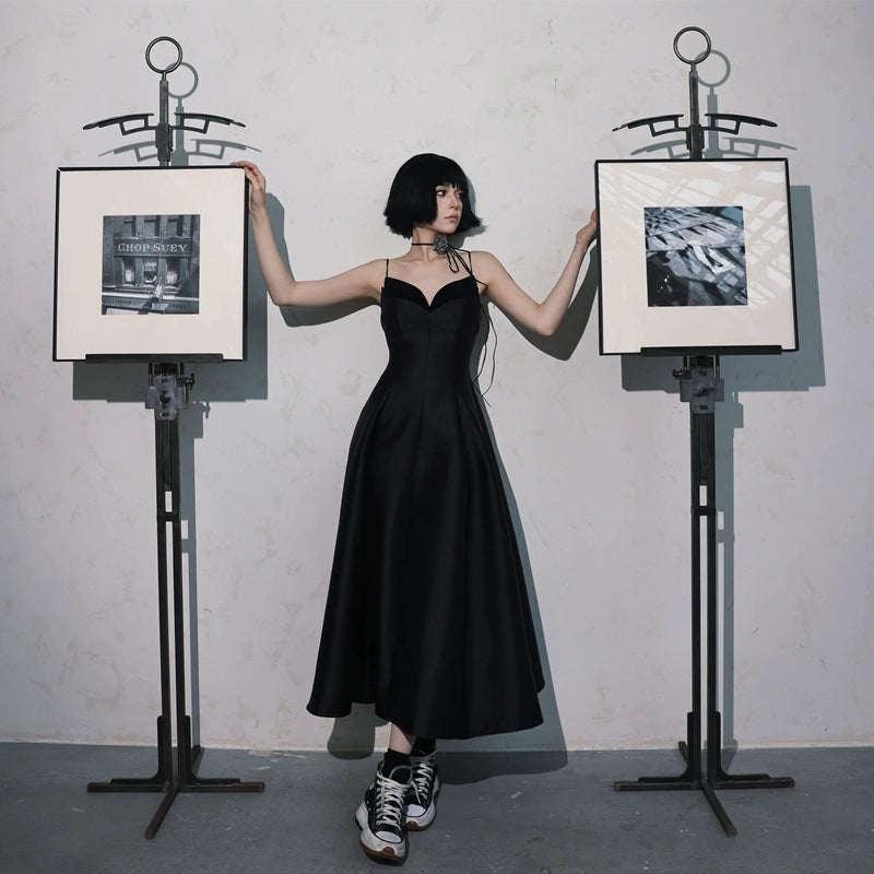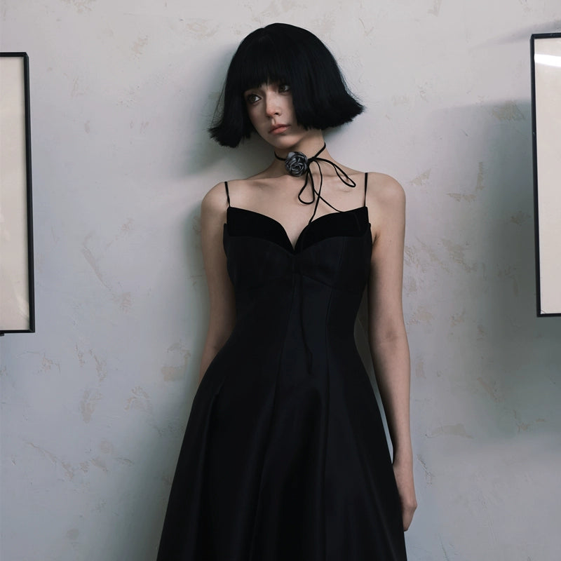 DOLLY Elegant Black French Style V-Neck High Waist A-line Suspender Date Dress-NECHE (V)