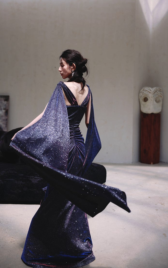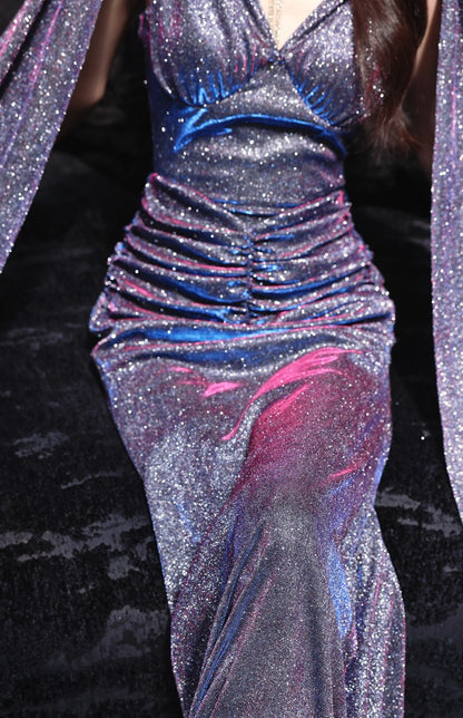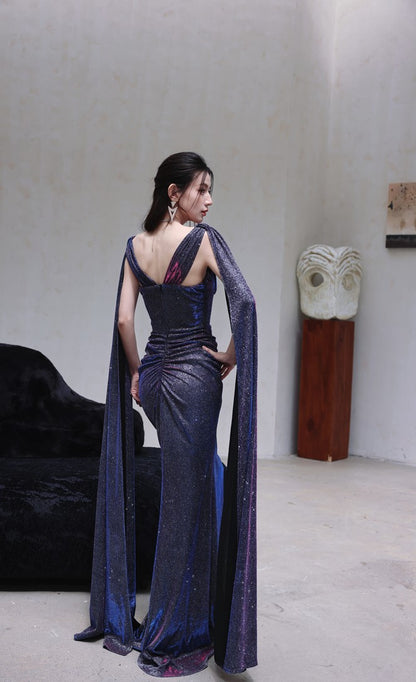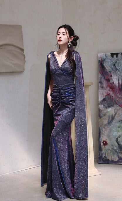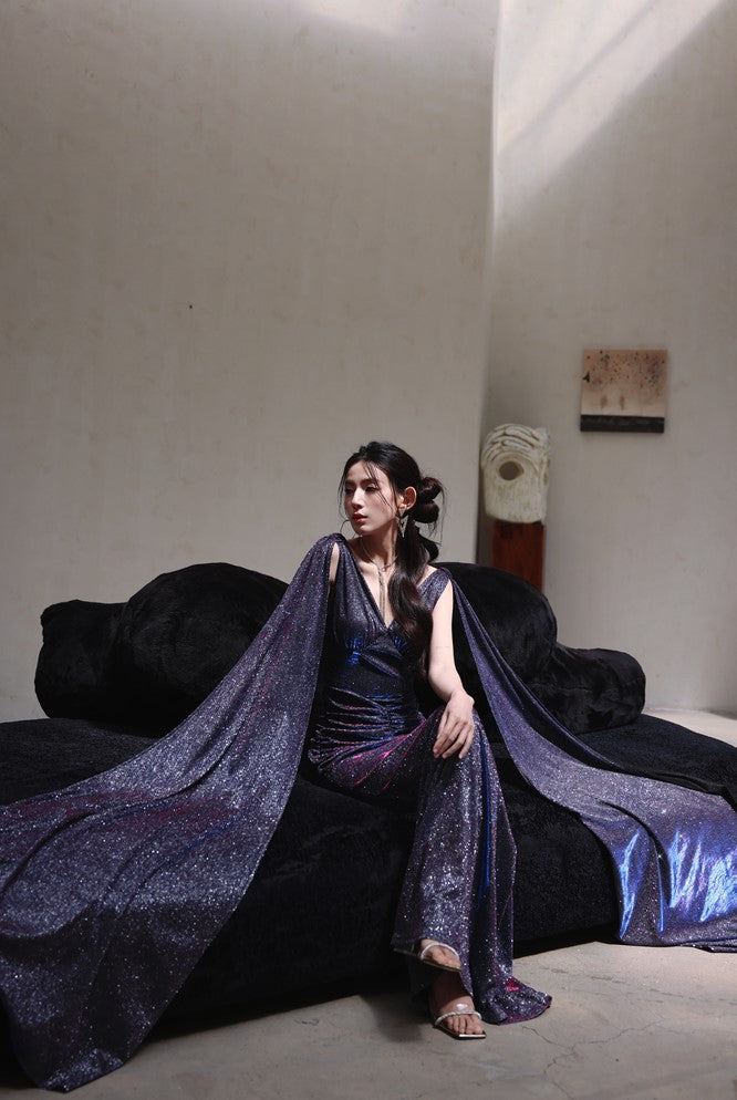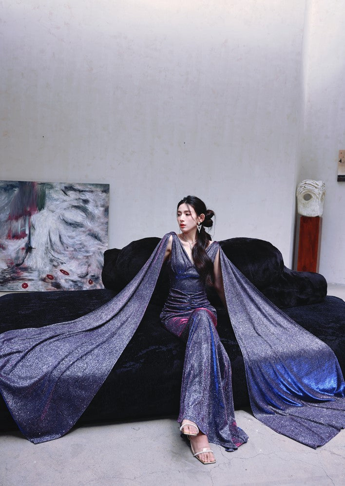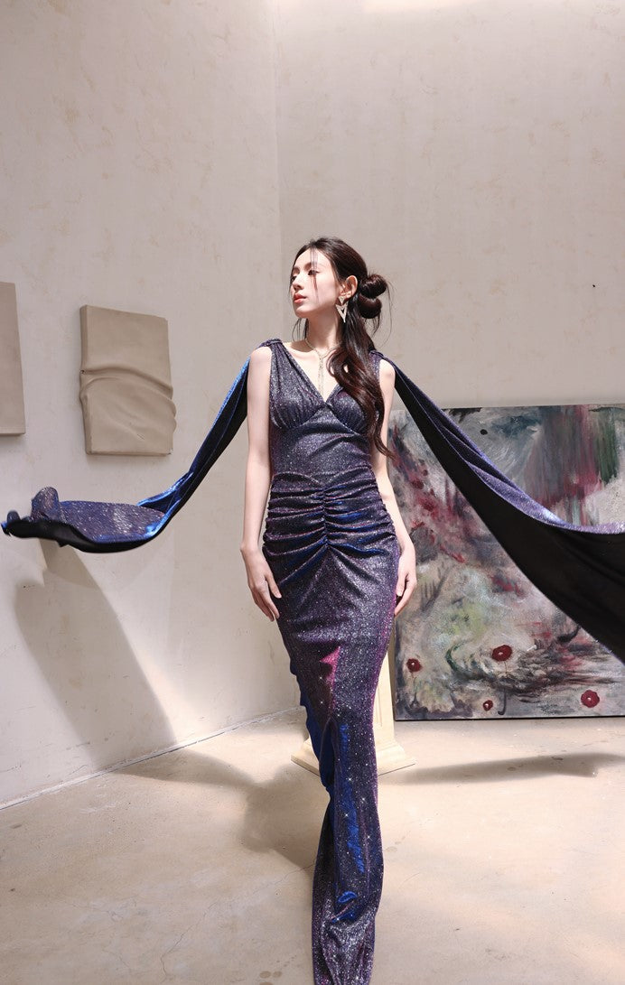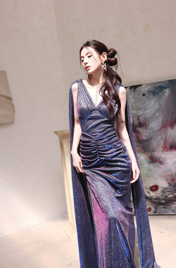 DOLLY Elegant Blue Gray Deep V-Neck Sleeveless Slim Fit Shawl Dinner Dress-KRISTI (V)