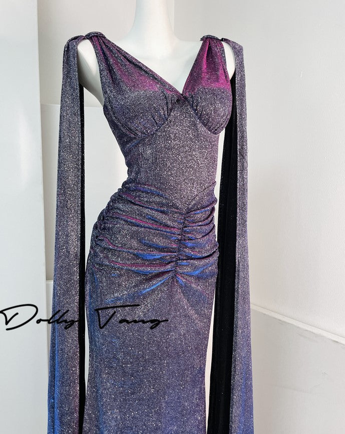 Elevate your style with our DOLLY Elegant Blue Gray Dress. Featuring a deep V-neck and sleeveless design, this slim fit shawl dress exudes class and sophistication. Perfect for any dinner occasion, the KRISTI (V) dress will make you the epitome of elegance. Complete your wardrobe with this exquisite and exclusive piece.