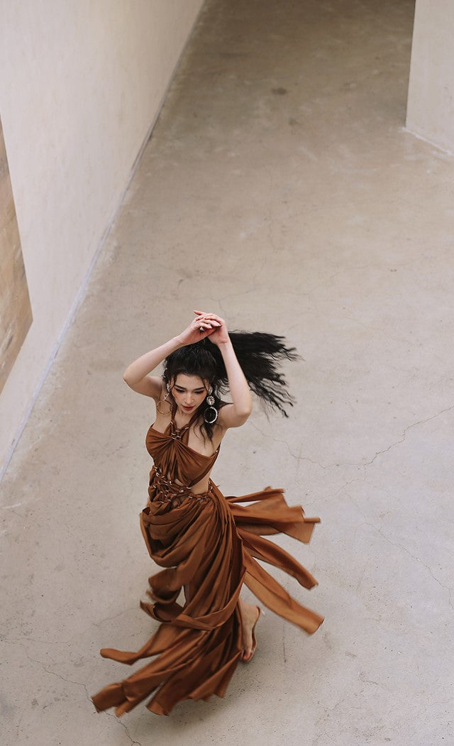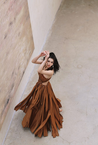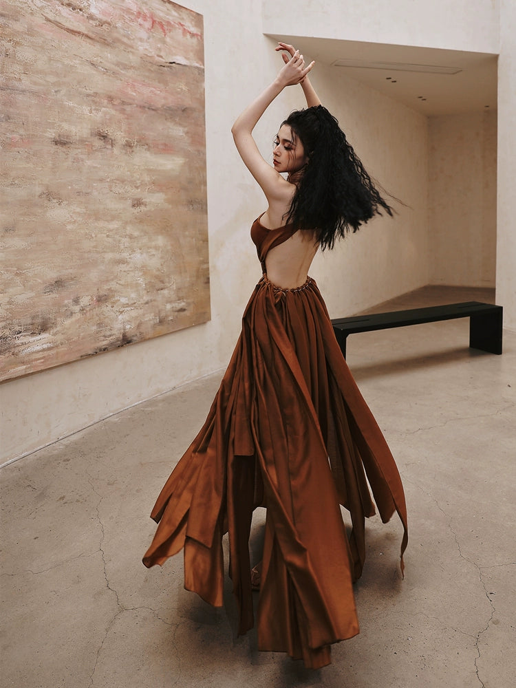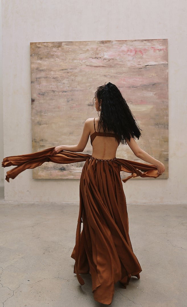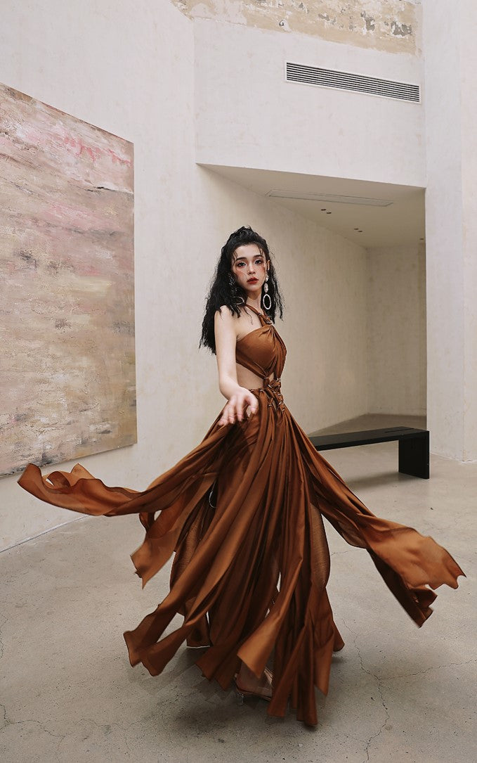 Elevate your resort style with the DOLLY Elegant Brown Dress. The halter neck and high waist create a mesmerizing silhouette, while the loose pleated design adds a touch of sophistication. This dress is perfect for any occasion, making you feel both sexy and elegant.