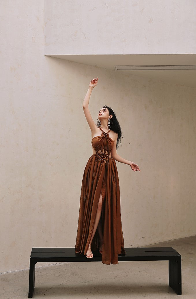 DOLLY Elegant Brown Halter Neck Loose High Waist Pleated Resort Dress-VERA (V)