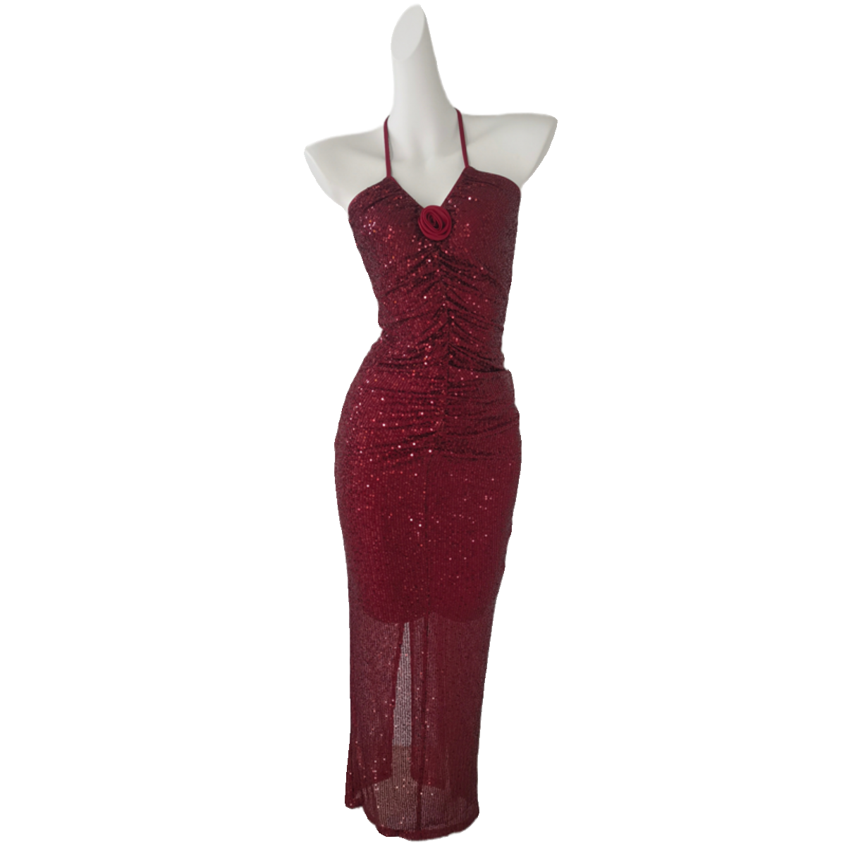 DOLLY Elegant Burgundy Red Halter Neck Slim Fit Sequin Long Cocktail Dress-KIKI (V)