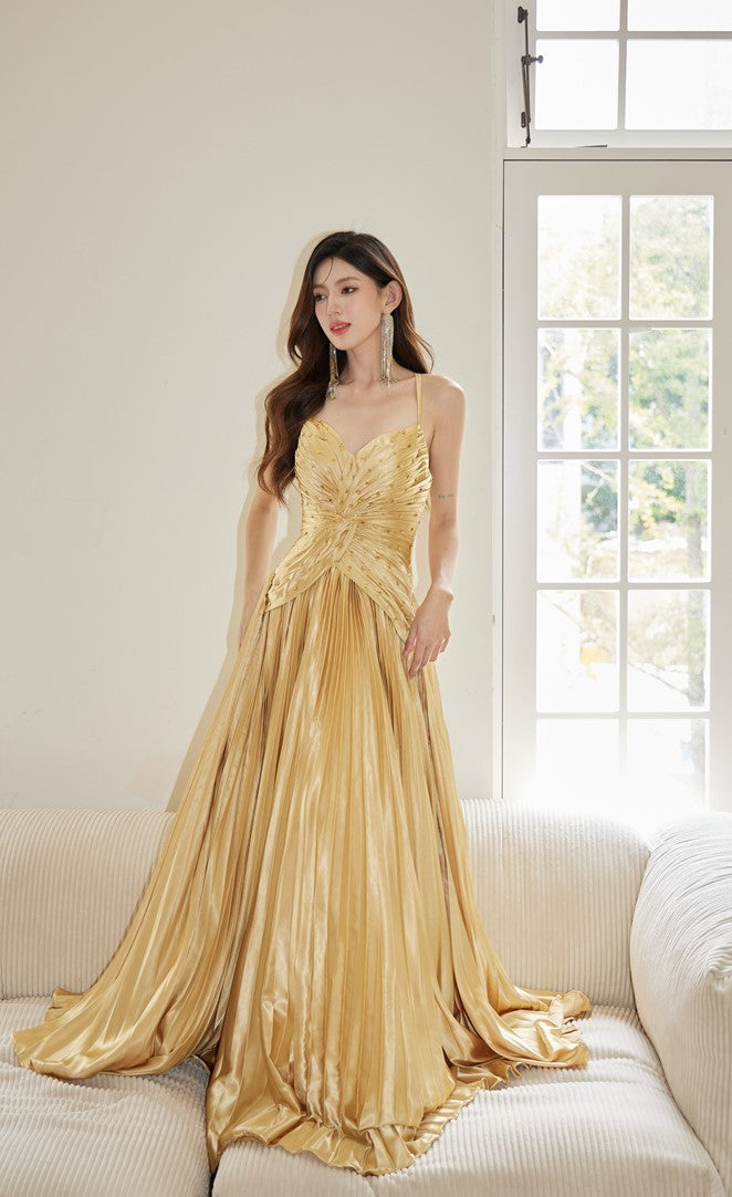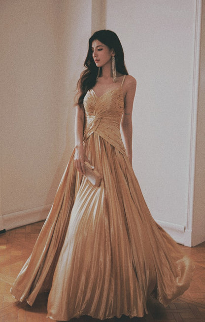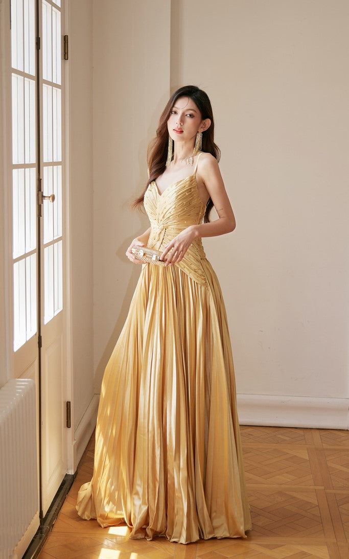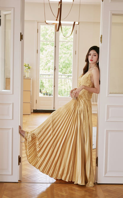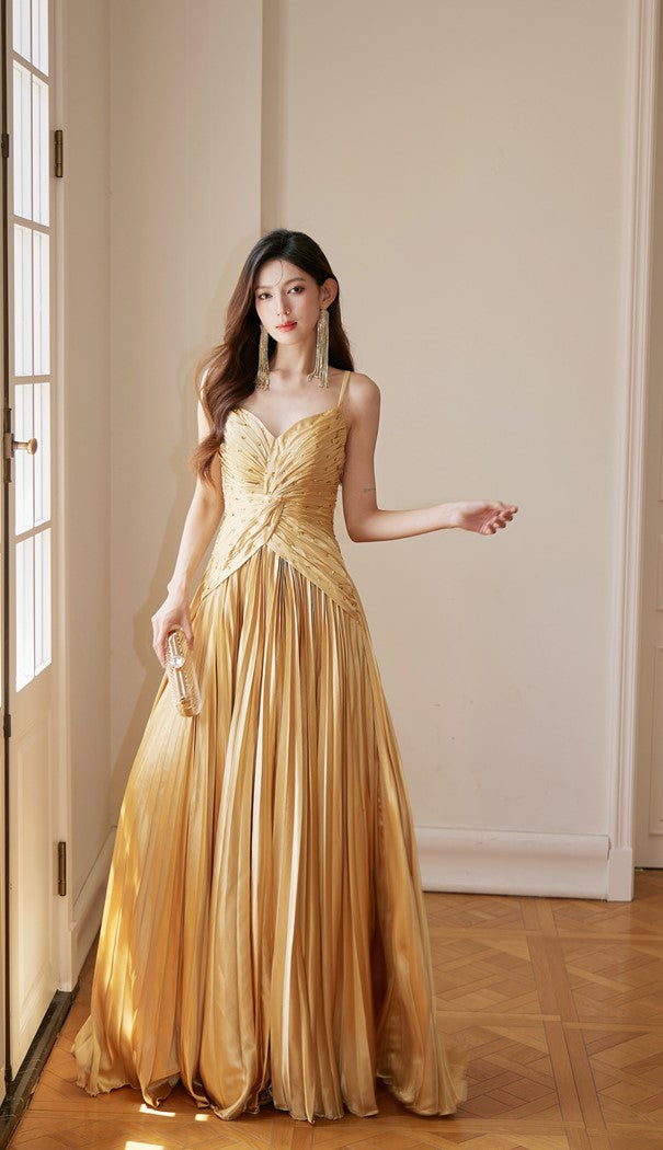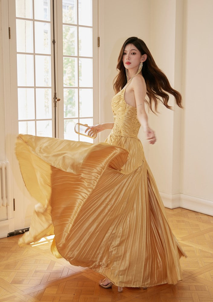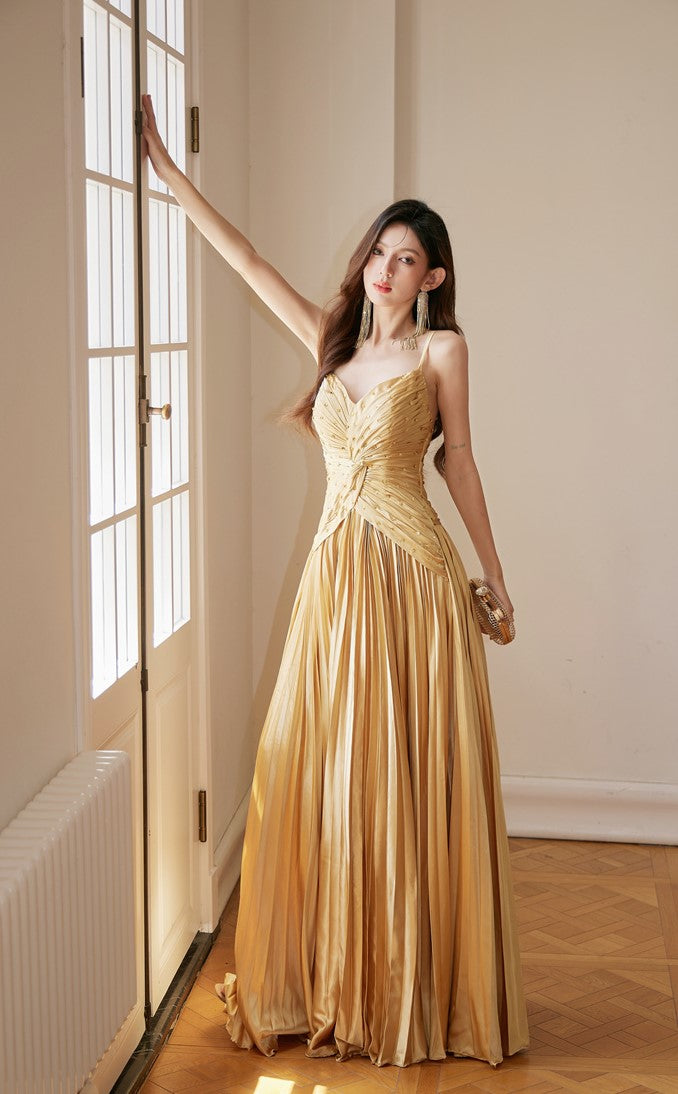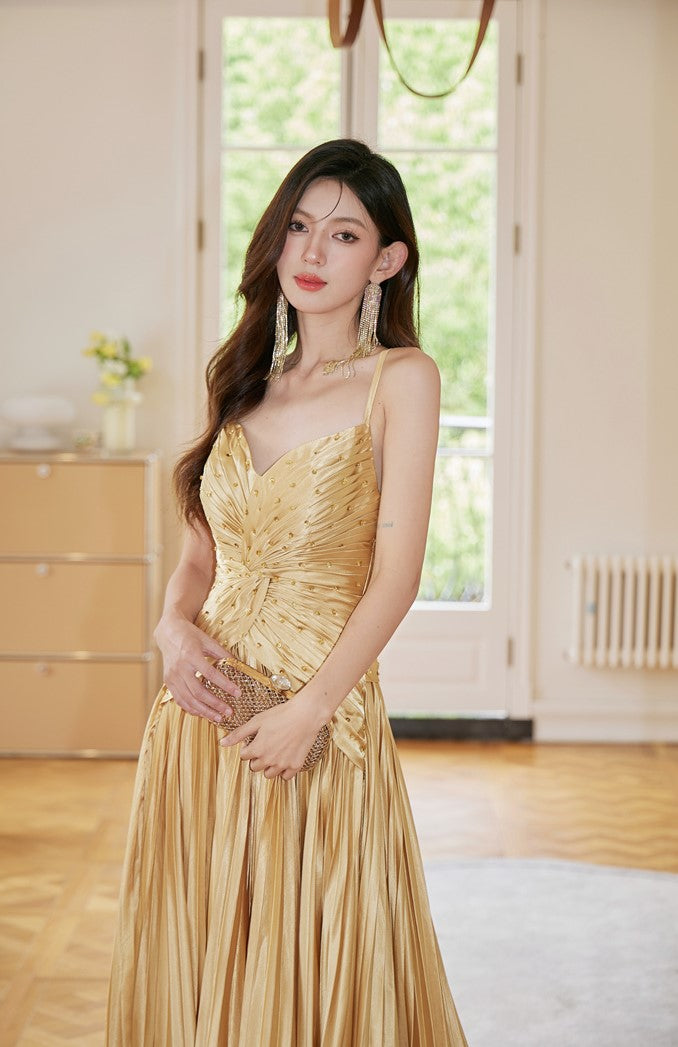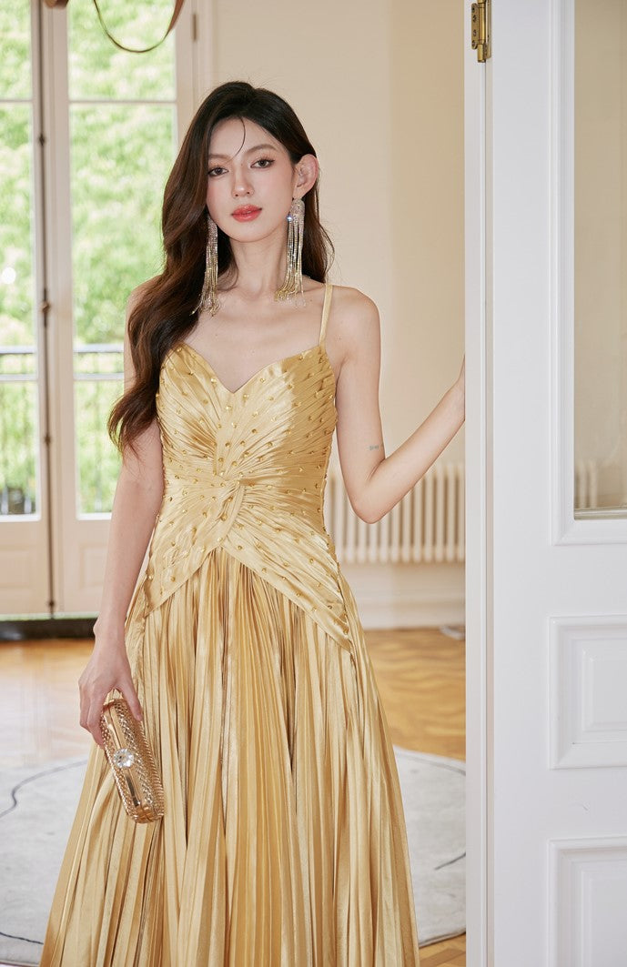 DOLLY Elegant Gold Sleeveless Beaded Pleated Large Swing Dress-GRACIA (V)