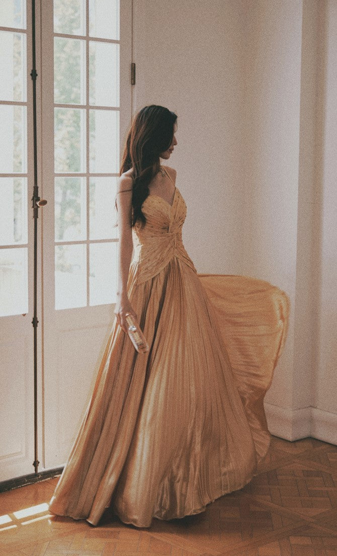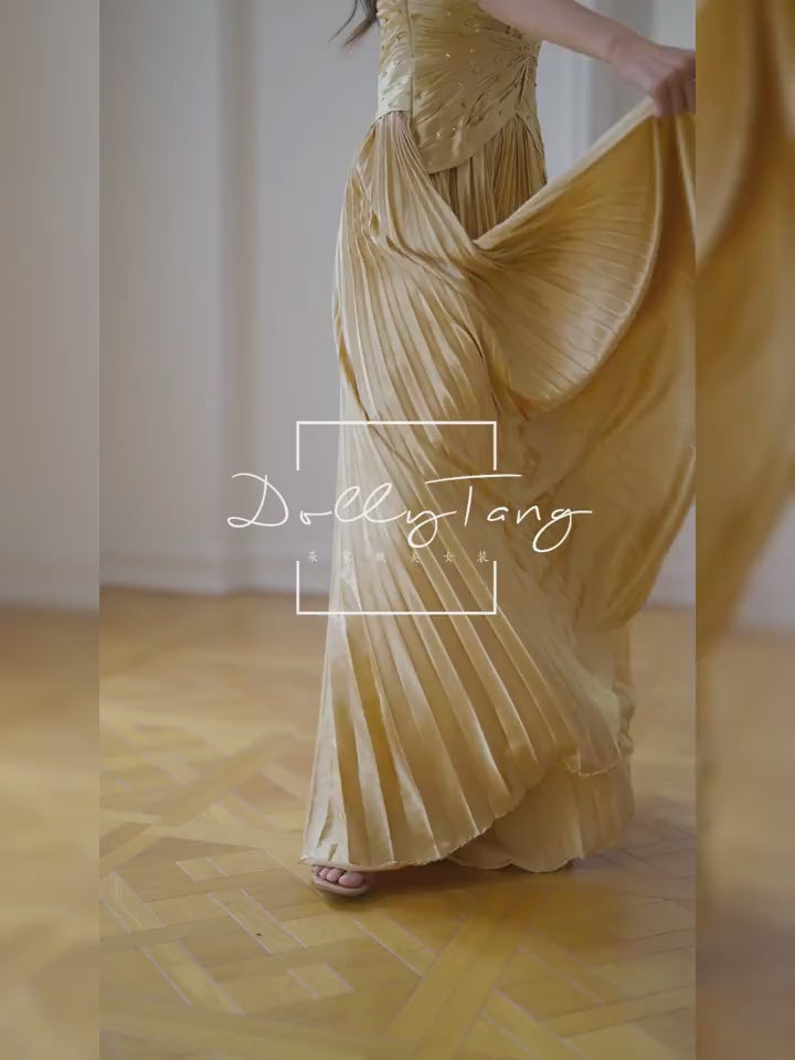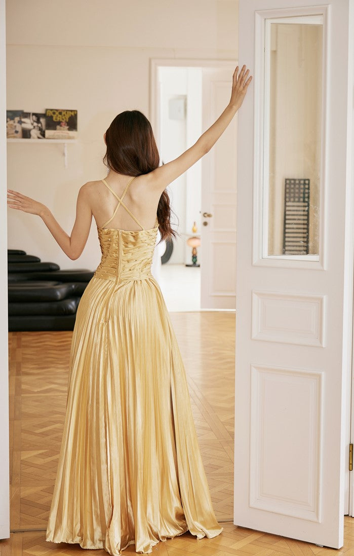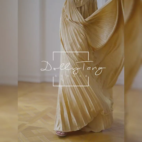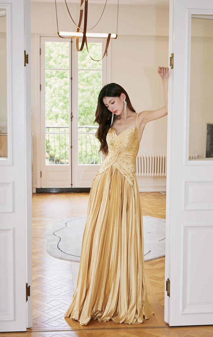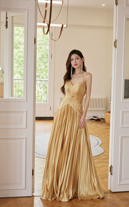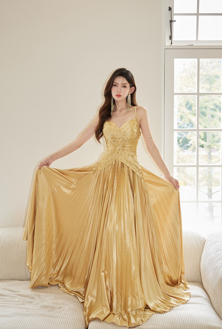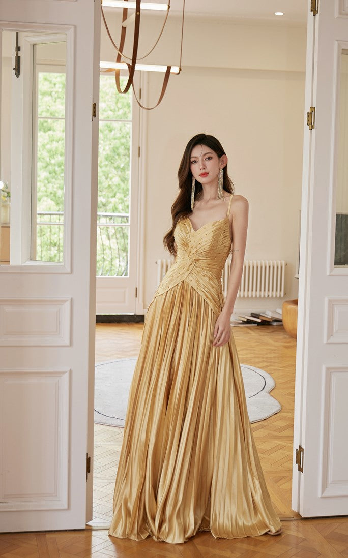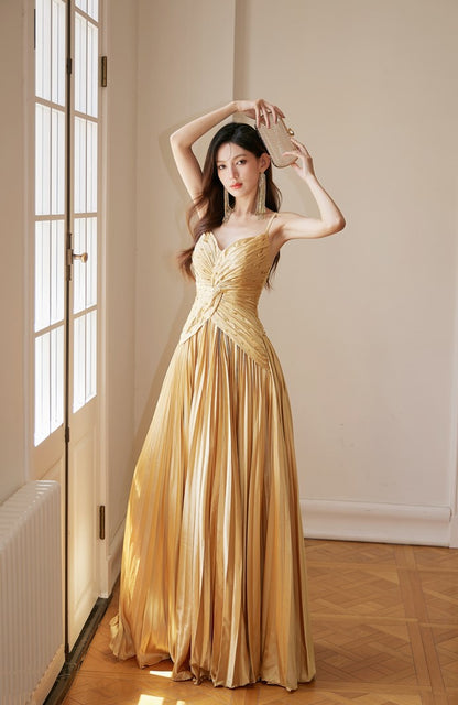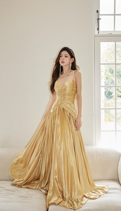 DOLLY Elegant Gold Sleeveless Beaded Pleated Large Swing Dress-GRACIA (V)
