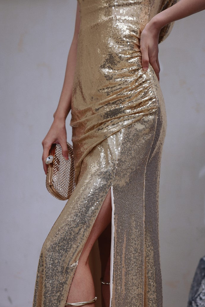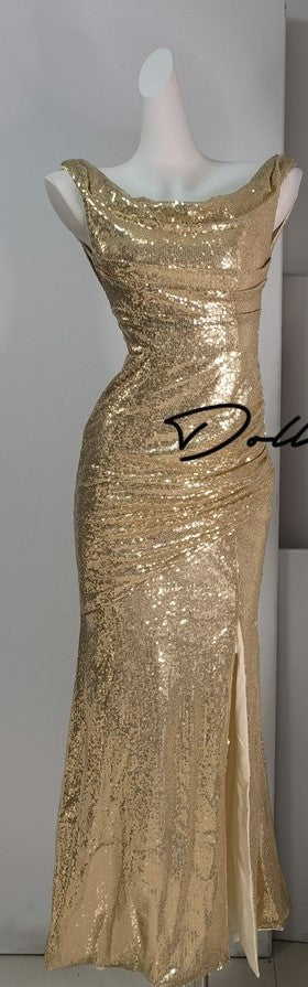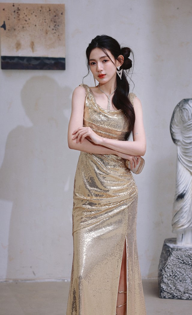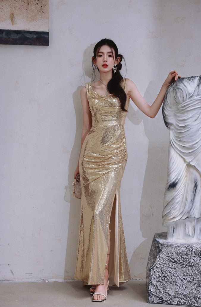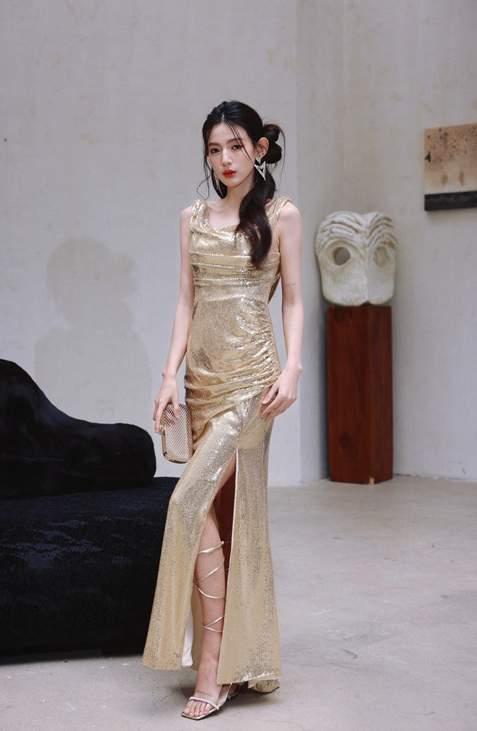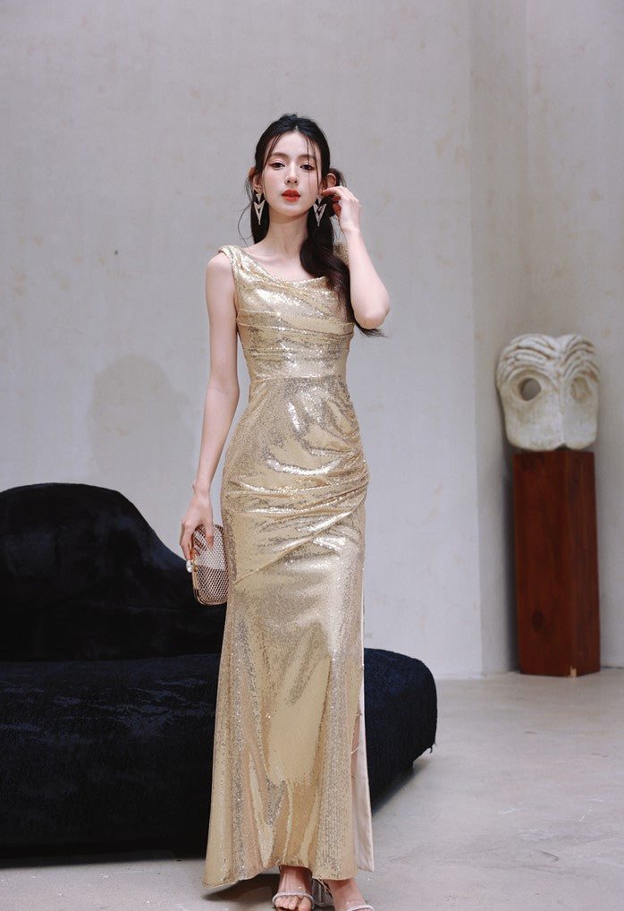 DOLLY Elegant Gold Sleeveless Open Neck Backless Glitter Banquet Dress-BOMA (V)