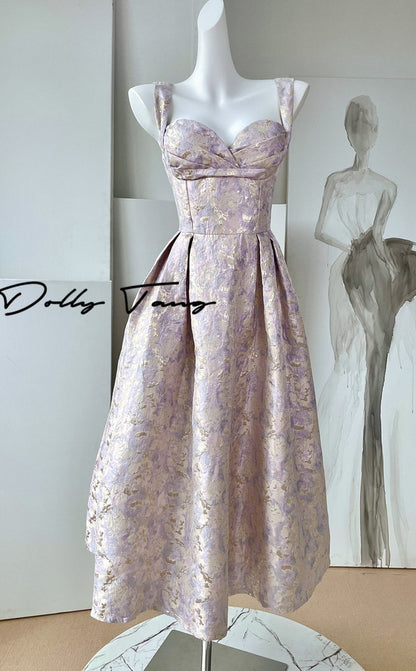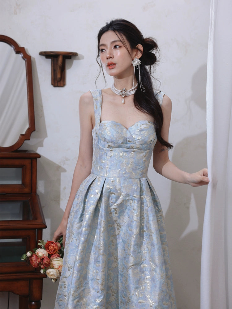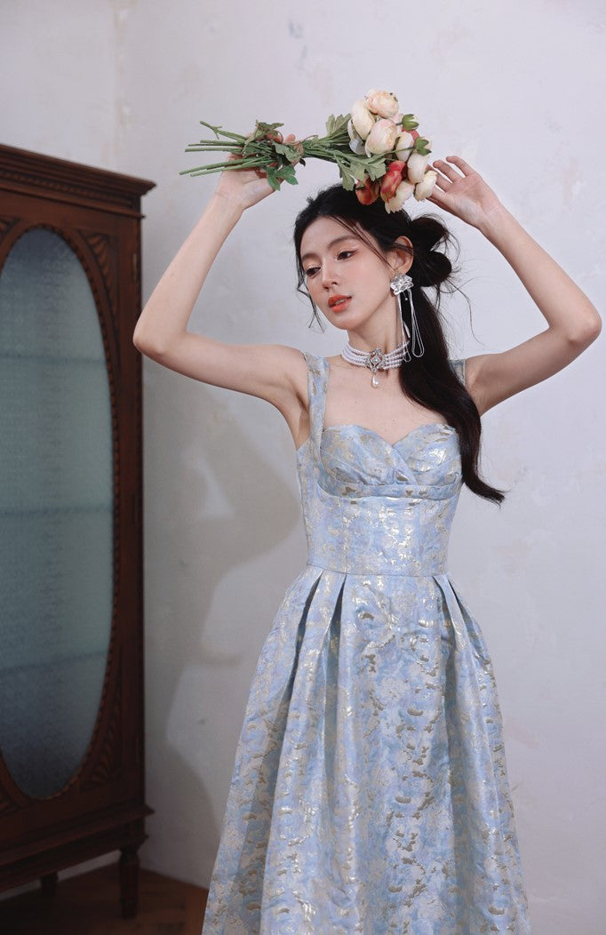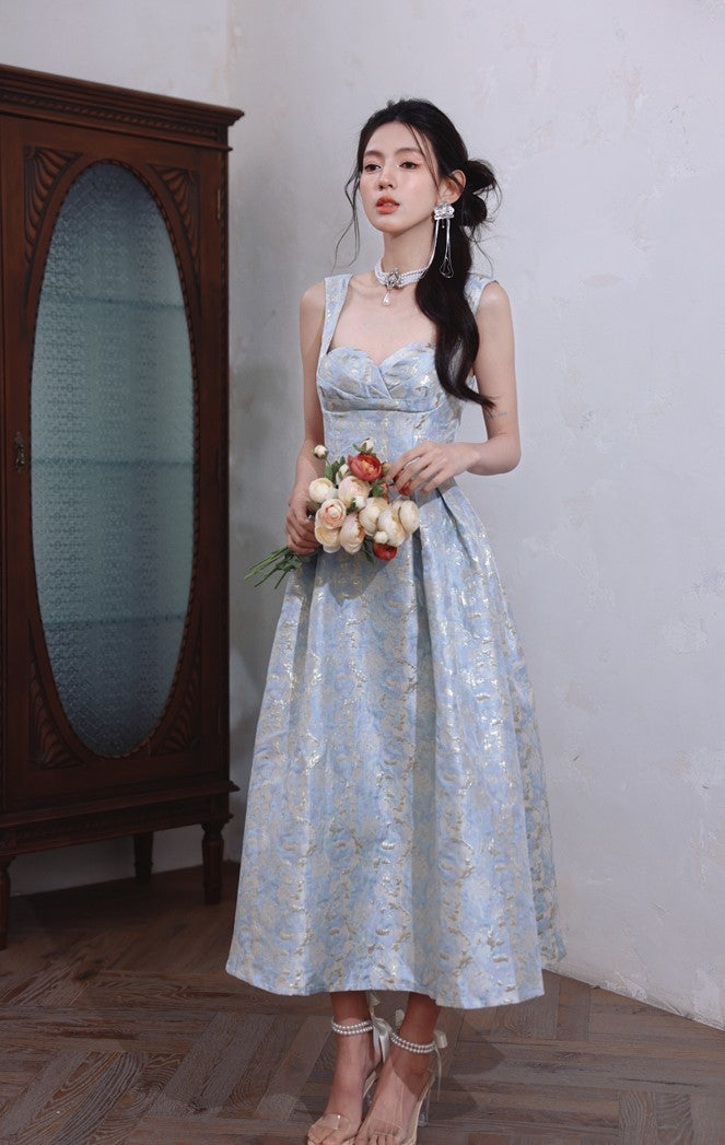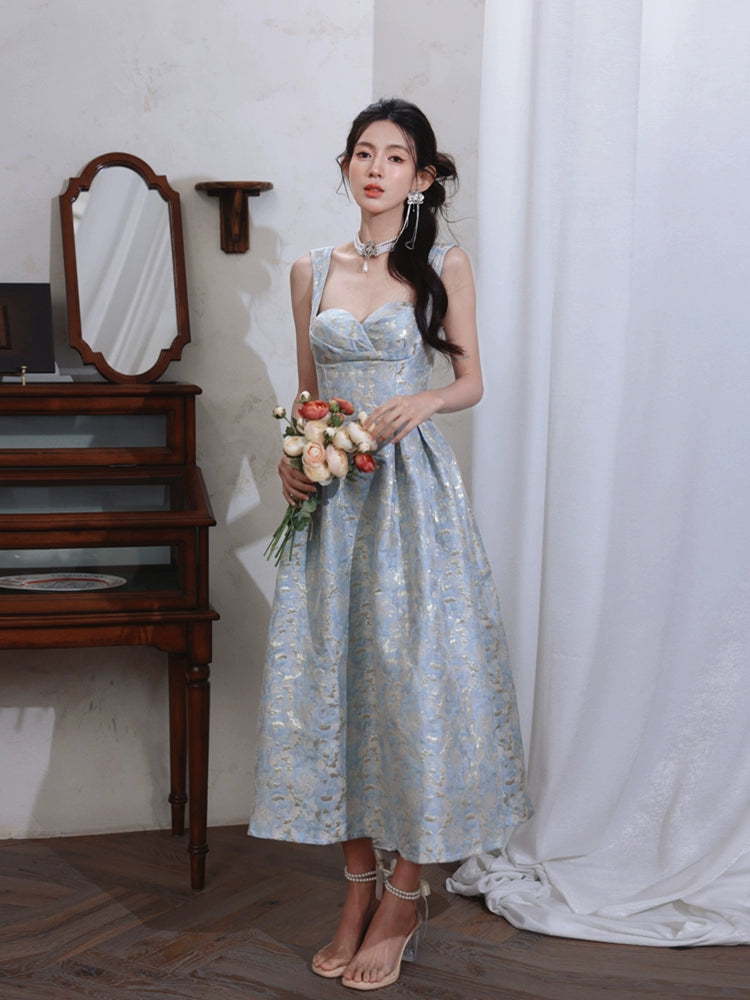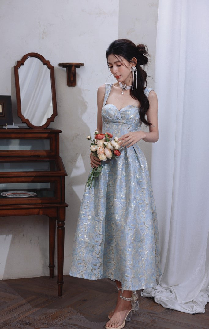 DOLLY Elegant Light Blue French Style High Waist Long A-Line Wedding Dress- (V)