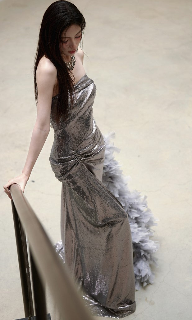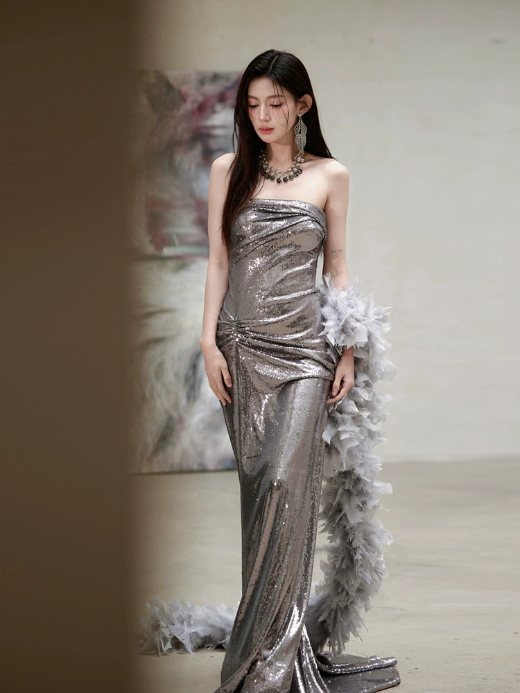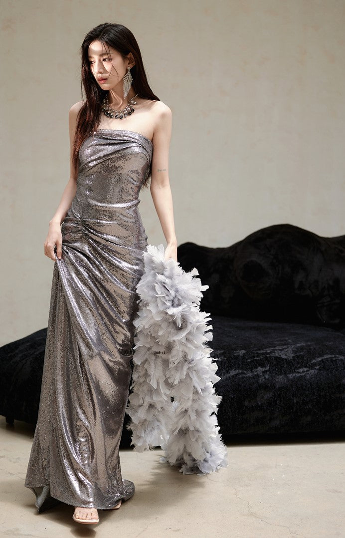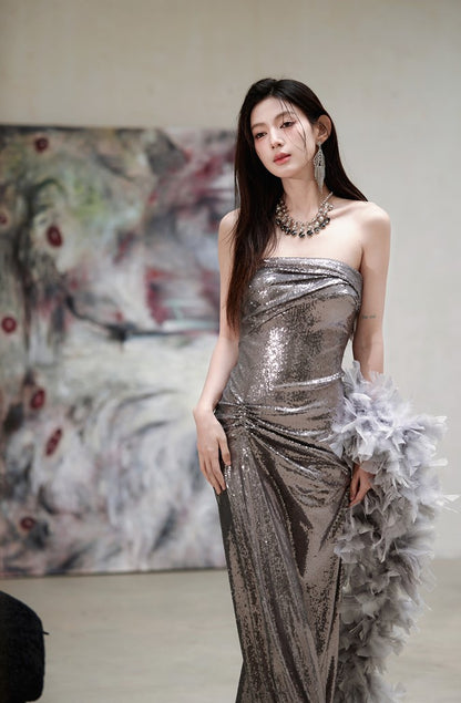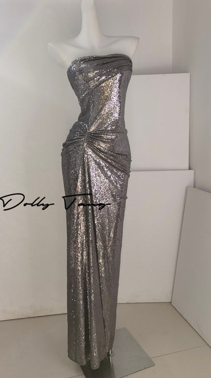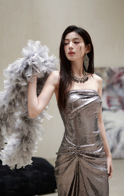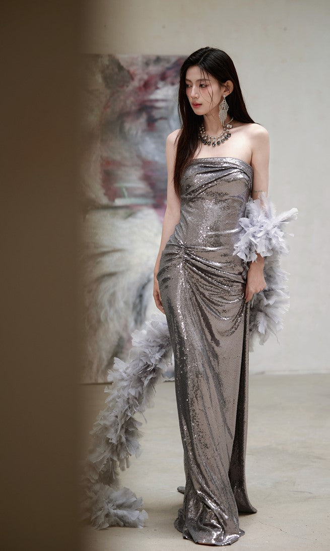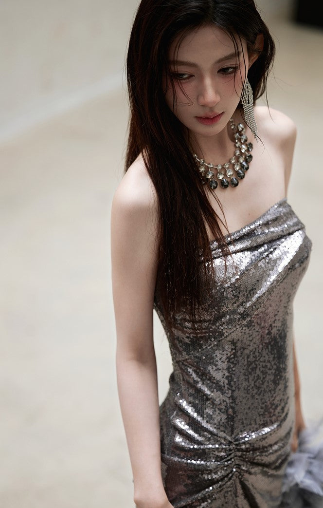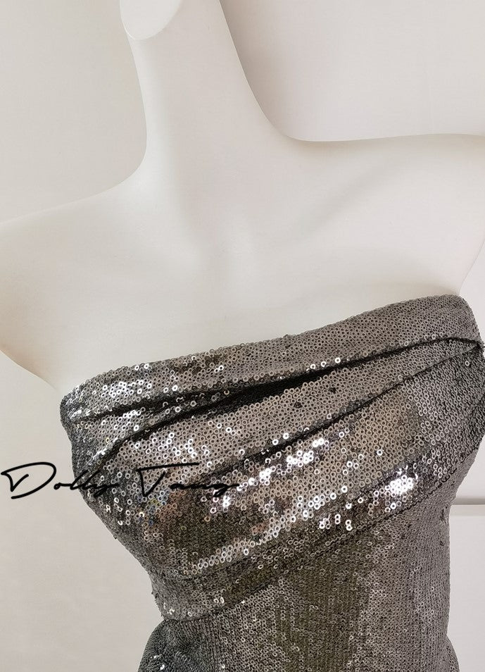 DOLLY Elegant Metallic Gray Sequin Pleated Tube Top-TINA (V)