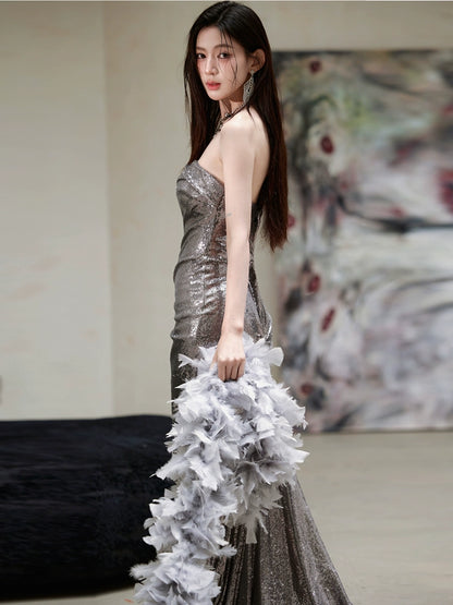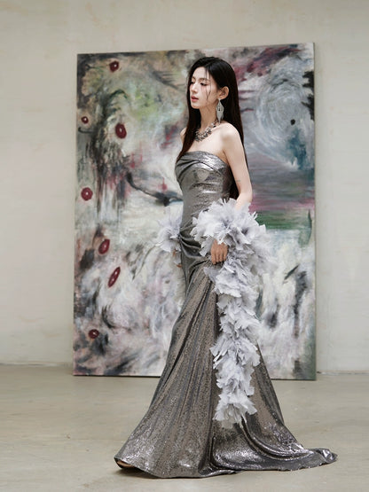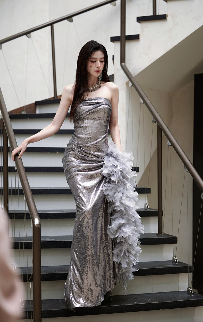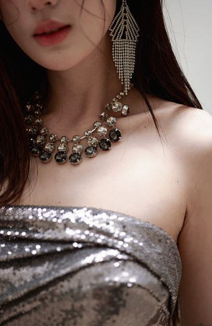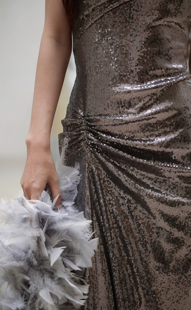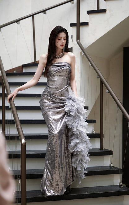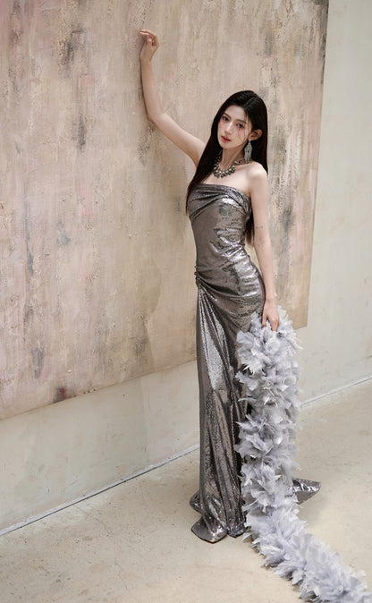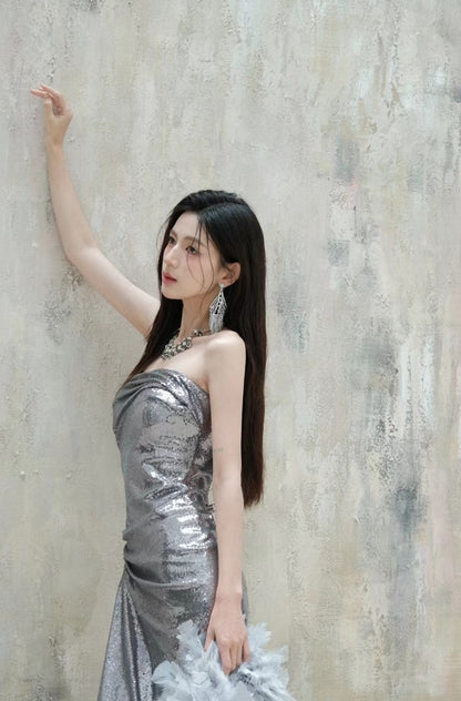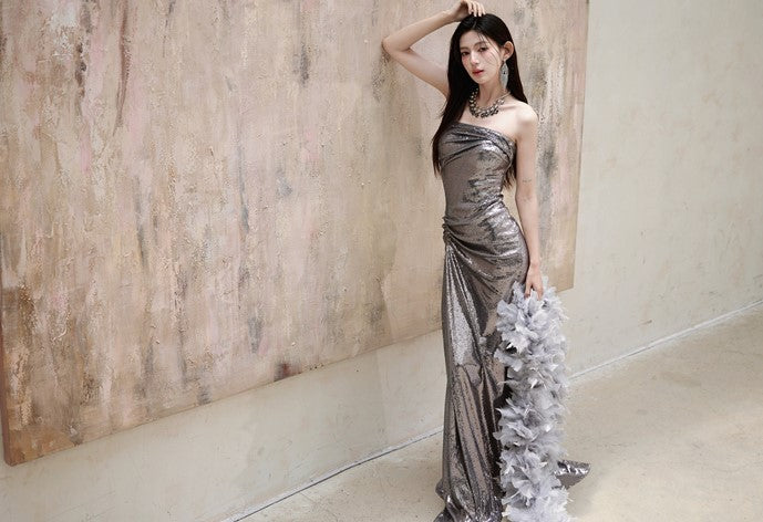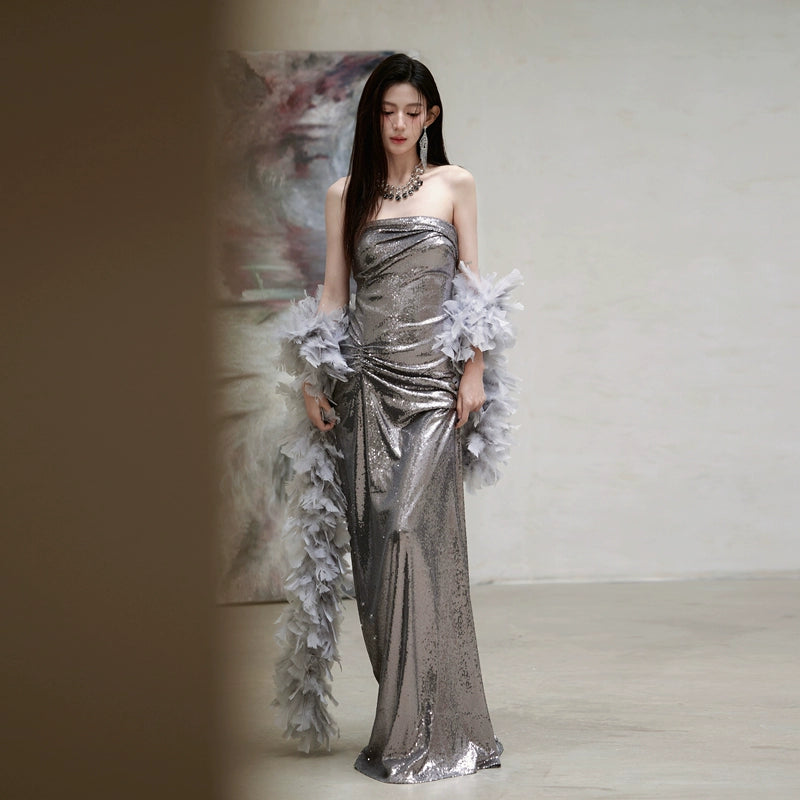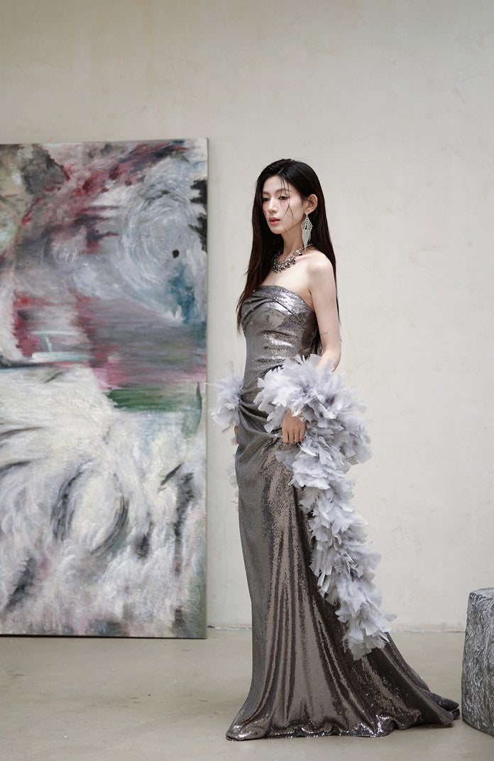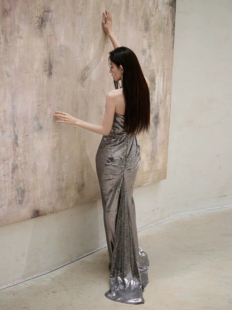 DOLLY Elegant Metallic Gray Sequin Pleated Tube Top-TINA (V)
