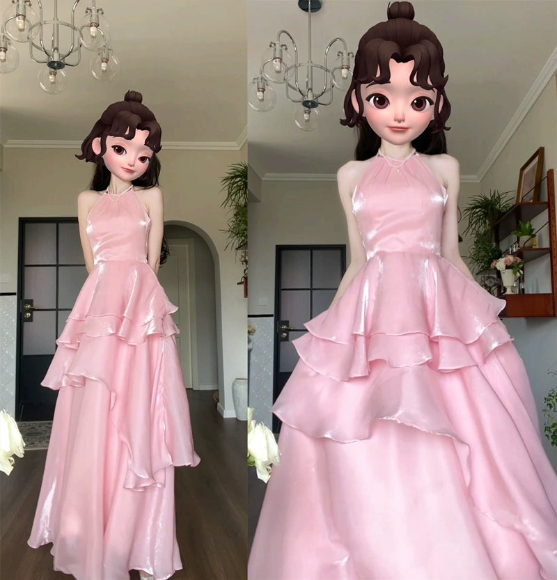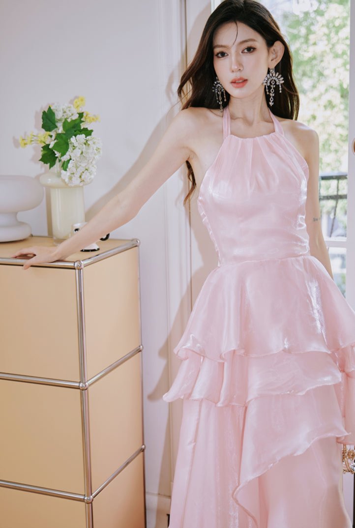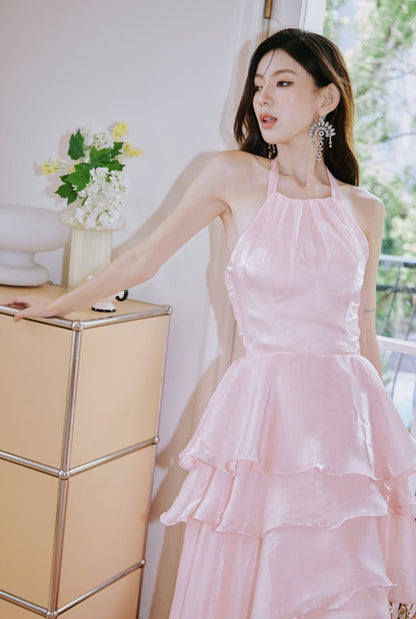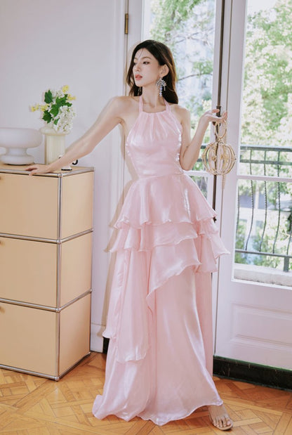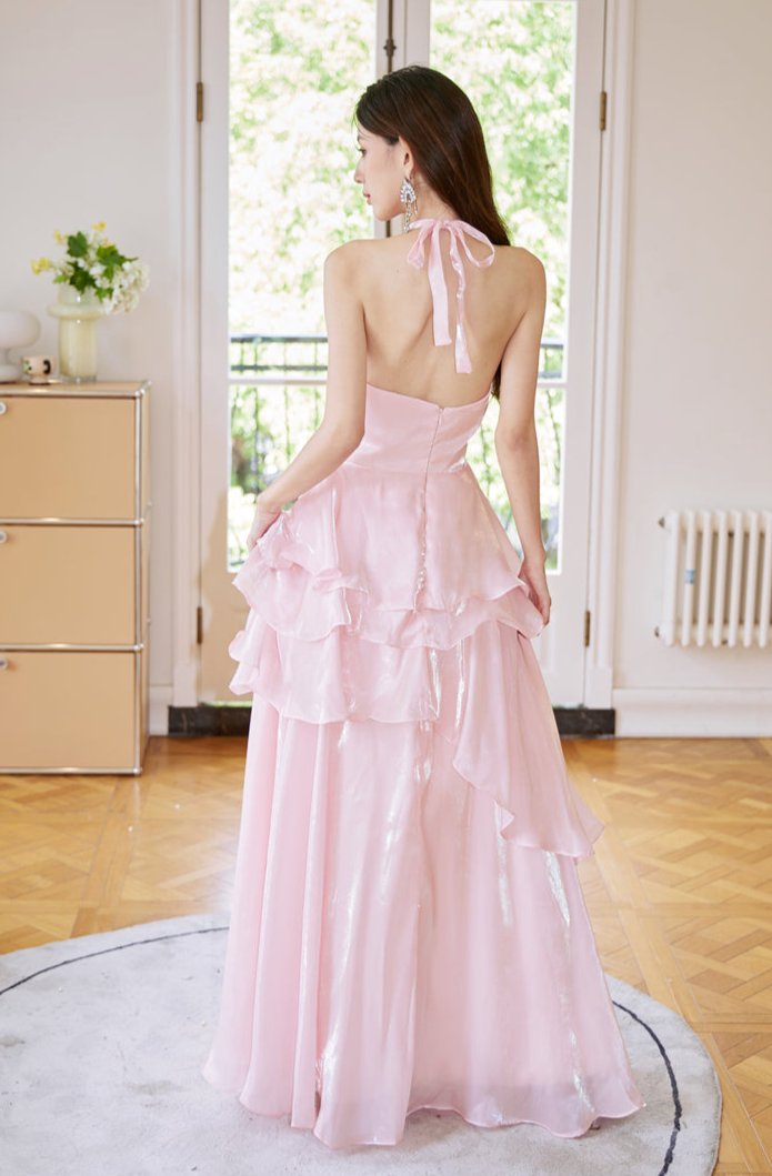 DOLLY Elegant Pink Ruffle Backless Sleeveless Long Halter Neck Banquet Dress-SHANTEL