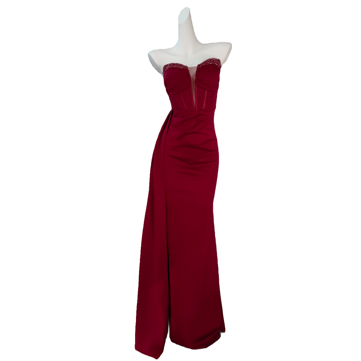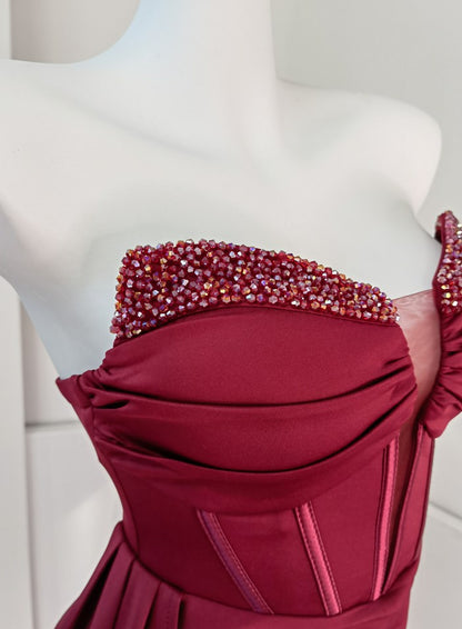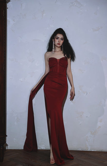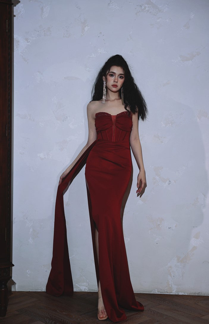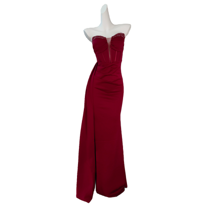 DOLLY Elegant Red Rhinestone Corset Tube Top Long Slit Cocktail Dress-NIKA (V)