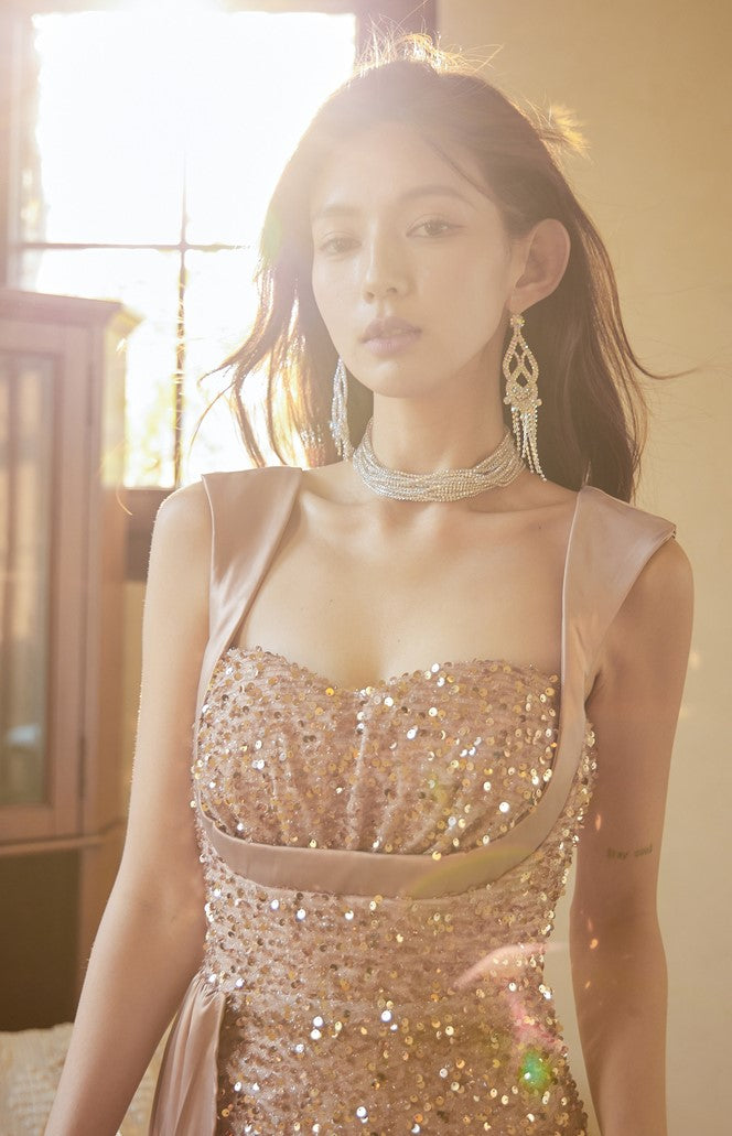 DOLLY Elegant Satin Glittering Sleeveless Stitch Long Fishtail Dress-SALLY