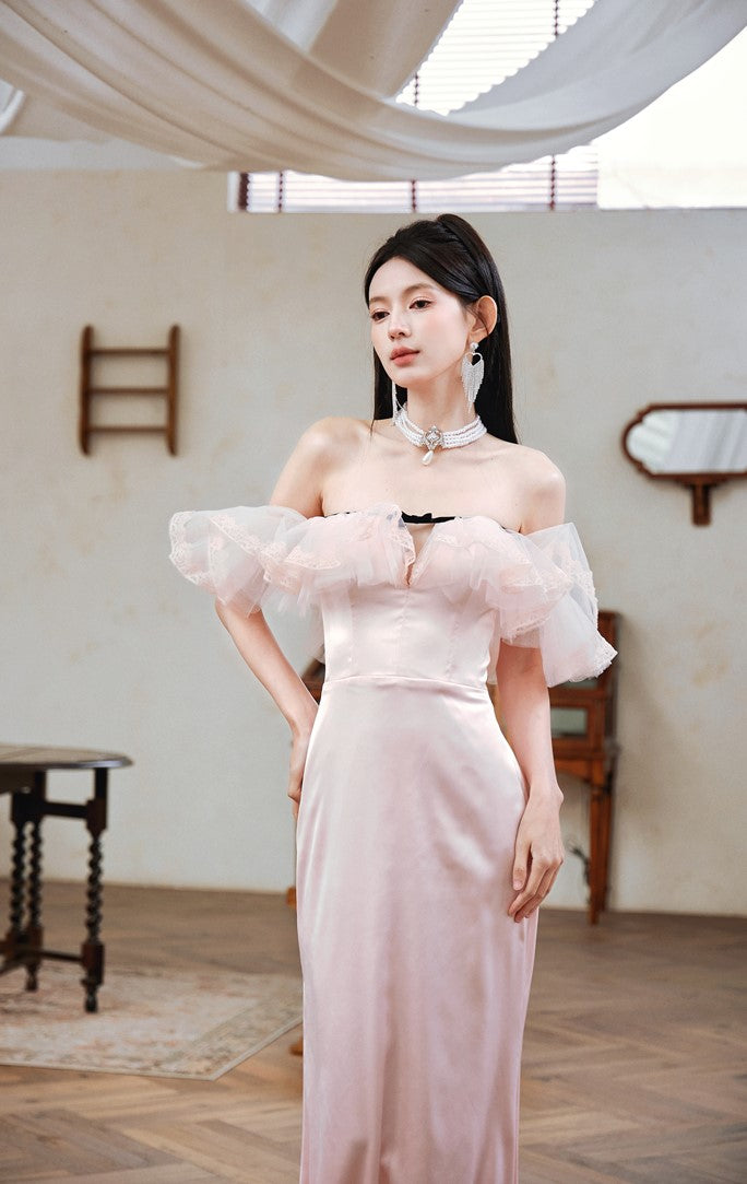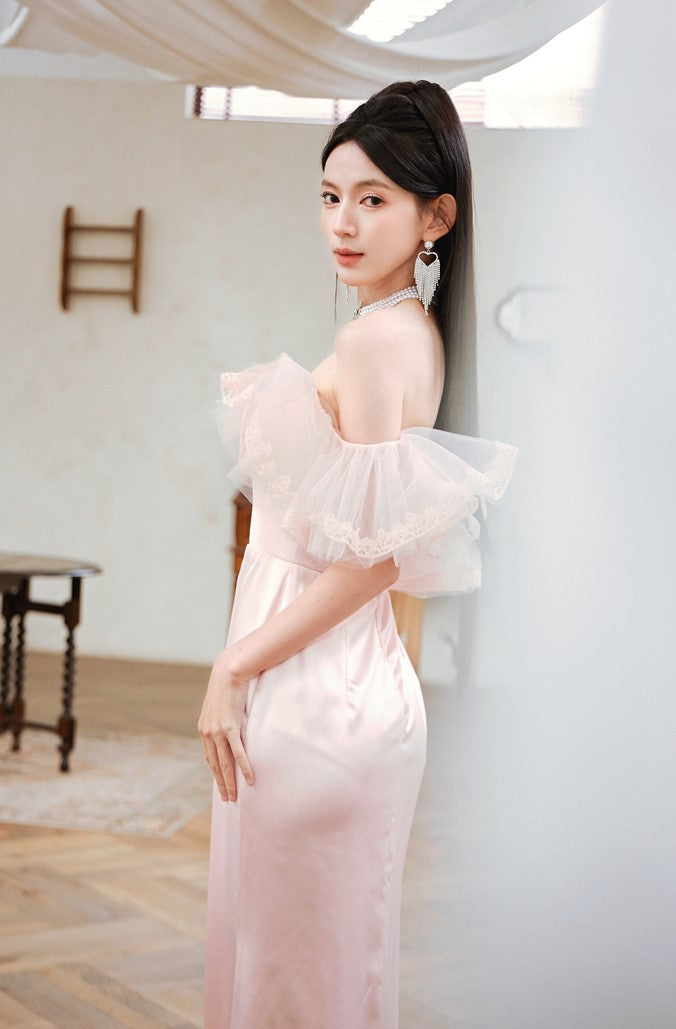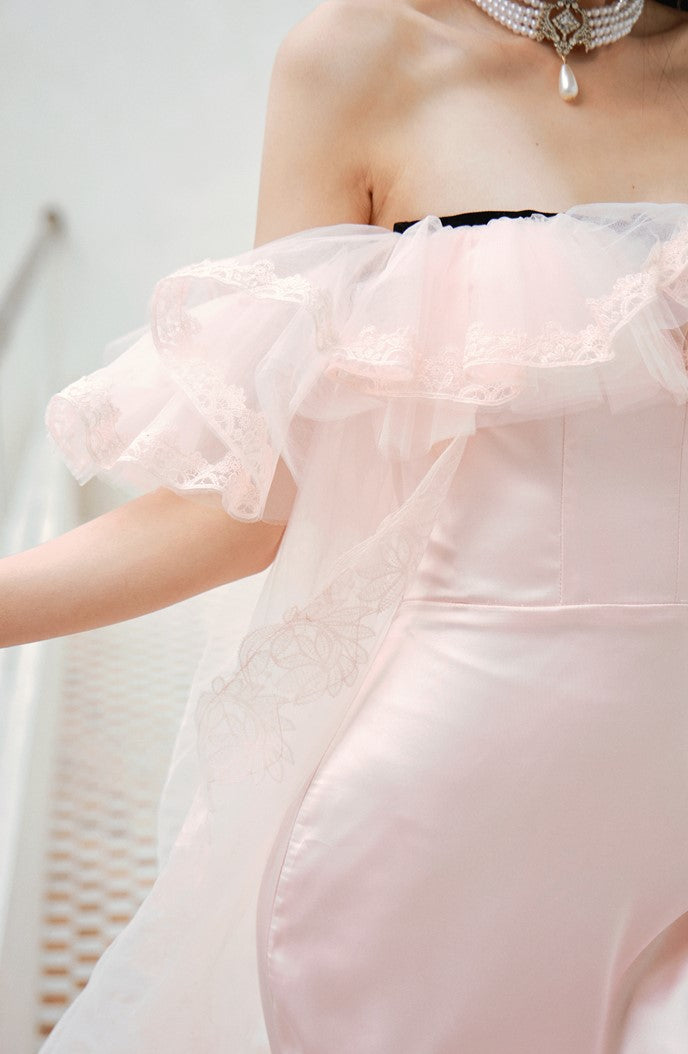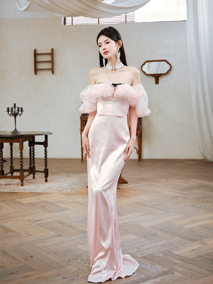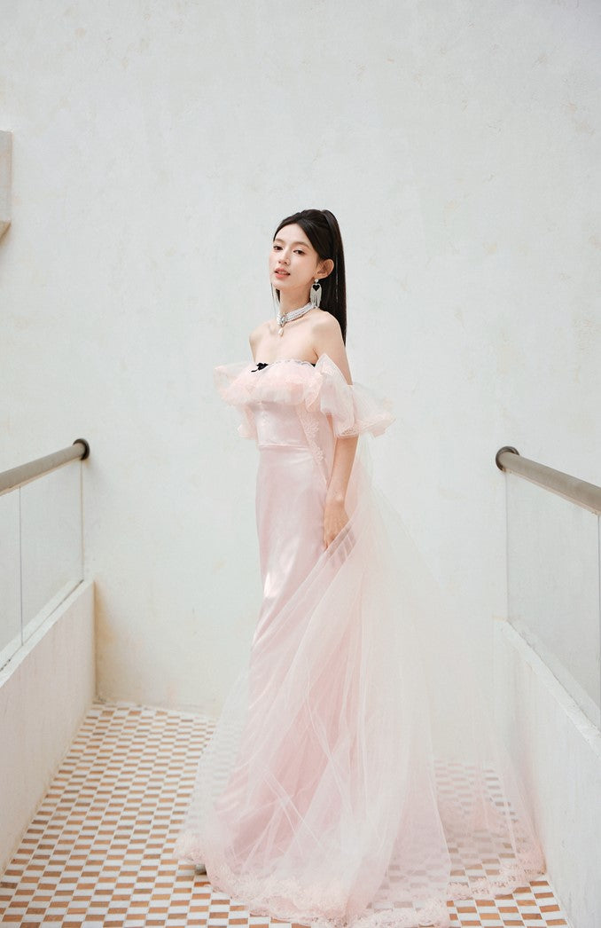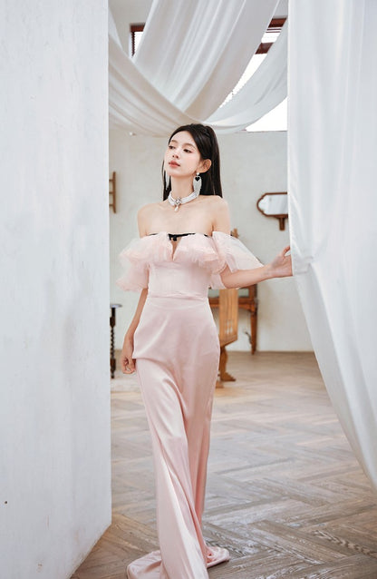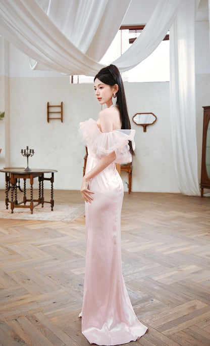 DOLLY Elegant Short Ruffle Sleeves Bandeau High Waist Long Fish Tail Party Dress-JAS (V)