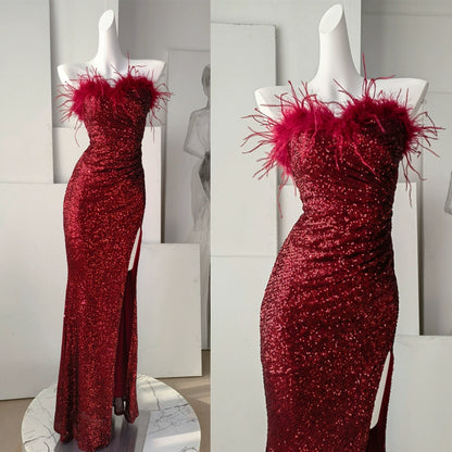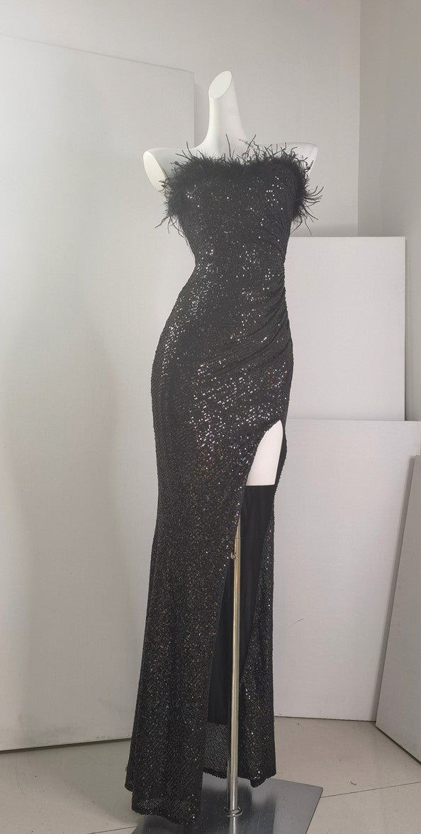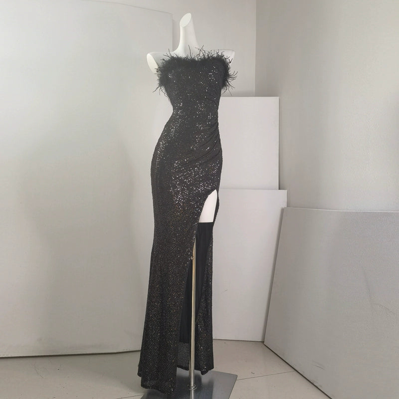 Discover the epitome of elegance and sexiness with the DOLLY Elegant Sliver Feather Sequin Tube To Long Slit Cocktail Dress-REBECCA. This stunning dress features a tube-style design adorned with delicate feathers and sparkling sequins, perfect for any special occasion. With its figure-hugging silhouette and daring slit, you'll feel confident and alluring. Upgrade your wardrobe with this show-stopping dress today.