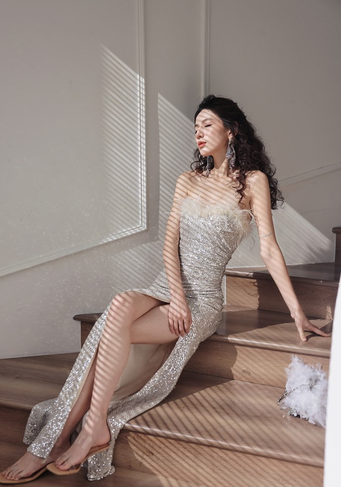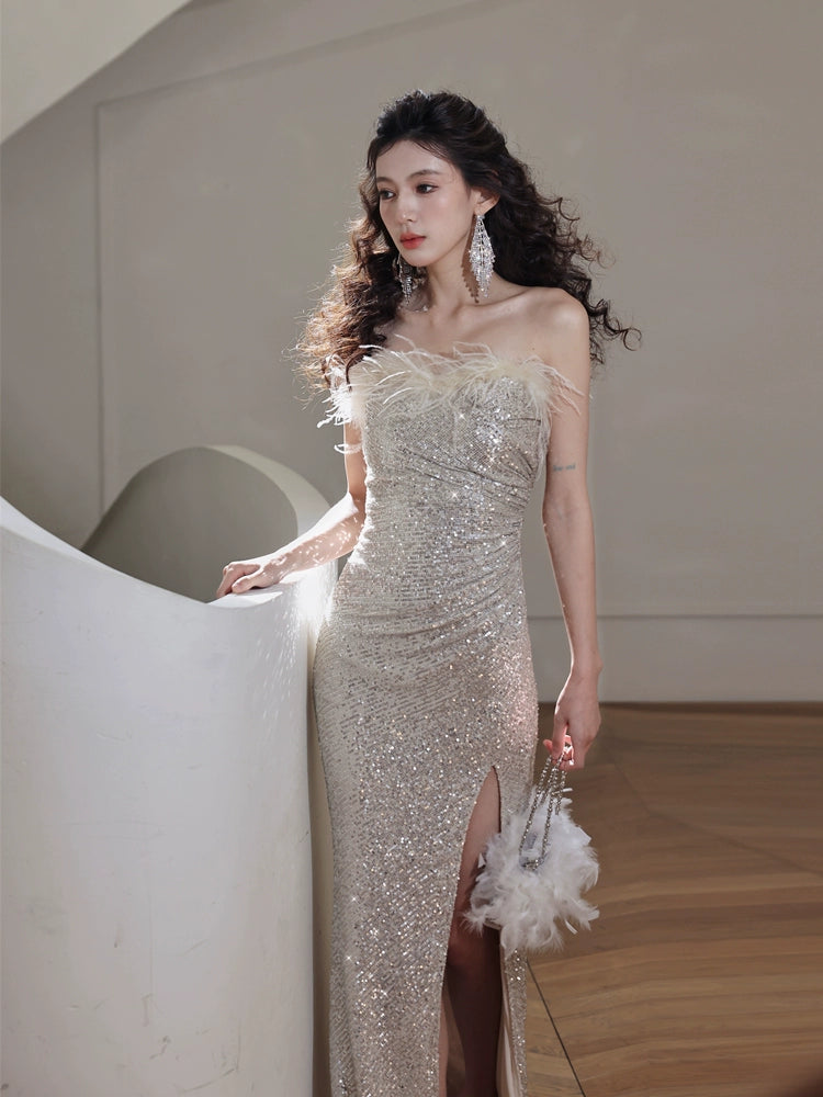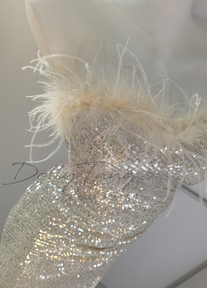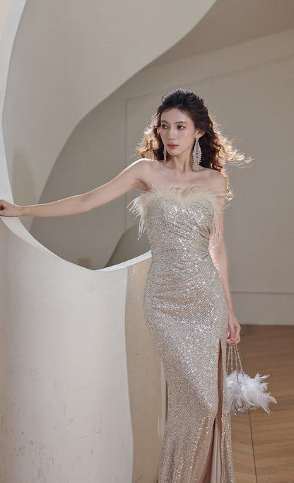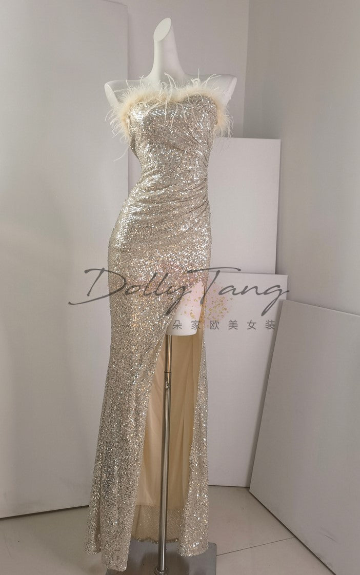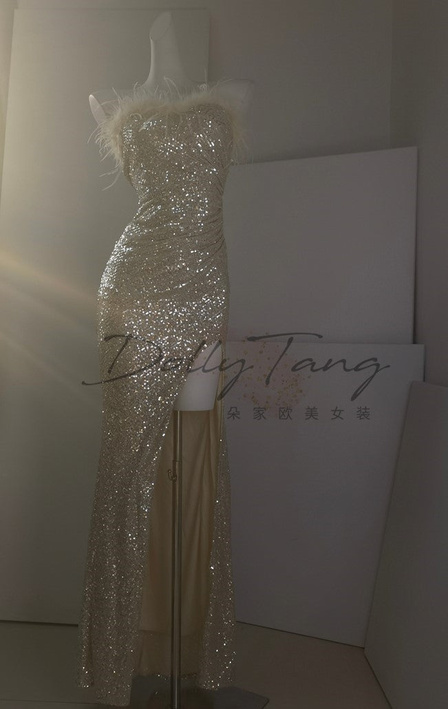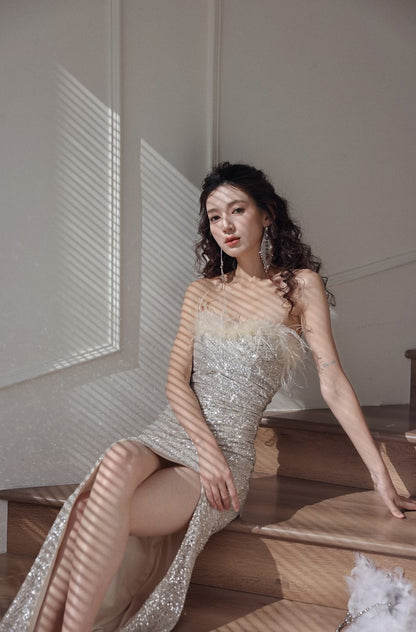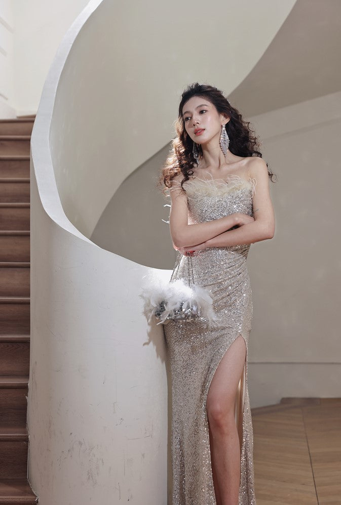 DOLLY Elegant Sliver Feather Sequin Tube To Long Slit Cocktail Dress-REBECCA (V)