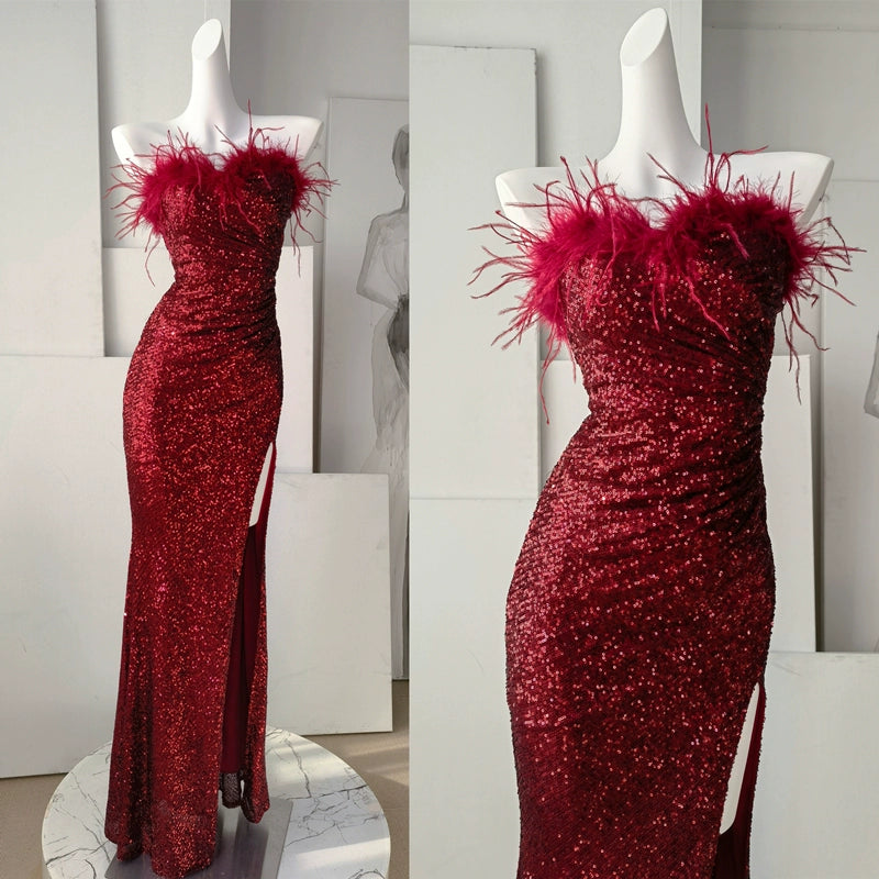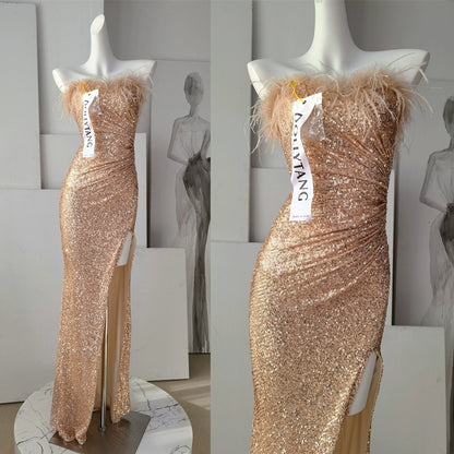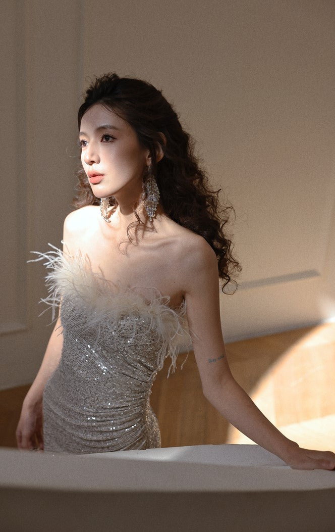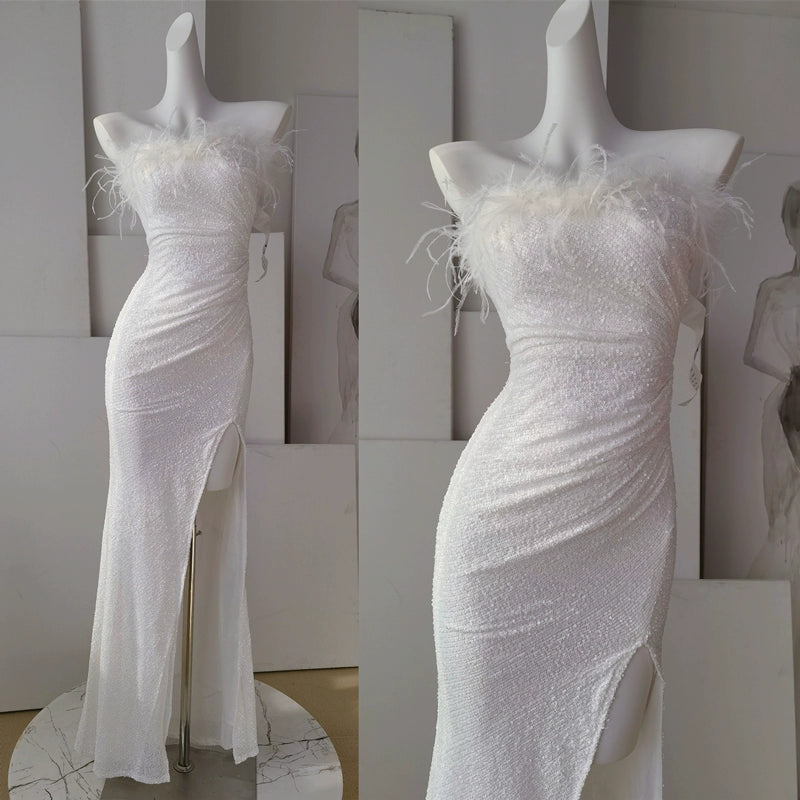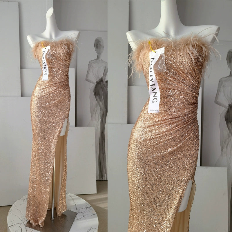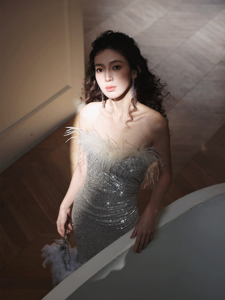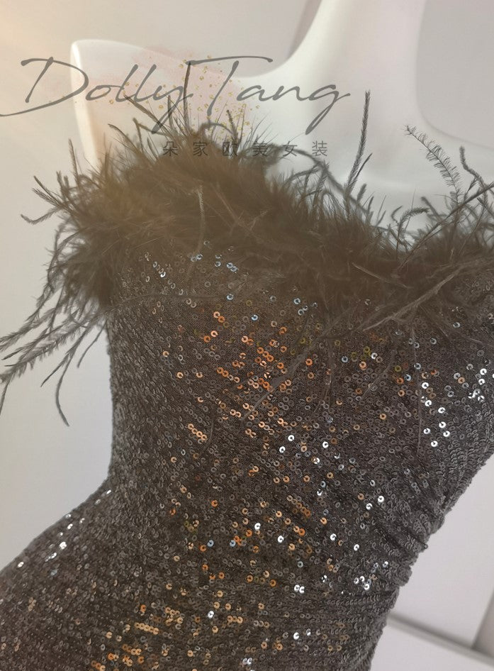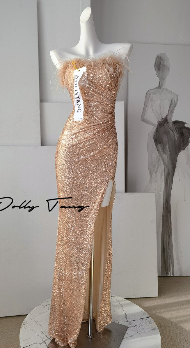 DOLLY Elegant Sliver Feather Sequin Tube To Long Slit Cocktail Dress-REBECCA (V)