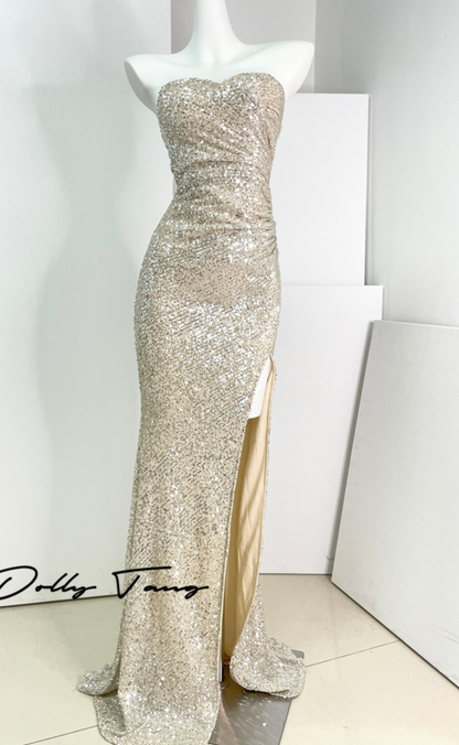 DOLLY Elegant Sparkling Diamond Tube Top Slim Fit Long Slit Cocktail Dress-GIRLE
