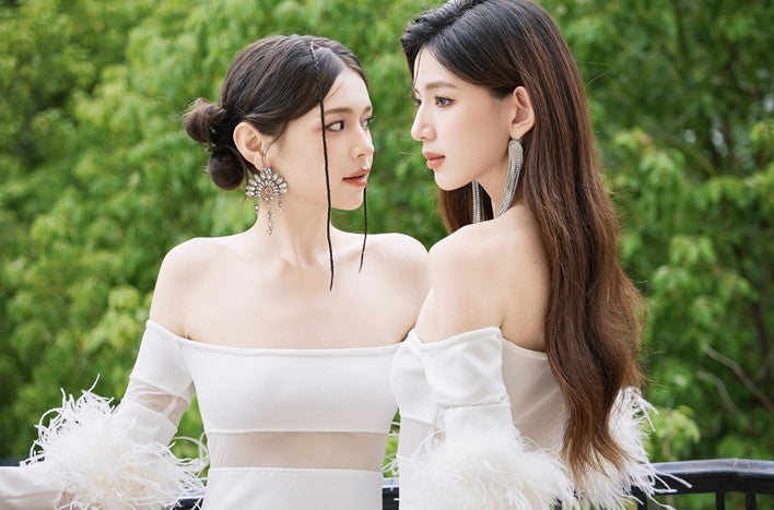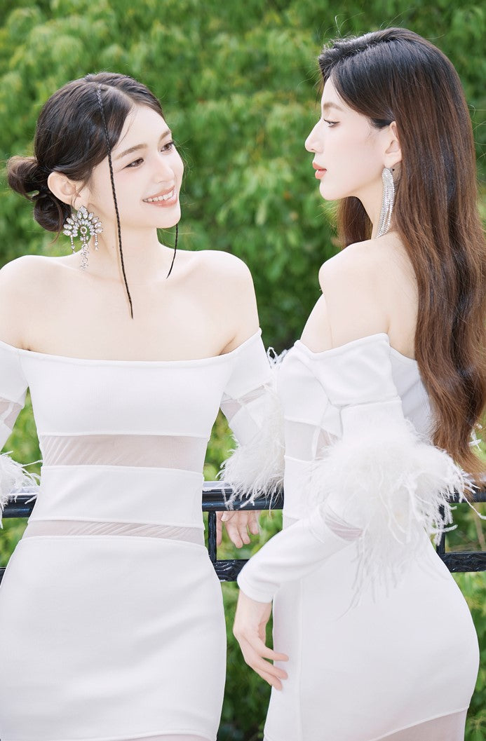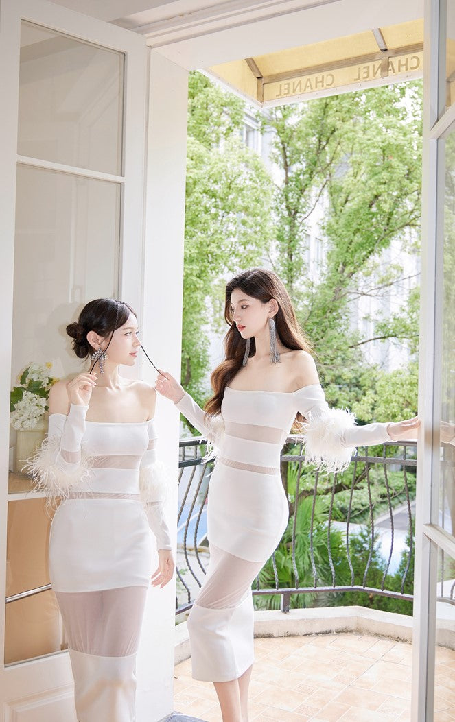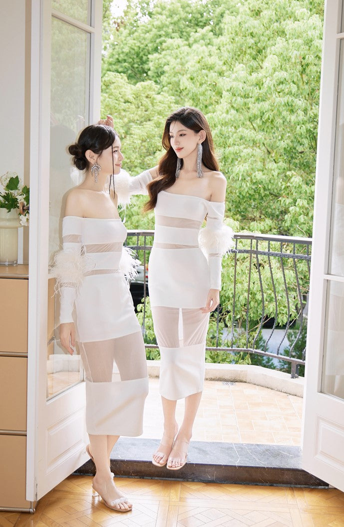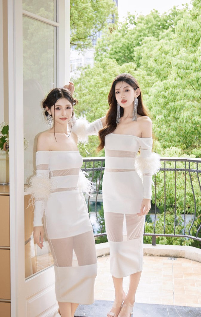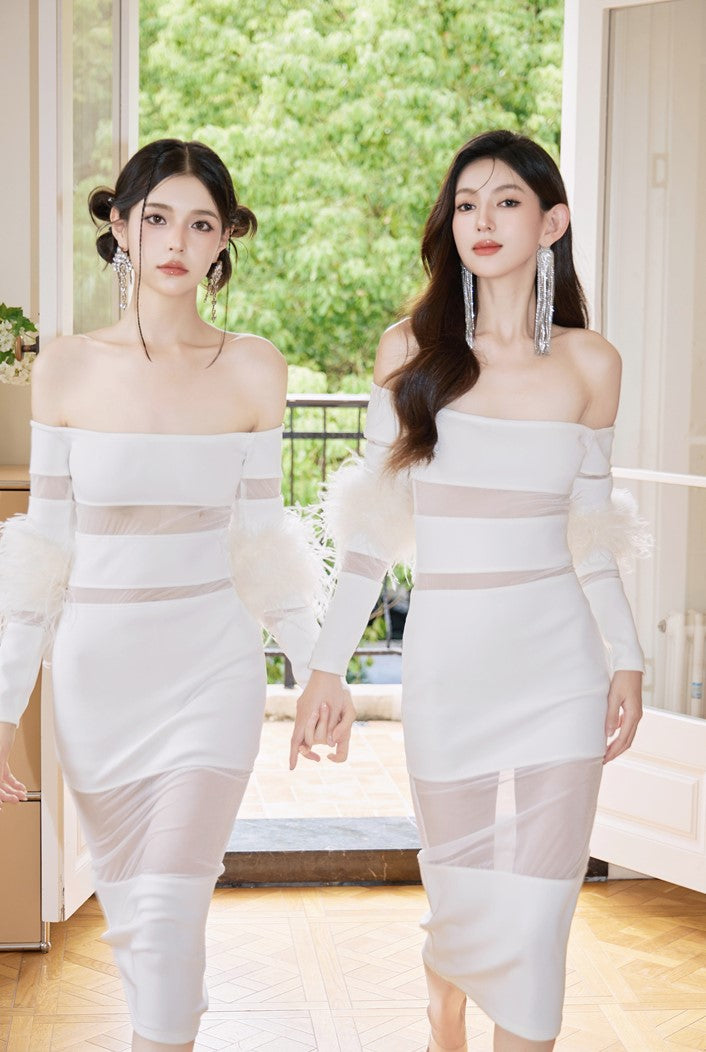 DOLLY Elegant White French Style Off Shoulder Feather Long Sleeves Slim Fit Dress-DAISIES(V)