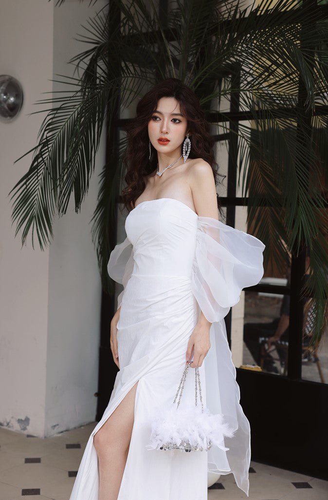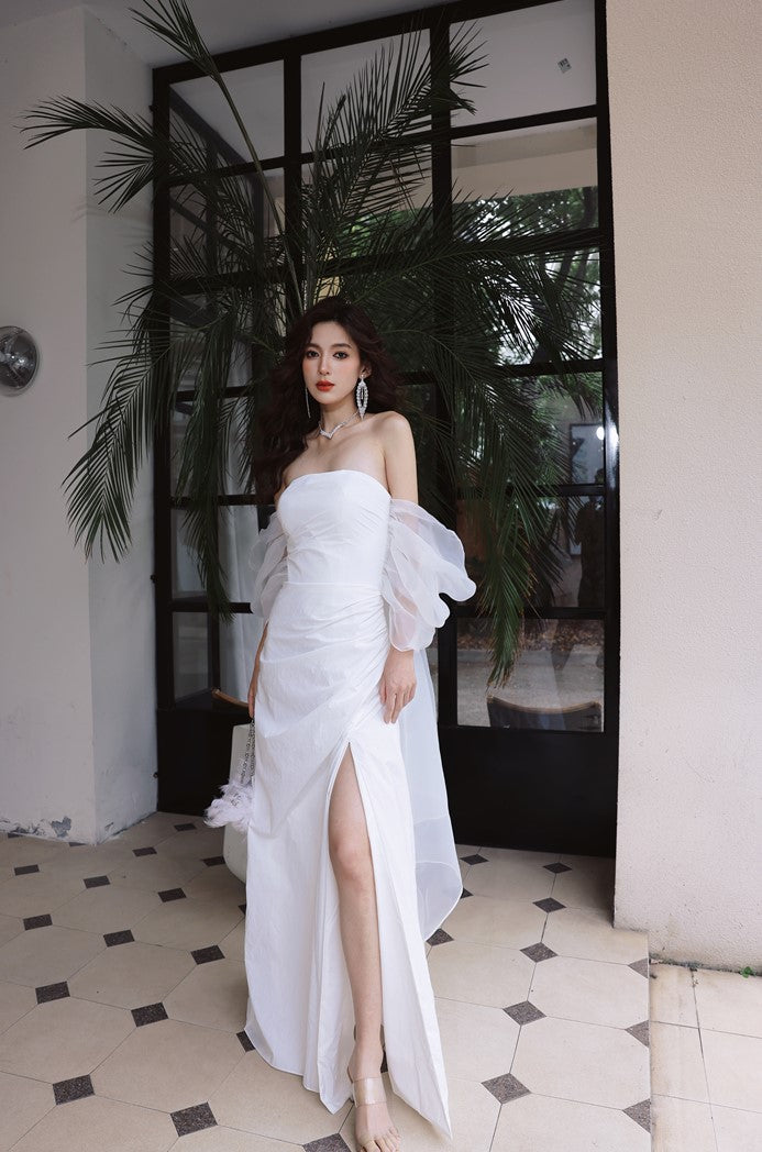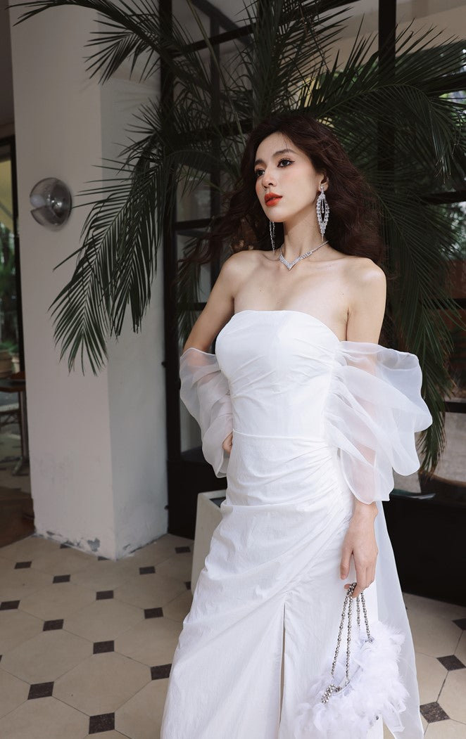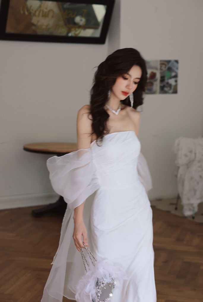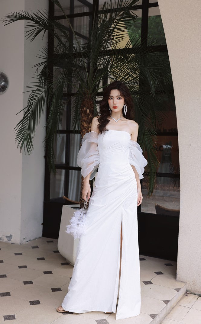 Indulge in luxury with the DOLLY Elegant Wedding Dress. Designed with an off-shoulder neckline and short puff sleeves, this dress exudes elegance. The high waistline highlights your figure while adding a touch of sophistication. Perfect for any bride looking for a luxurious and elegant dress for her special day.