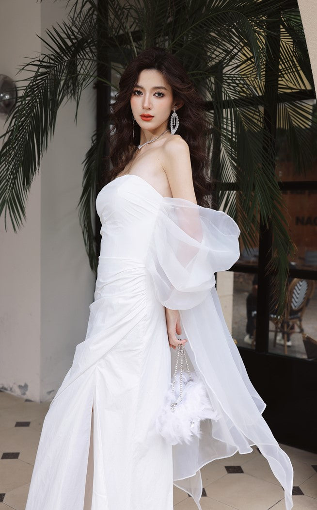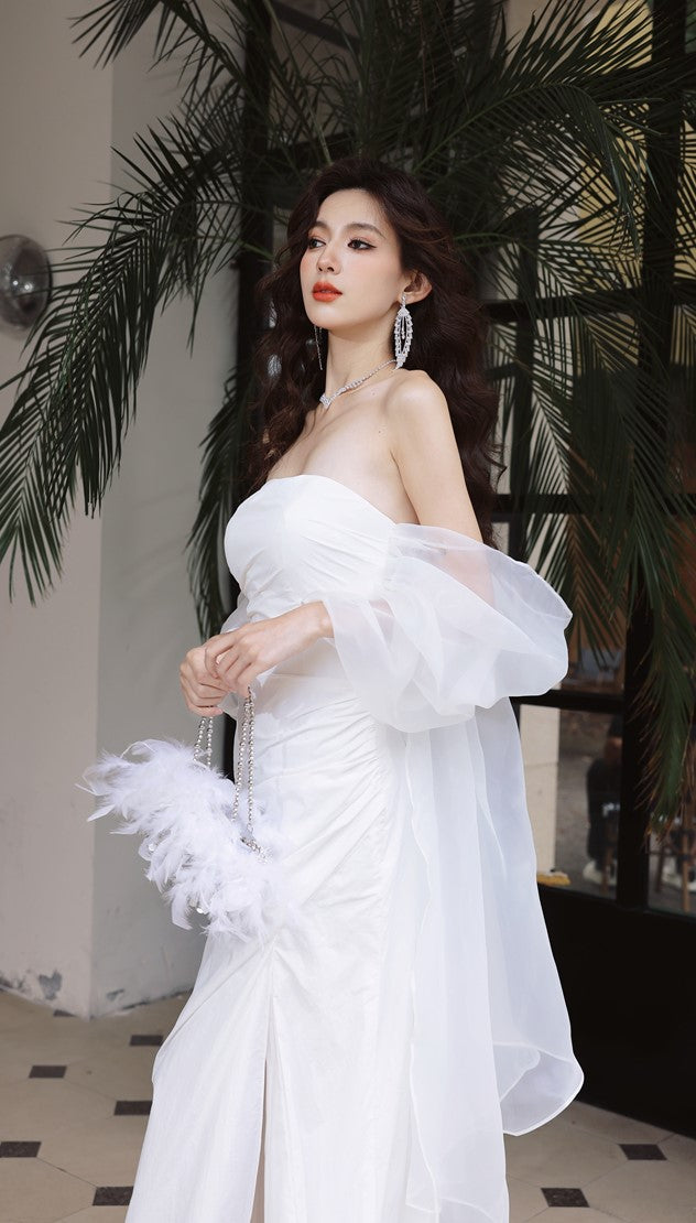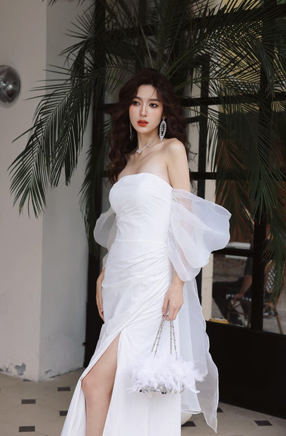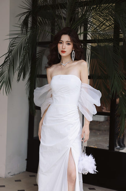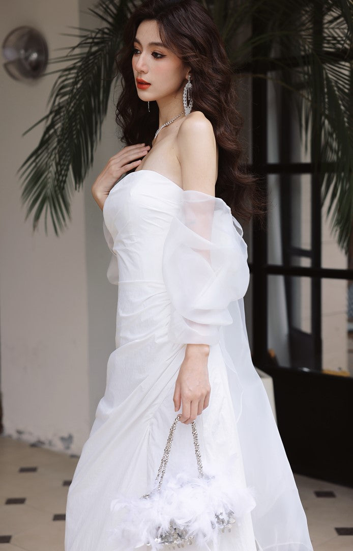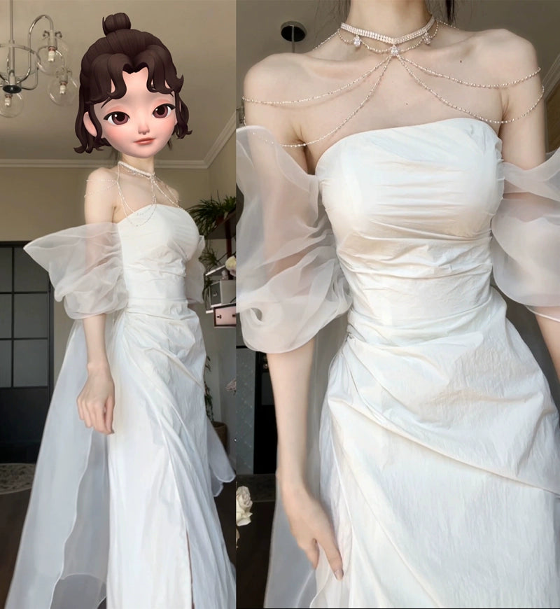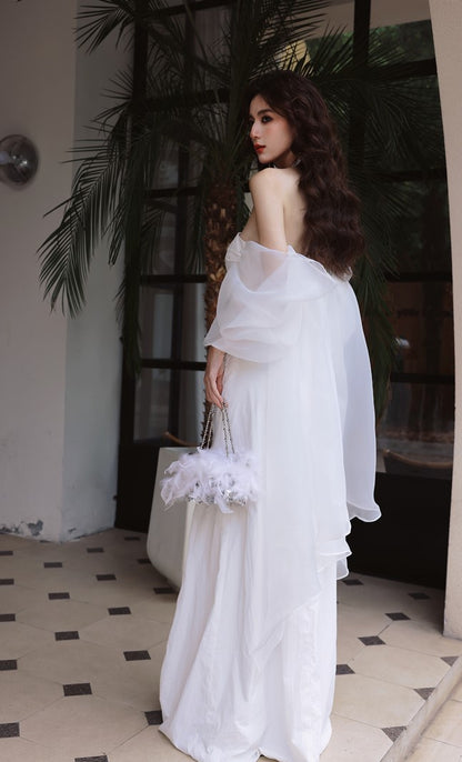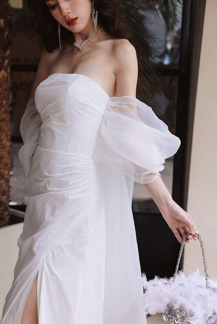 DOLLY Elegant White Off Shoulder Short Puff Sleeve High Waist Wedding Dress-NIKKA