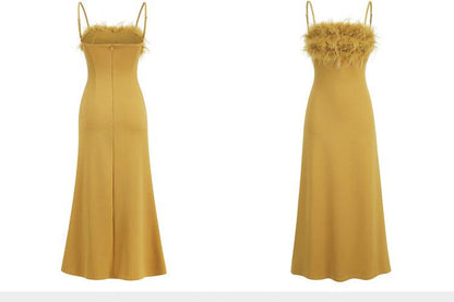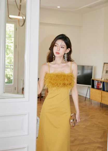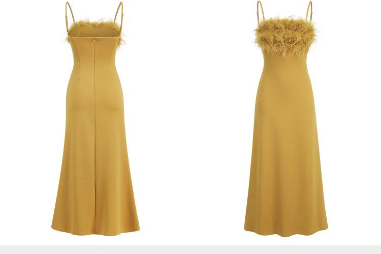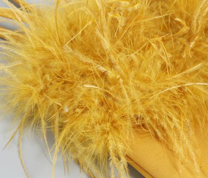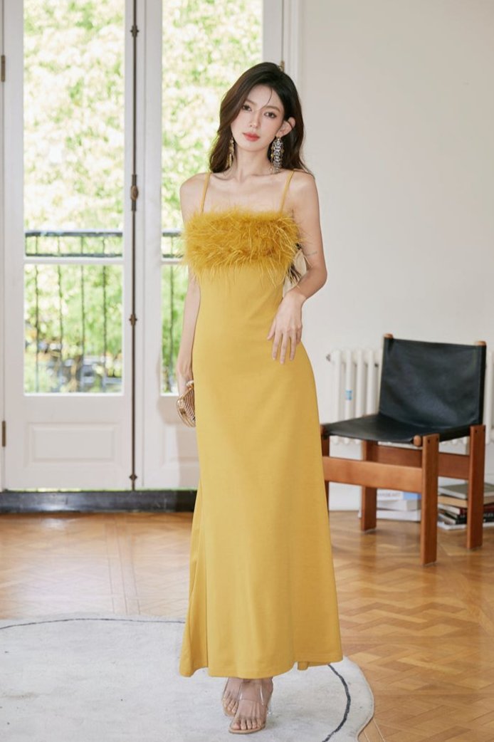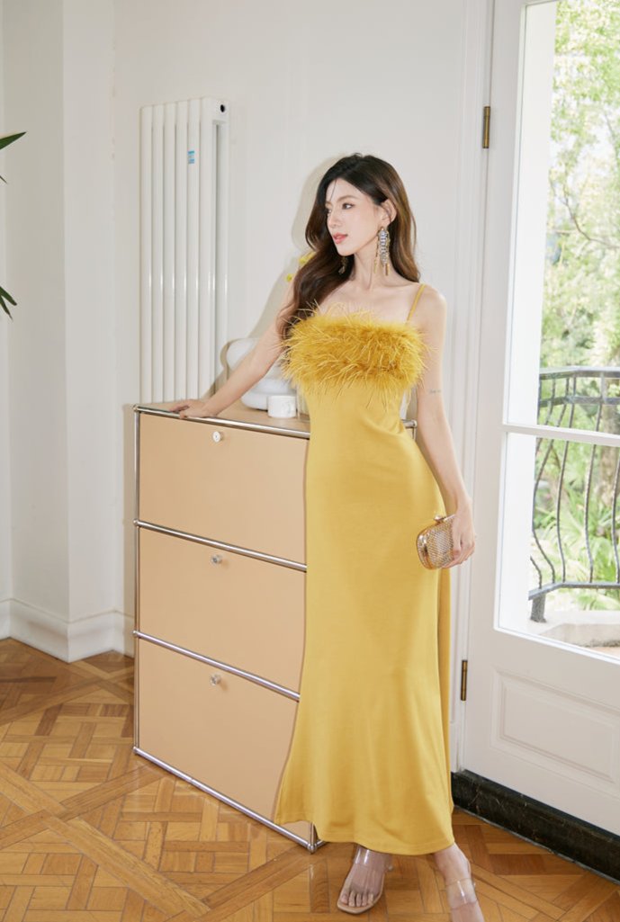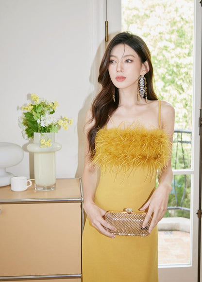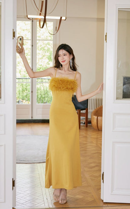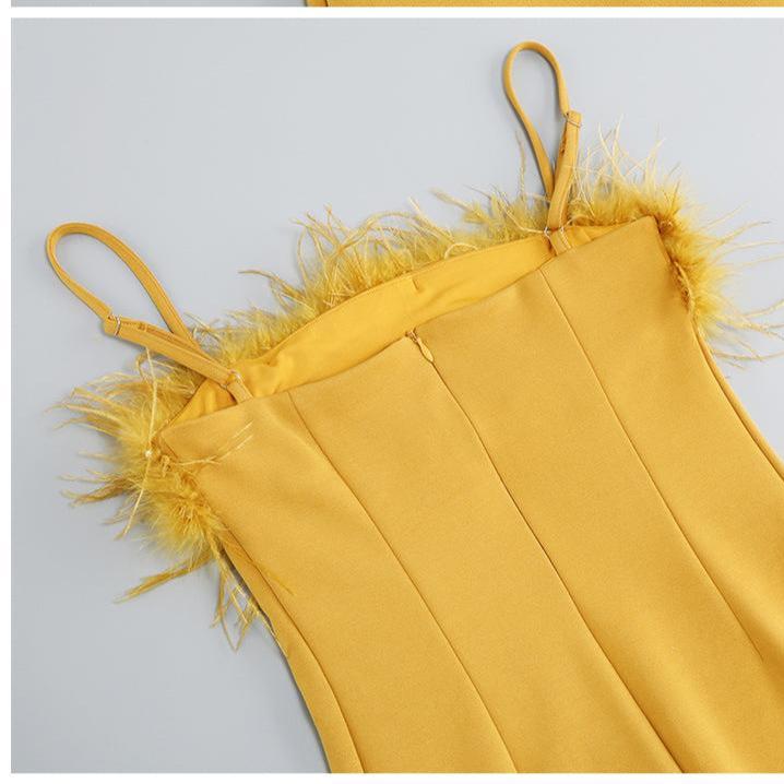 DOLLY Elegant Yellow Feather Tube Top Suspender Long Fish Tail Cocktail Dress-FUFUN