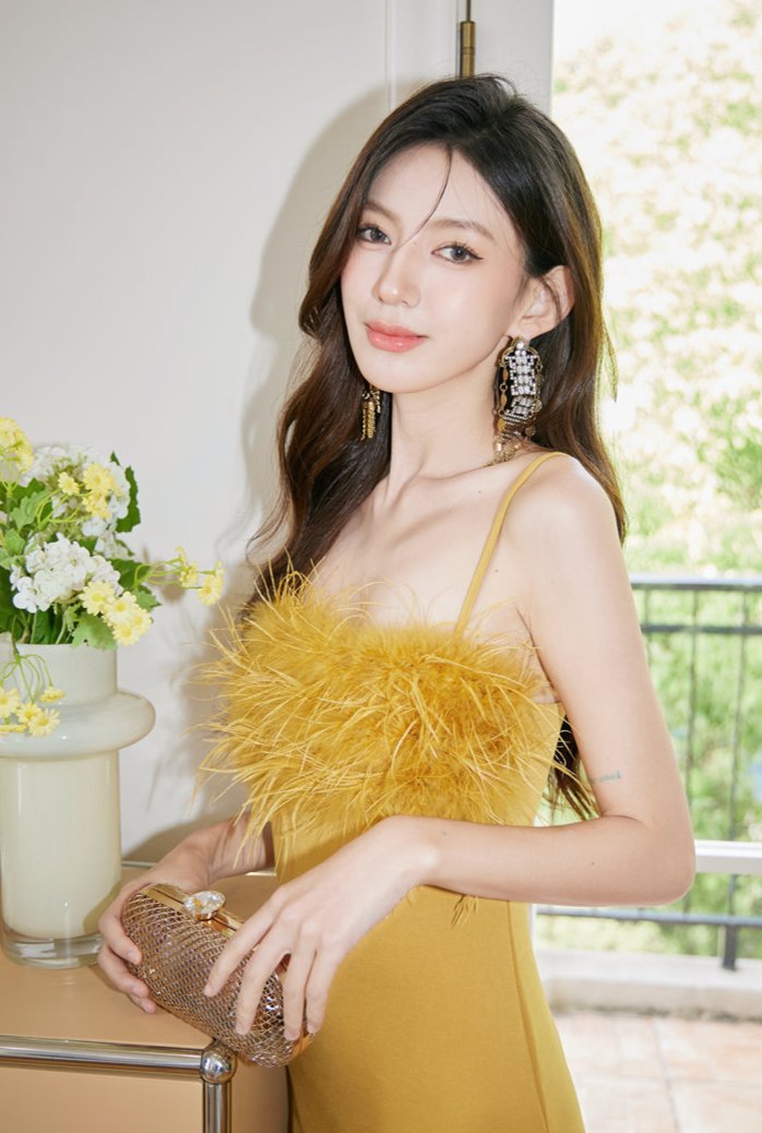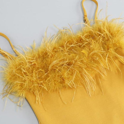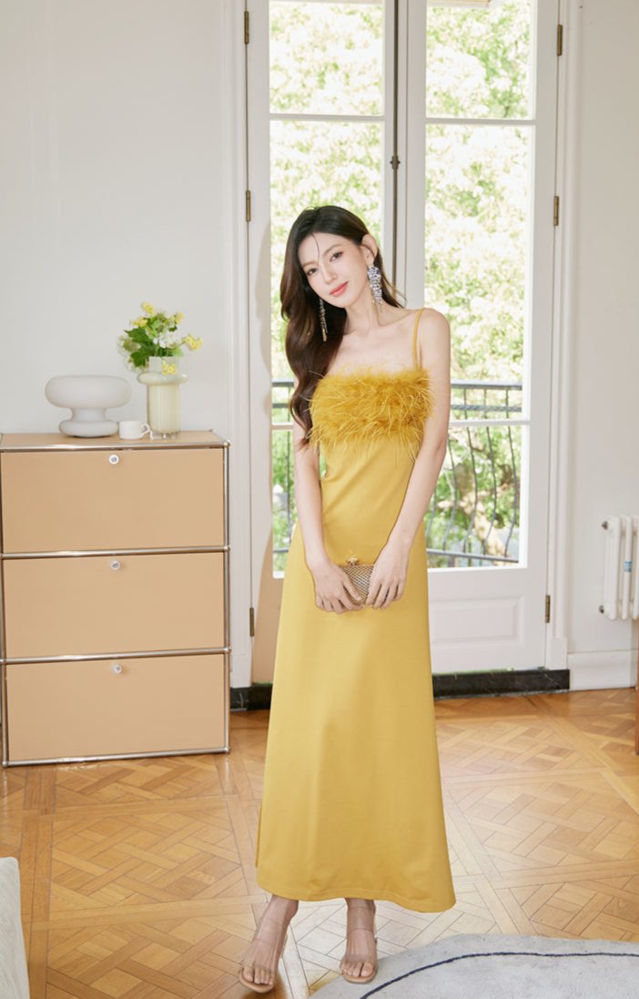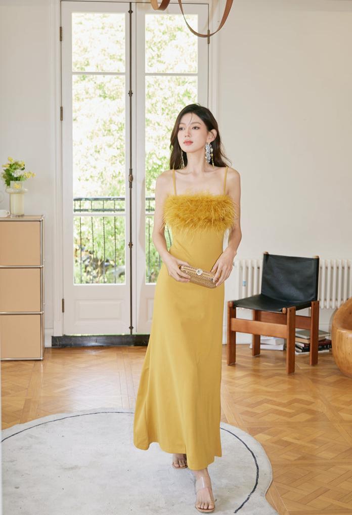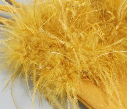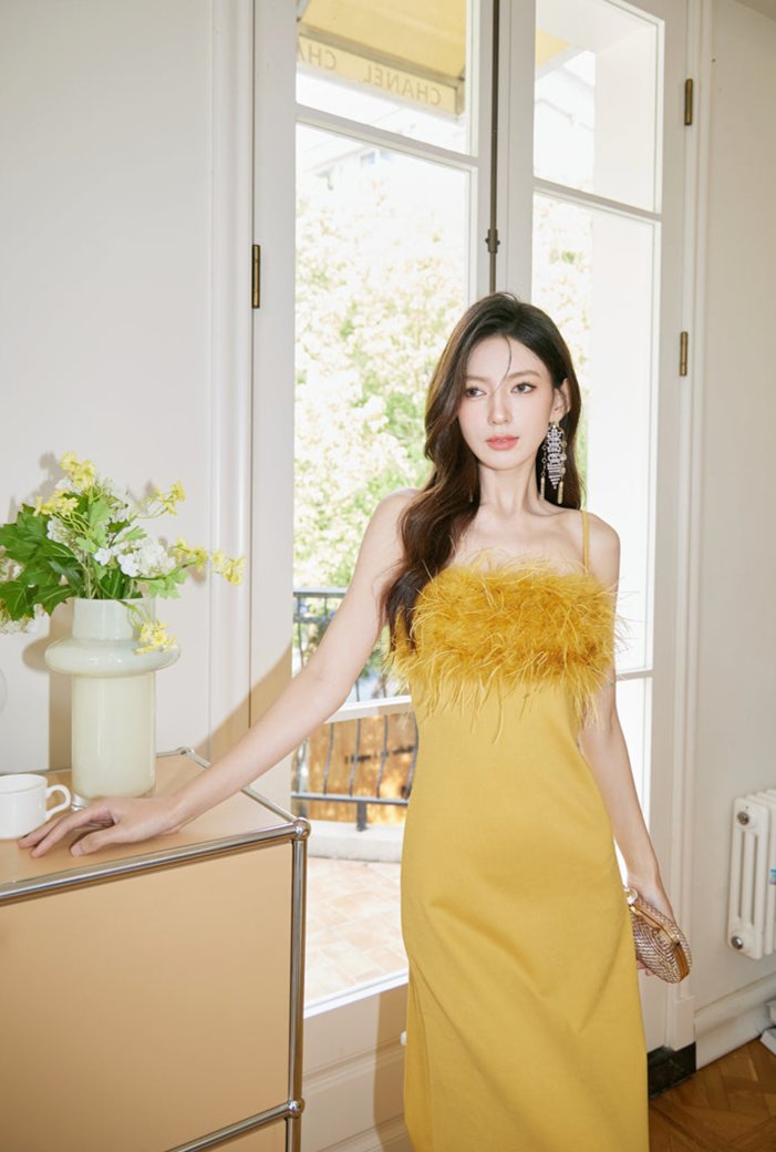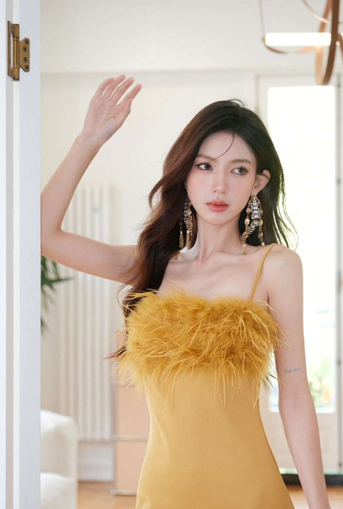 DOLLY Elegant Yellow Feather Tube Top Suspender Long Fish Tail Cocktail Dress-FUFUN