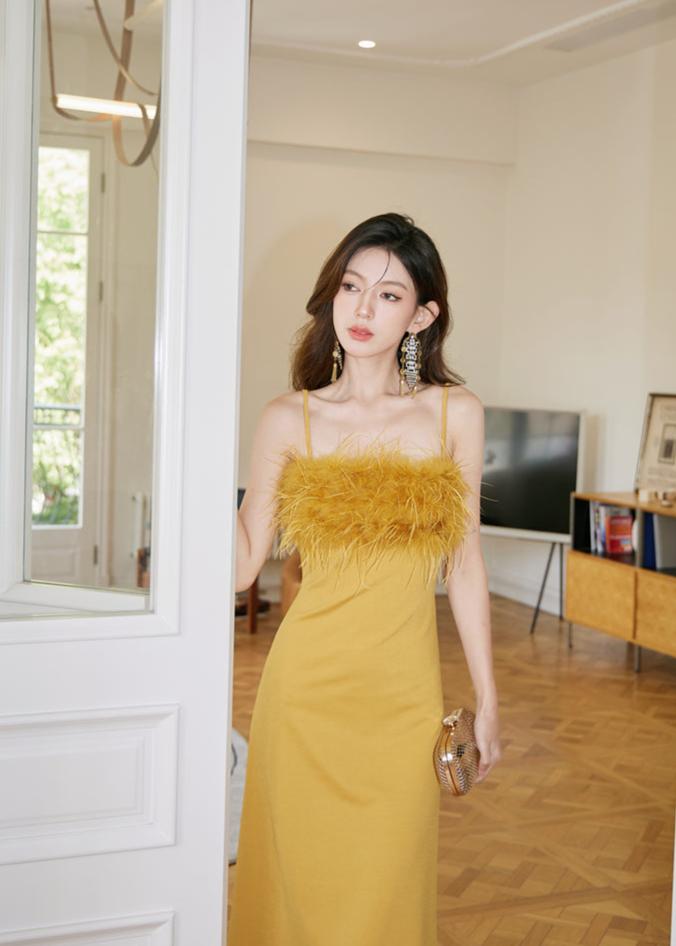 Introducing the ultimate in elegance and sophistication: the DOLLY Elegant Yellow Feather Tube Top Suspender Long Fish Tail Cocktail Dress. Featuring a stunning tube top design and delicate feather detailing, this dress is perfect for special occasions and will make you feel like the most exclusive member of the room.