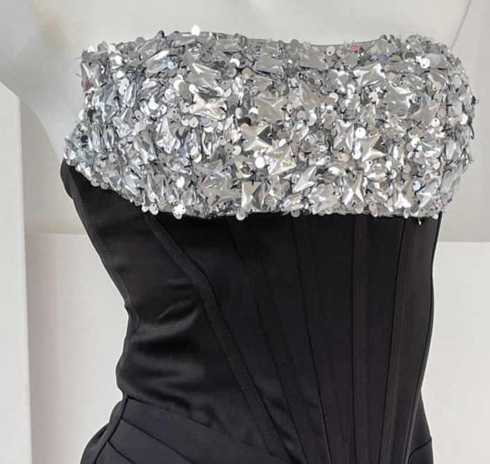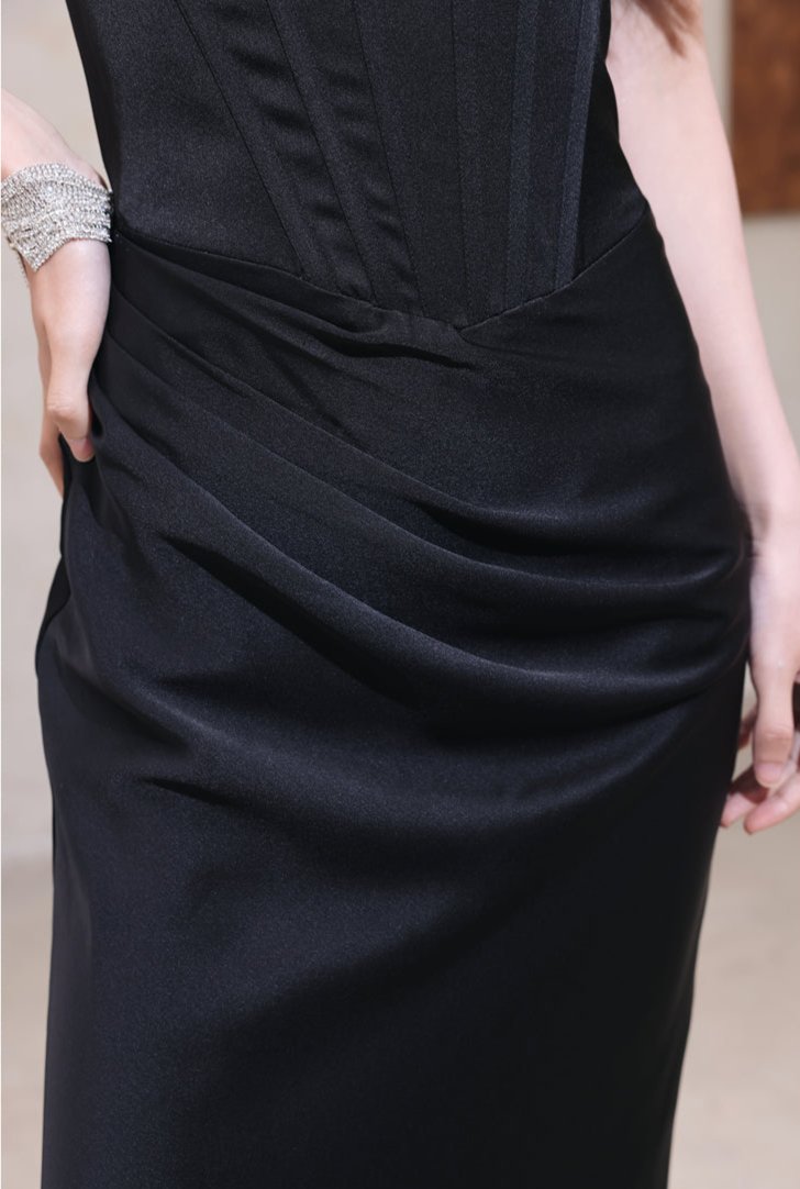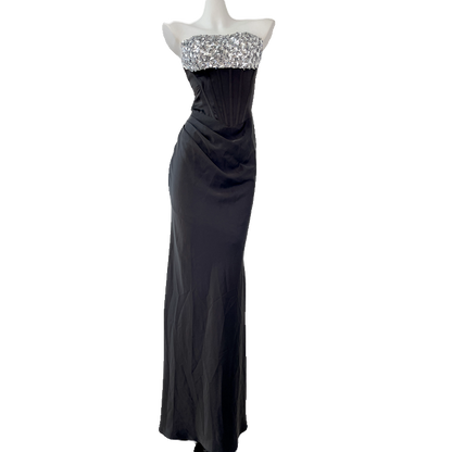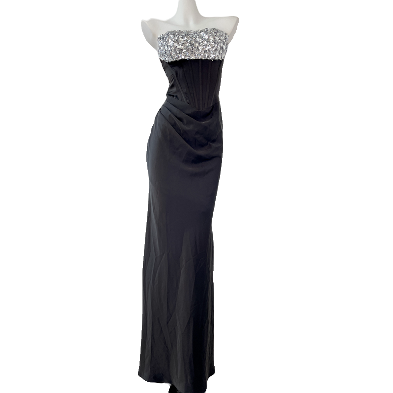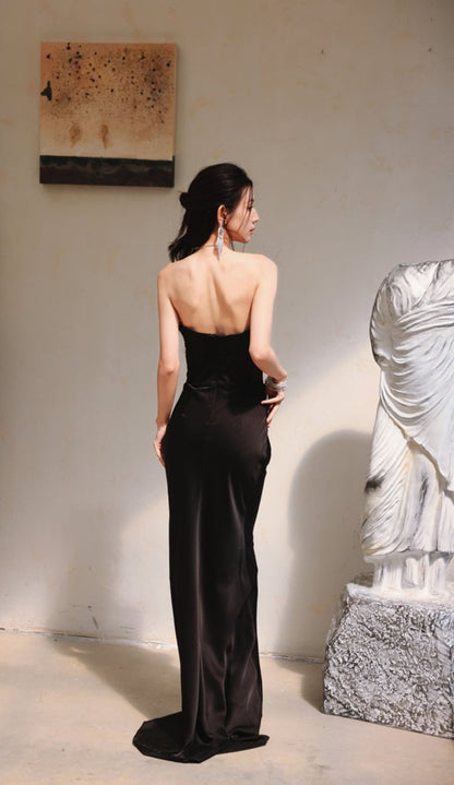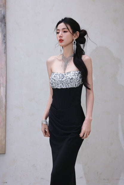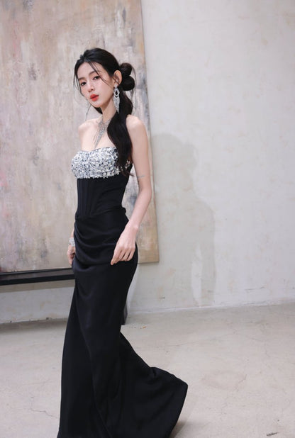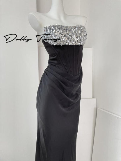 DOLLY High End Black Rhinestone Bandeau Long Pleated Cocktail Dress-TEGA