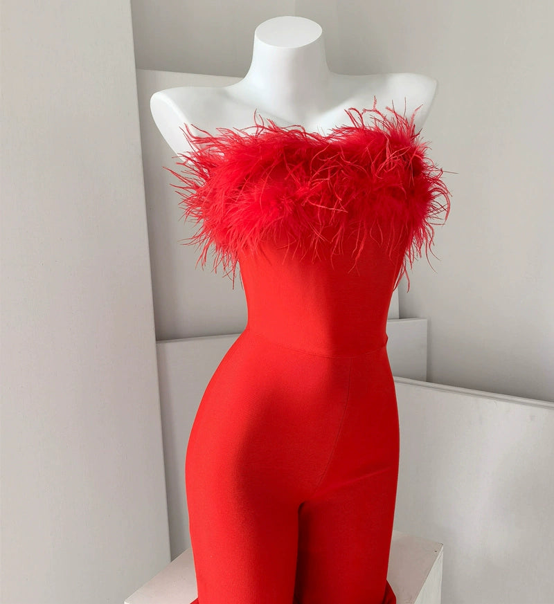 Elevate your style with the DOLLY High End Pant Jumpsuit. Featuring a sexy sleeveless design and elegant feather embellishments, this jumpsuit exudes sophistication. The flared pants add a touch of drama to your look. Perfect for any occasion, this jumpsuit is the ultimate statement piece. (v)