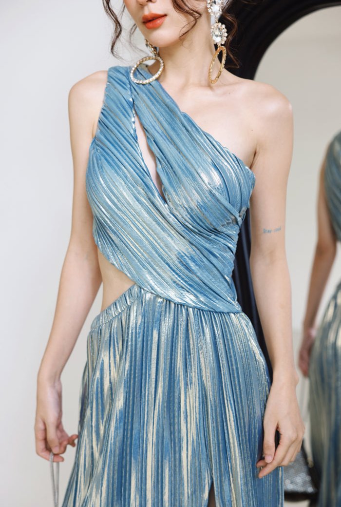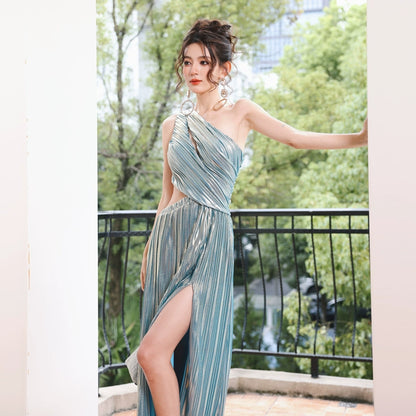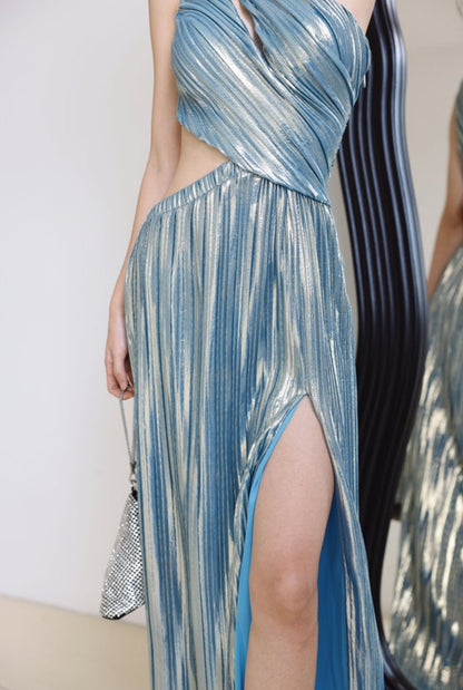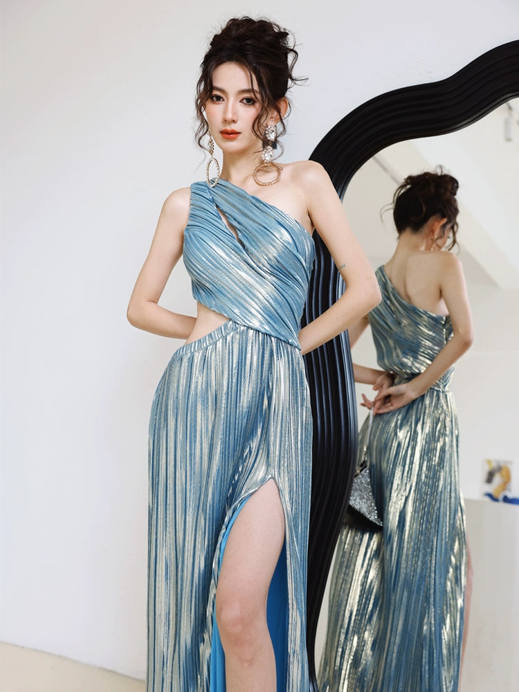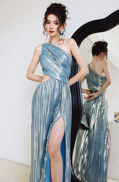 DOLLY High End Blue Off Shoulder Sleeveless Long Flowing Slit Banquet Dress-MABEL