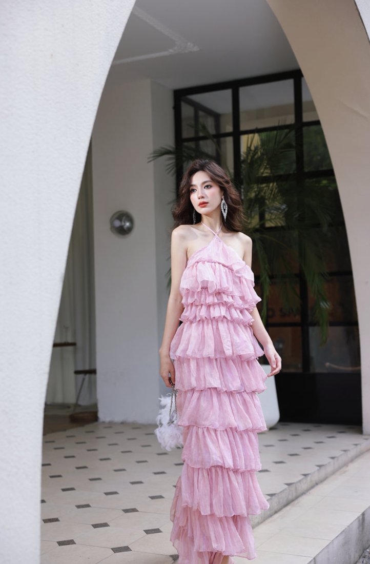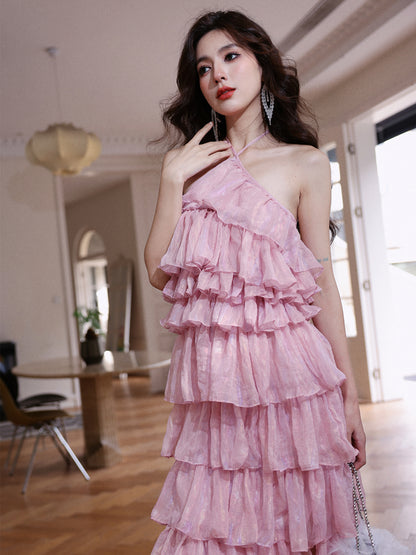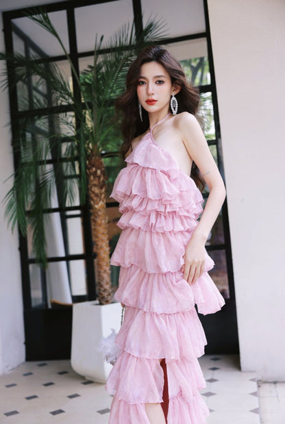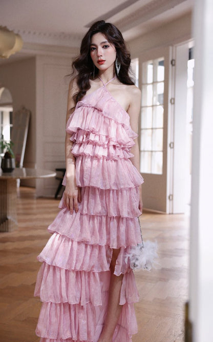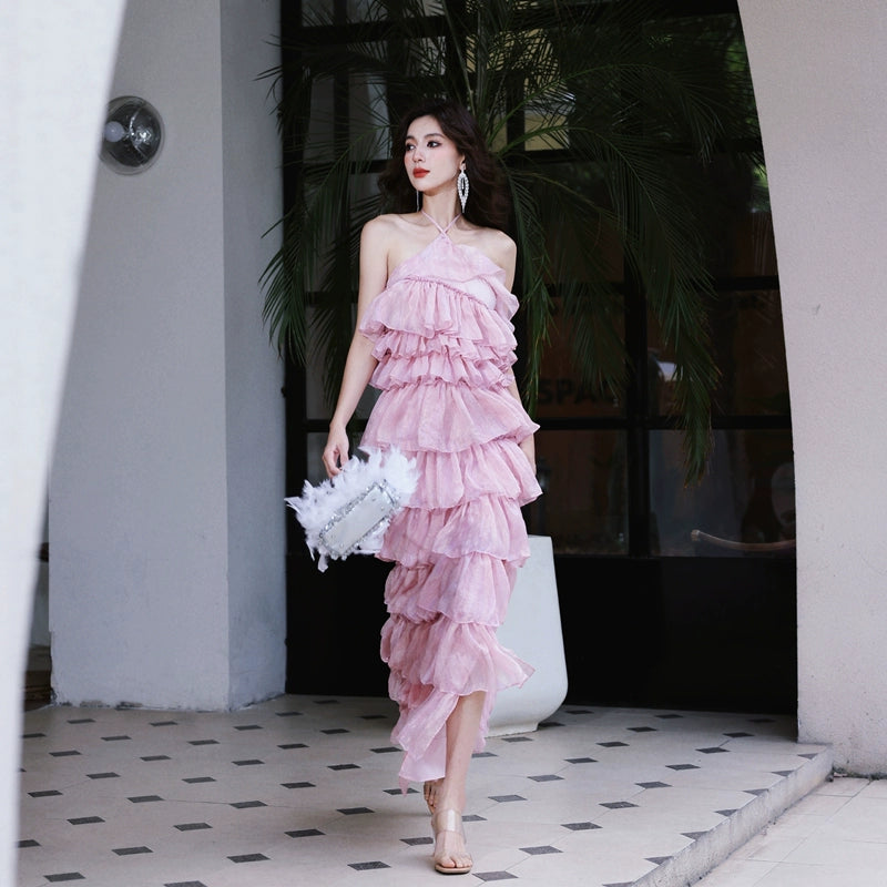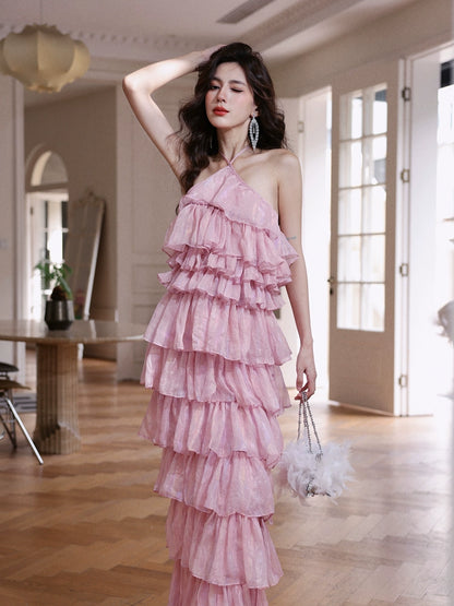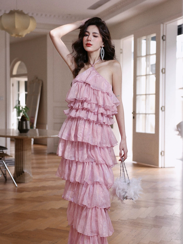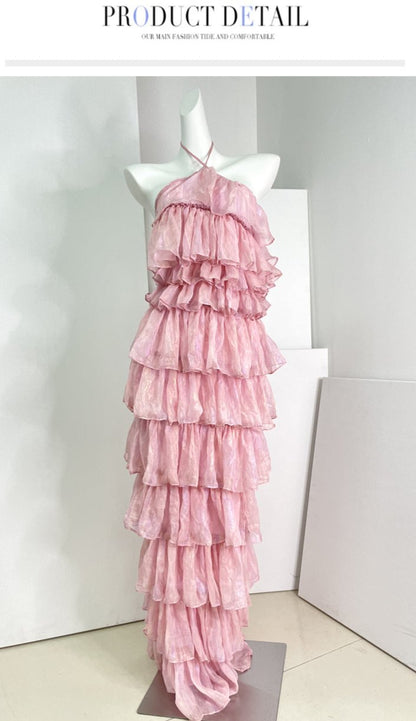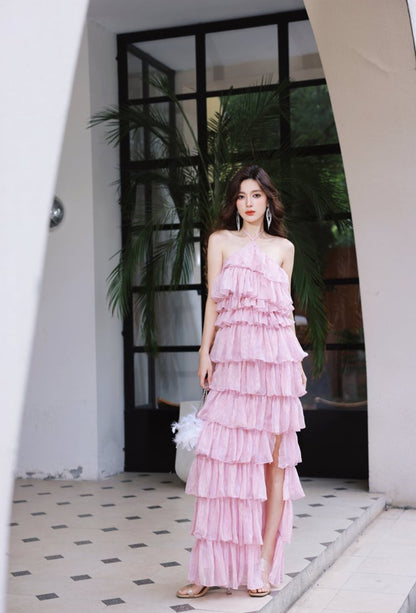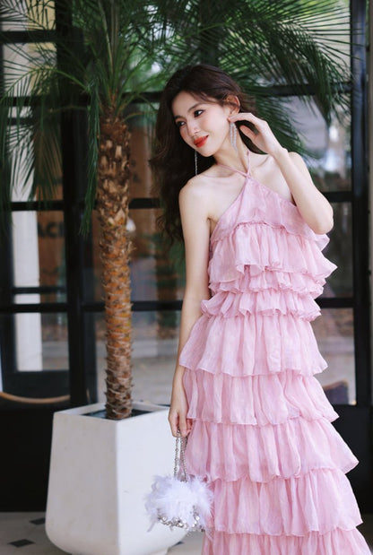 DOLLY High End Pink Sleeveless Loose Long Cake Halter Resort Dress-DEXIE