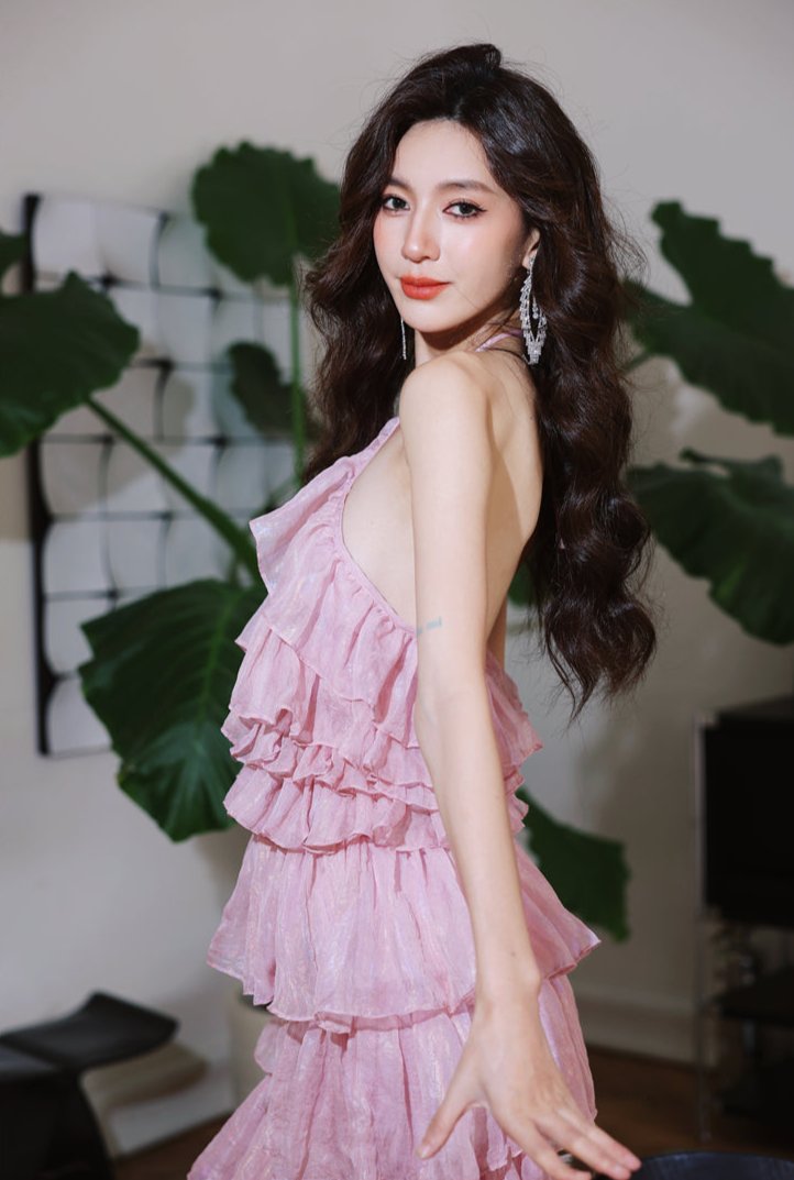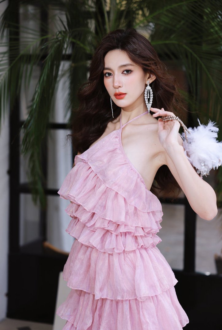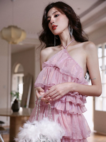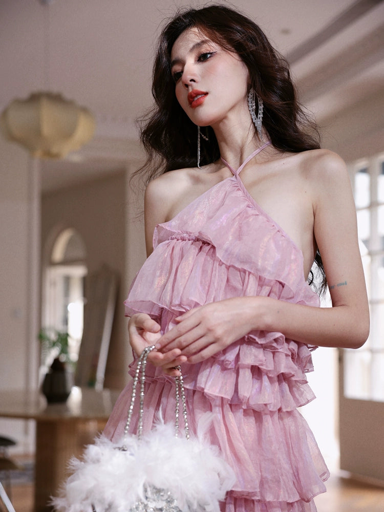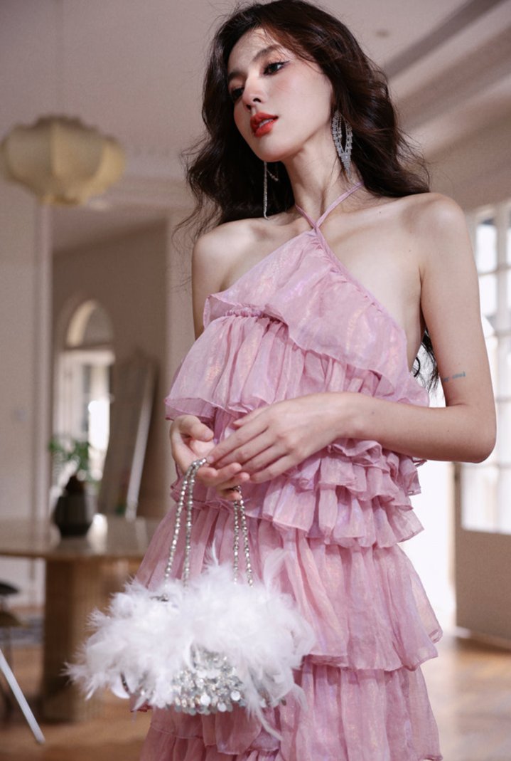DOLLY High End Pink Sleeveless Loose Long Cake Halter Resort Dress-DEXIE
