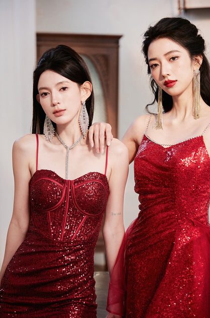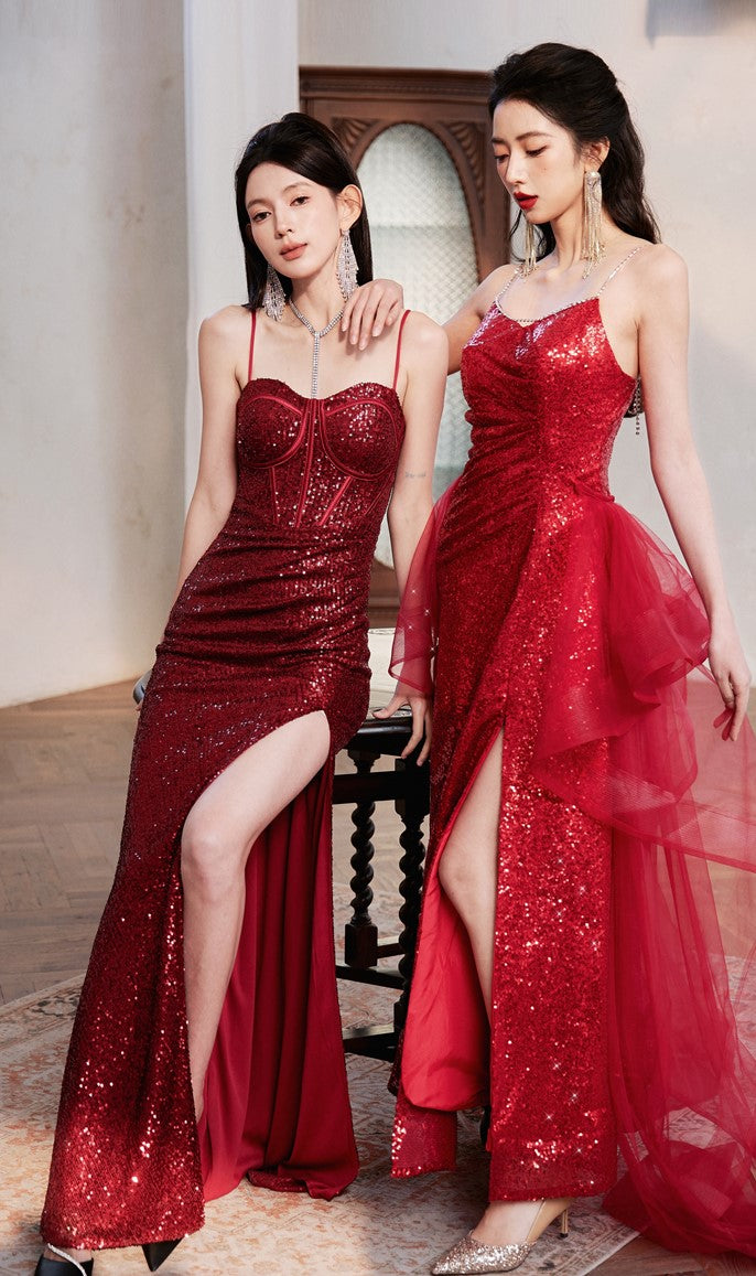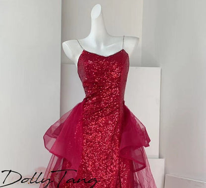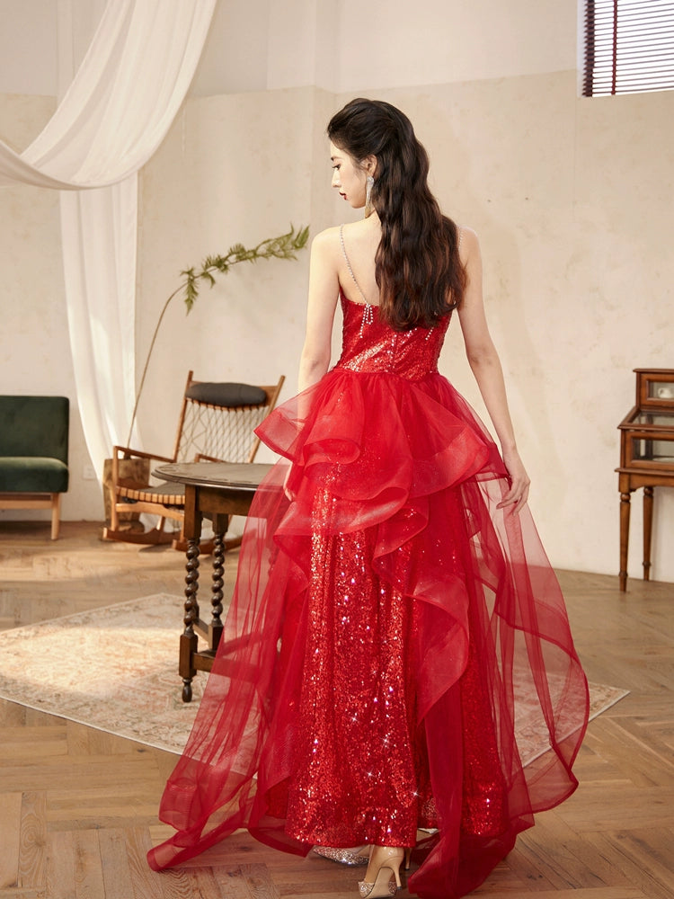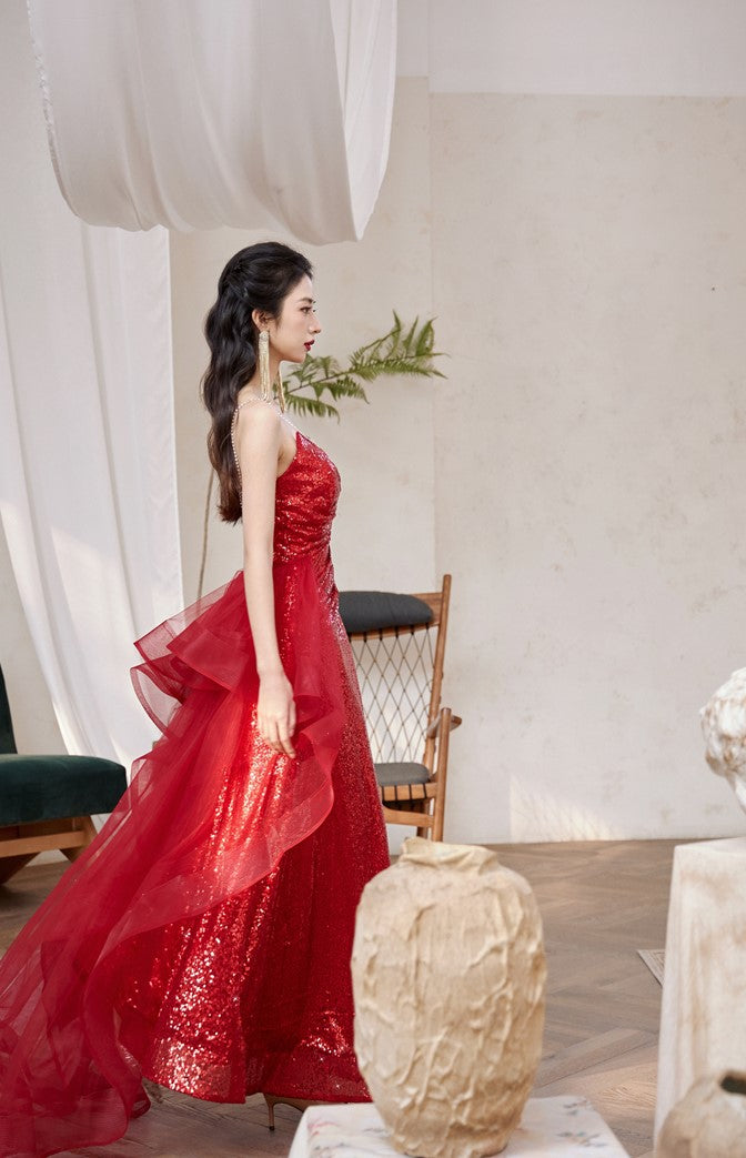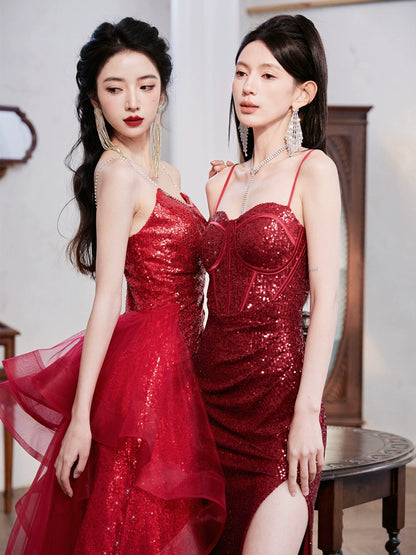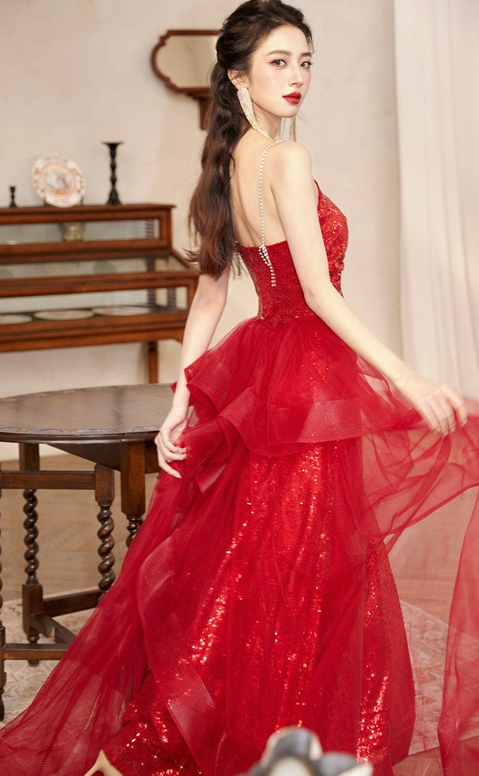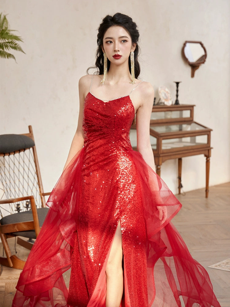 DOLLY High End Red Sleeveless Rhinestone Detachable Tail Dinner Party Dress-DATES
