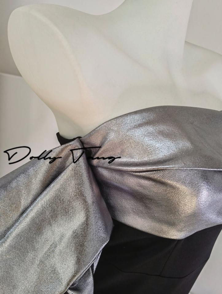 Flaunt your figure in the DOLLY High End Sliver/Black Off Shoulder Bandeau Slim Fit Long Cocktail Dress. With a sexy off shoulder design, this dress is perfect for a night out. The slim fit accentuates your curves and the high-end materials provide a luxurious touch. Elevate your style with this stunning dress.