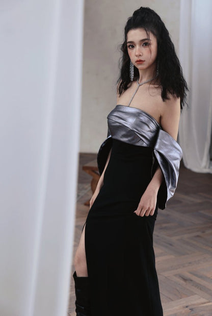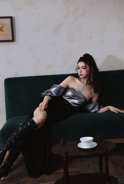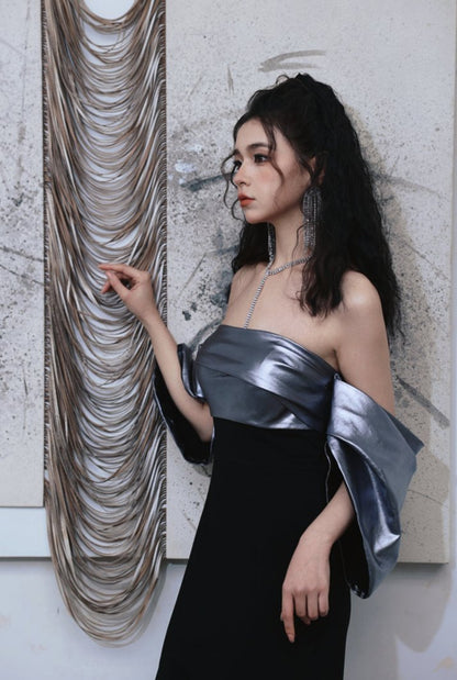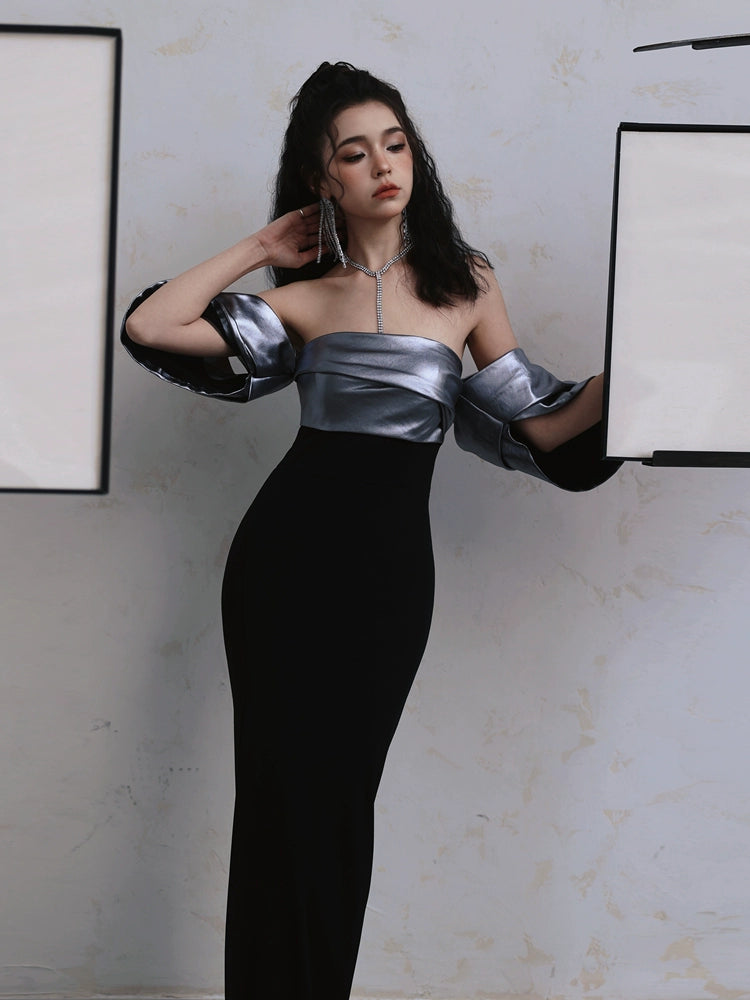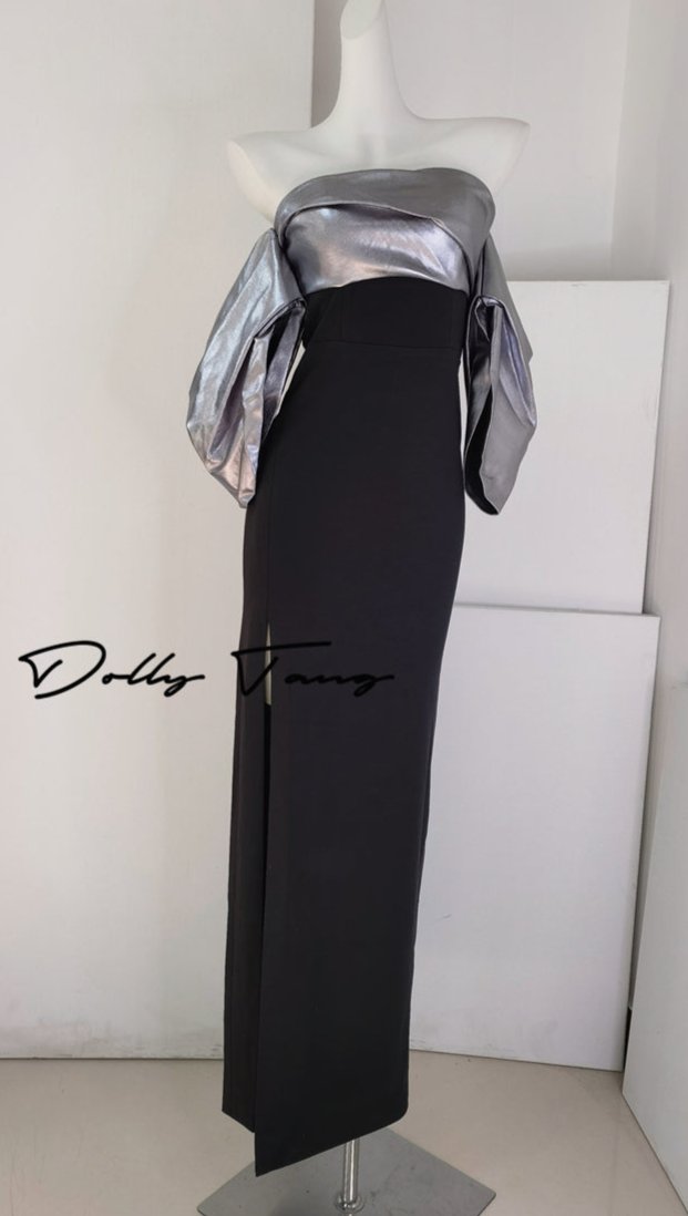 DOLLY High End Sliver/Black Off Shoulder Bandeau Slim Fit Long Cocktail Dress-MILAN