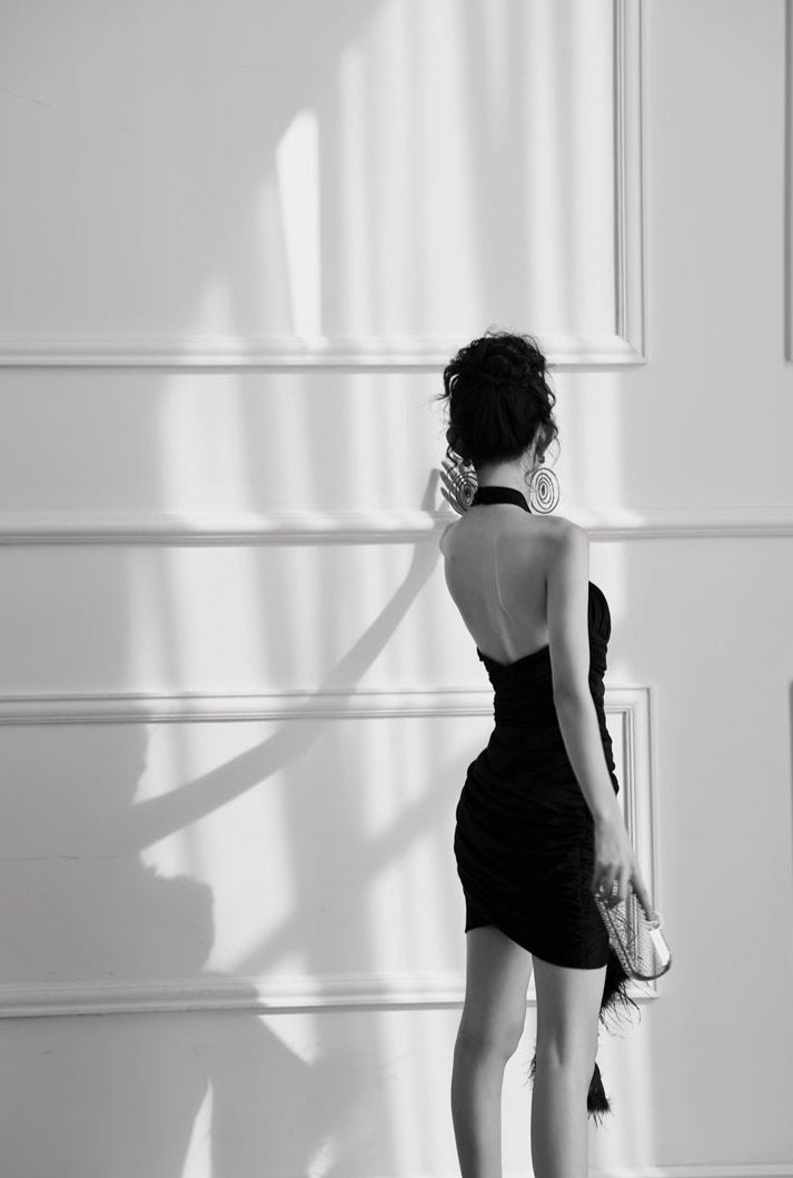 Indulge in luxury with the DOLLY black swan dress. The halter neck and backless design exudes chic and elegance, while the cross feather detailing adds a unique touch. Perfect for fall, this exquisite dress will make you feel gorgeous and dashing for any date. Experience the flamboyant and classy style of PRAGYA.