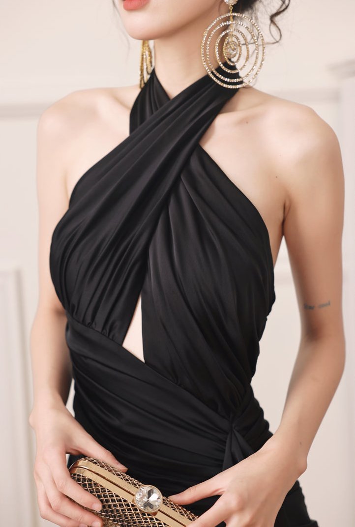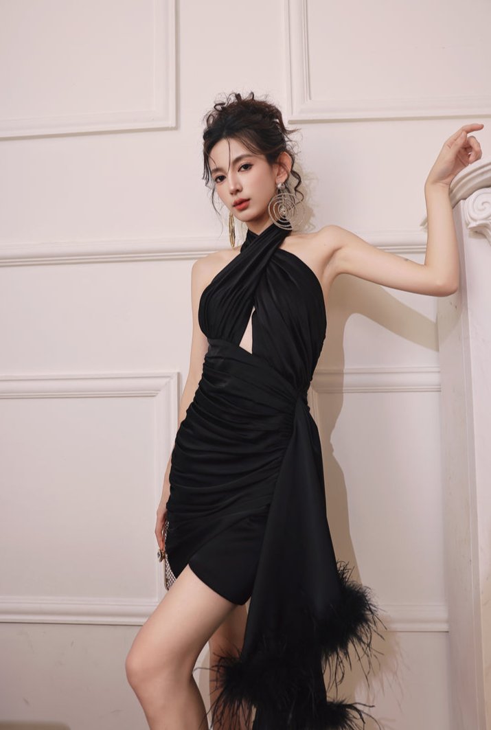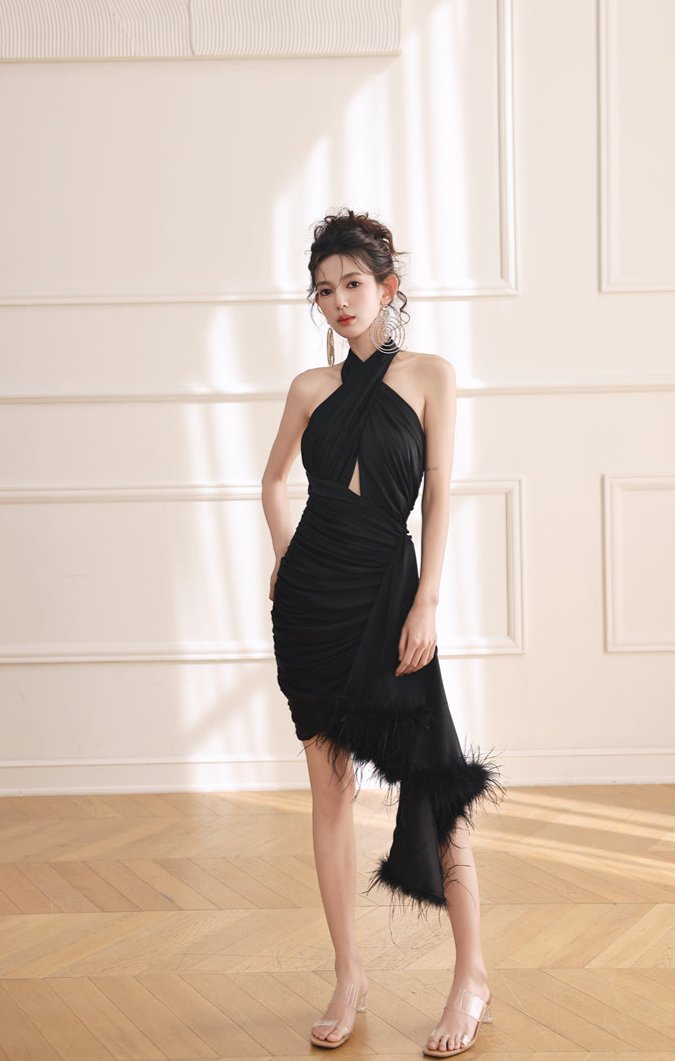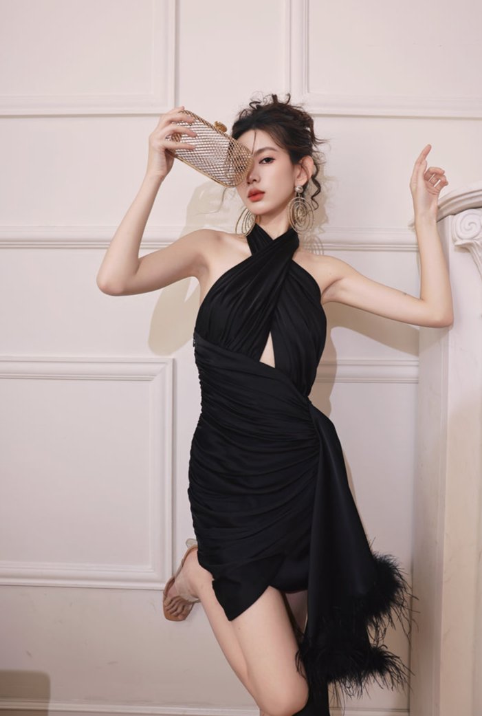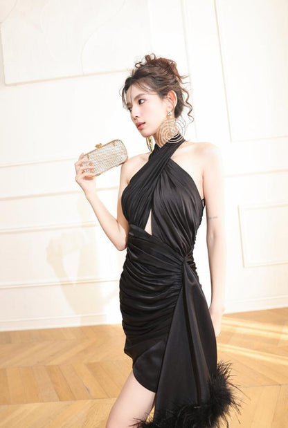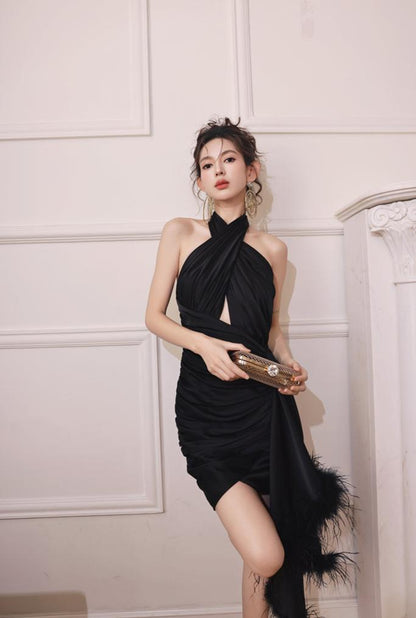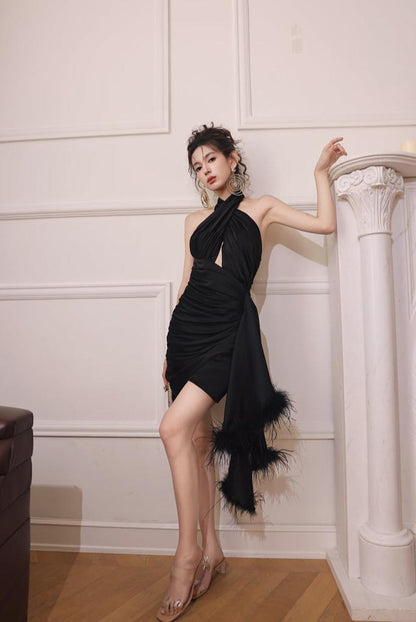 DOLLY Luxury Black Swan Cross Feather Halterneck Backless Date Dress-PRAGYA