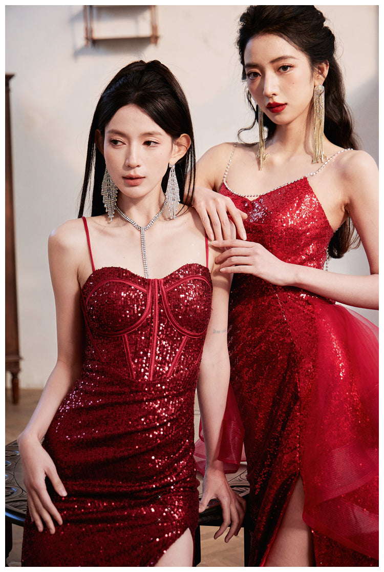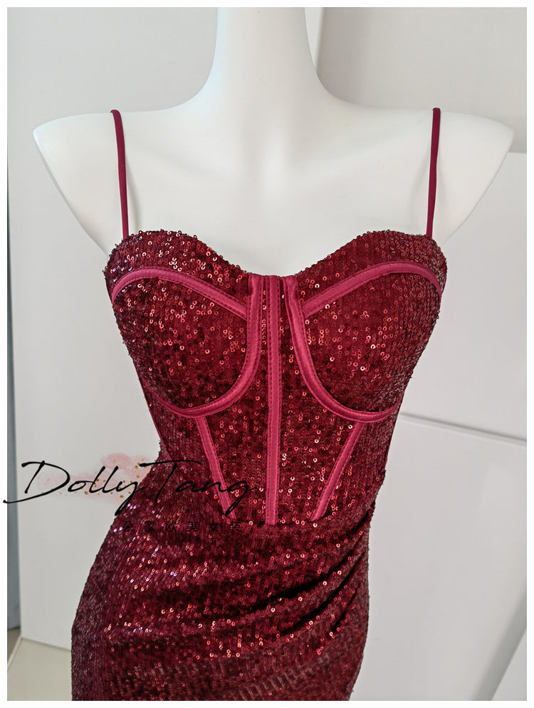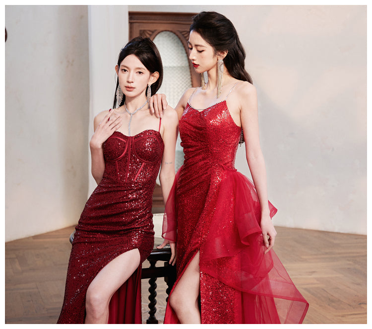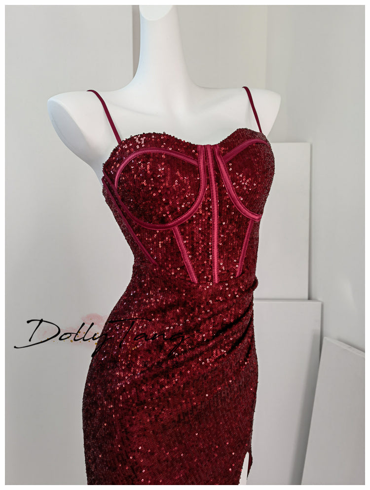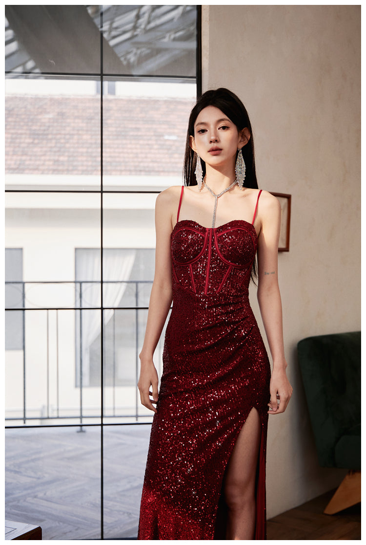 DOLLY Luxury Burgundy Red Sequin Suspender Long Slit Dinner Dress-CHE