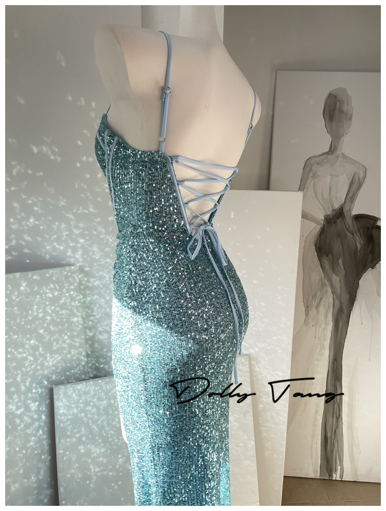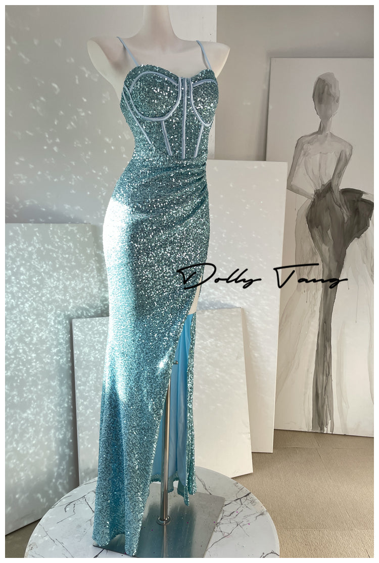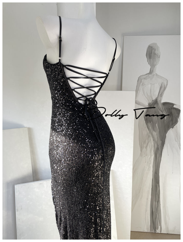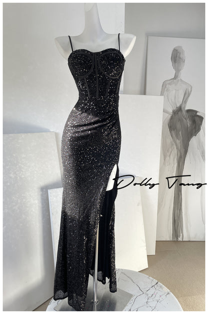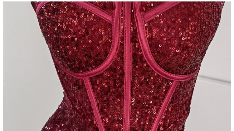 DOLLY Luxury Burgundy Red Sequin Suspender Long Slit Dinner Dress-CHE