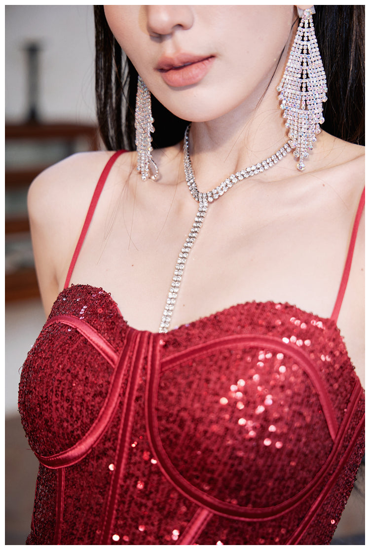 Introducing the DOLLY Luxury Burgundy Red Sequin Suspender Long Slit Dinner Dress-CHE. This red sequin dress features luxurious detailing, a midlength cut, and unique suspender straps. Perfect for a variety of occasions, this sophisticated and dashing dress will make you stand out with its chic and flamboyant style.