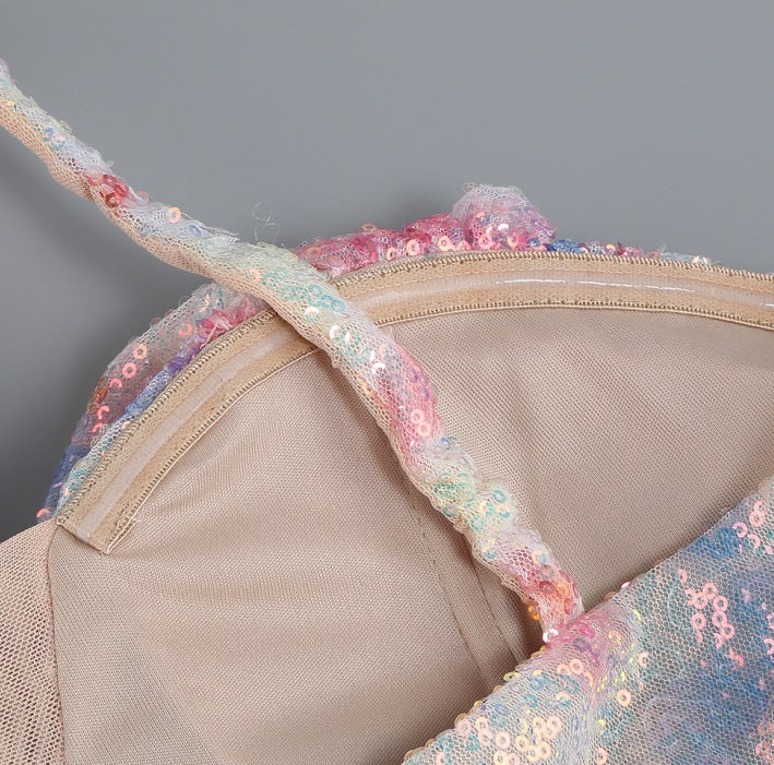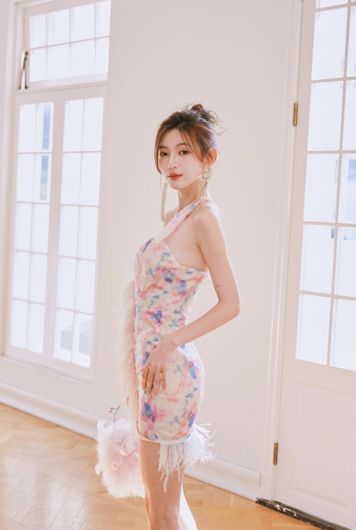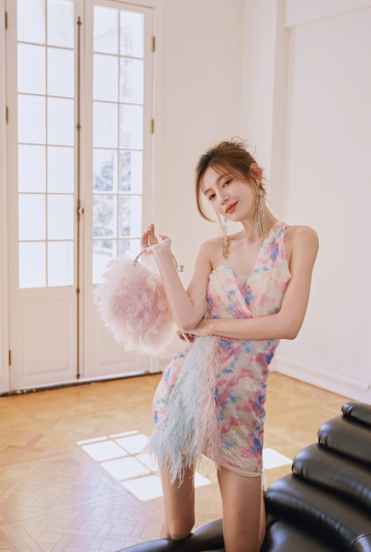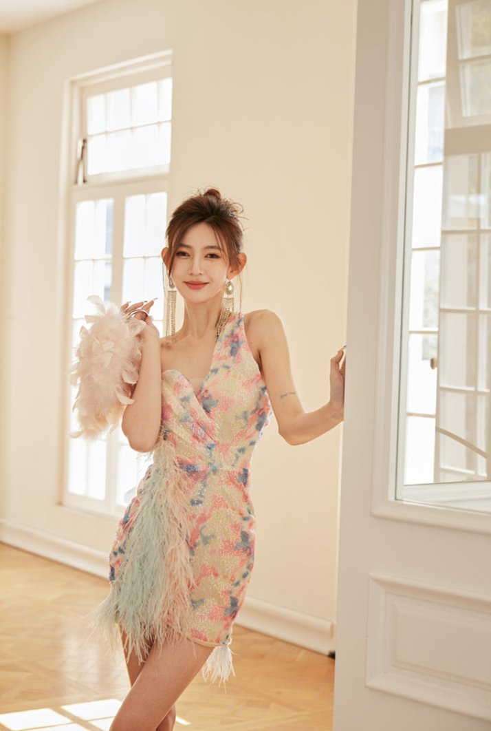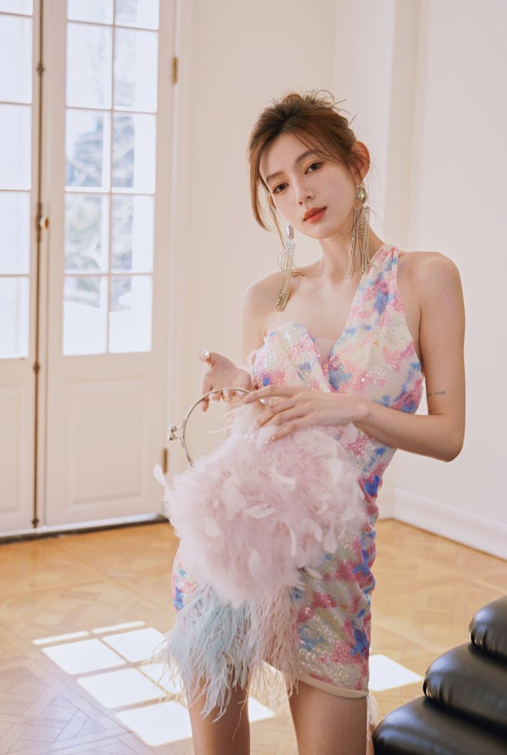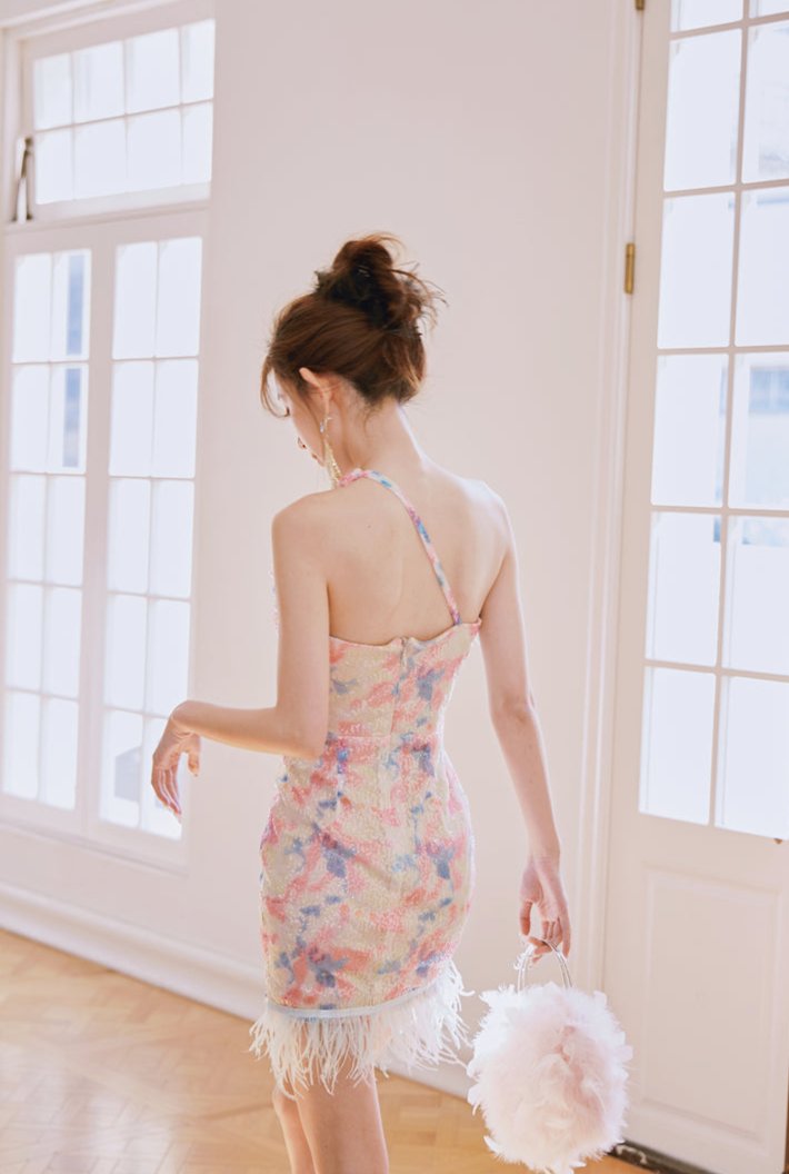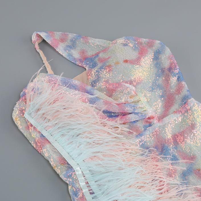 DOLLY Luxury Multi Colored V-Neck Sleeveless Feather Sequin Short Party Dress-FRANKIE