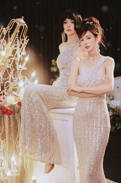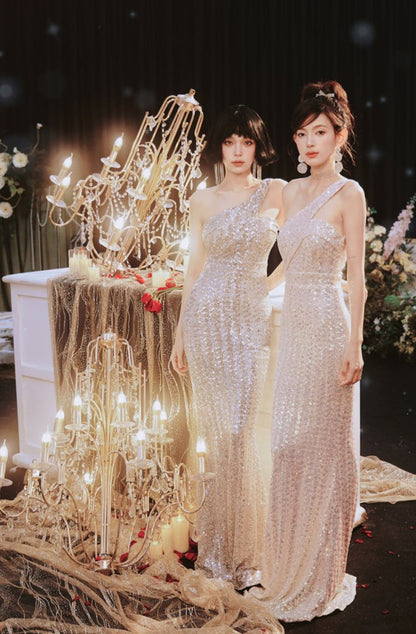 DOLLY Luxury Off White Sleeveless One Shoulder High Waist Long Evening Dress-LISA