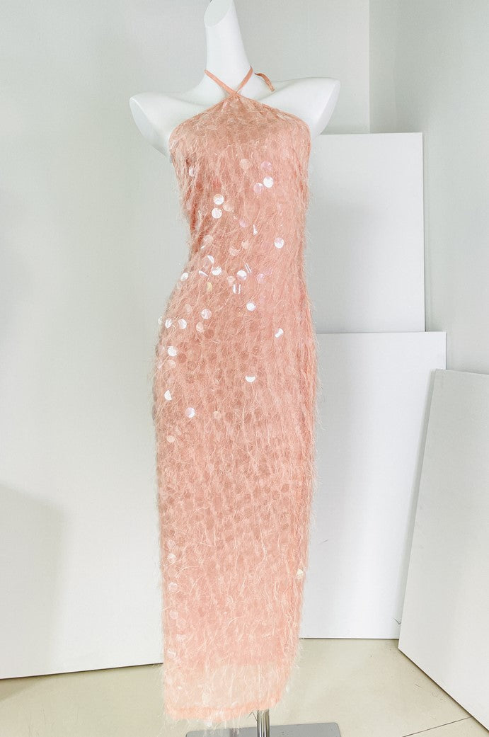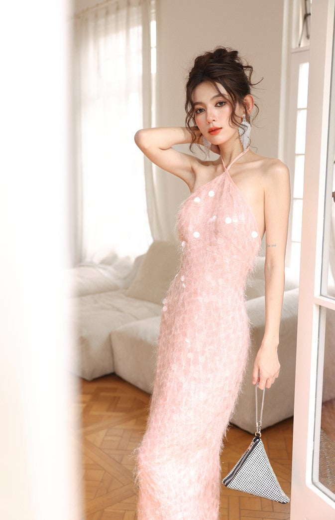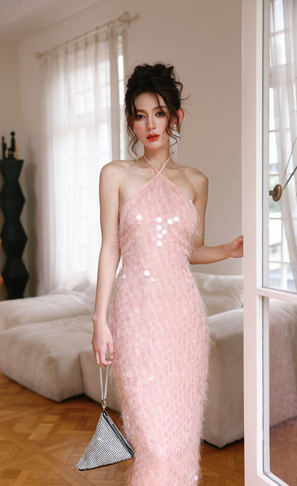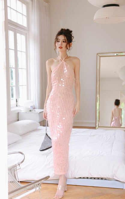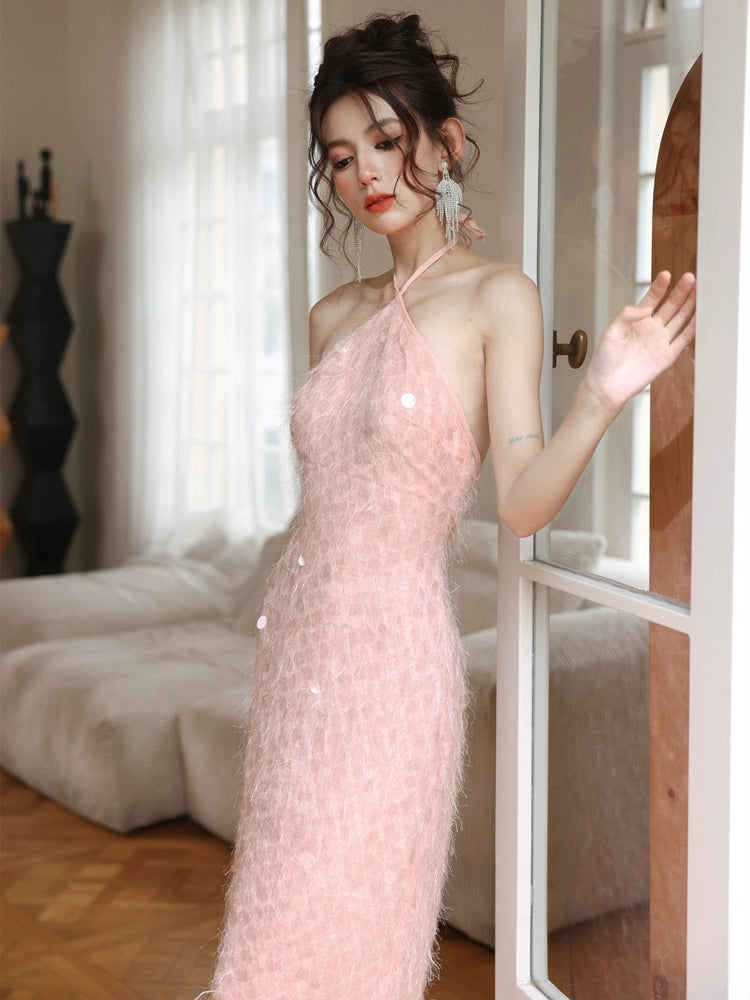 DOLLY Luxury Pink Halter Collar Sleeveless Slim Fit Sexy Halter Dinner Dress-MELODY