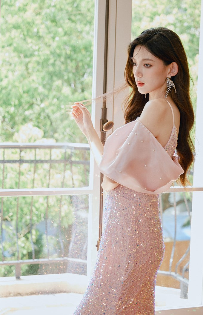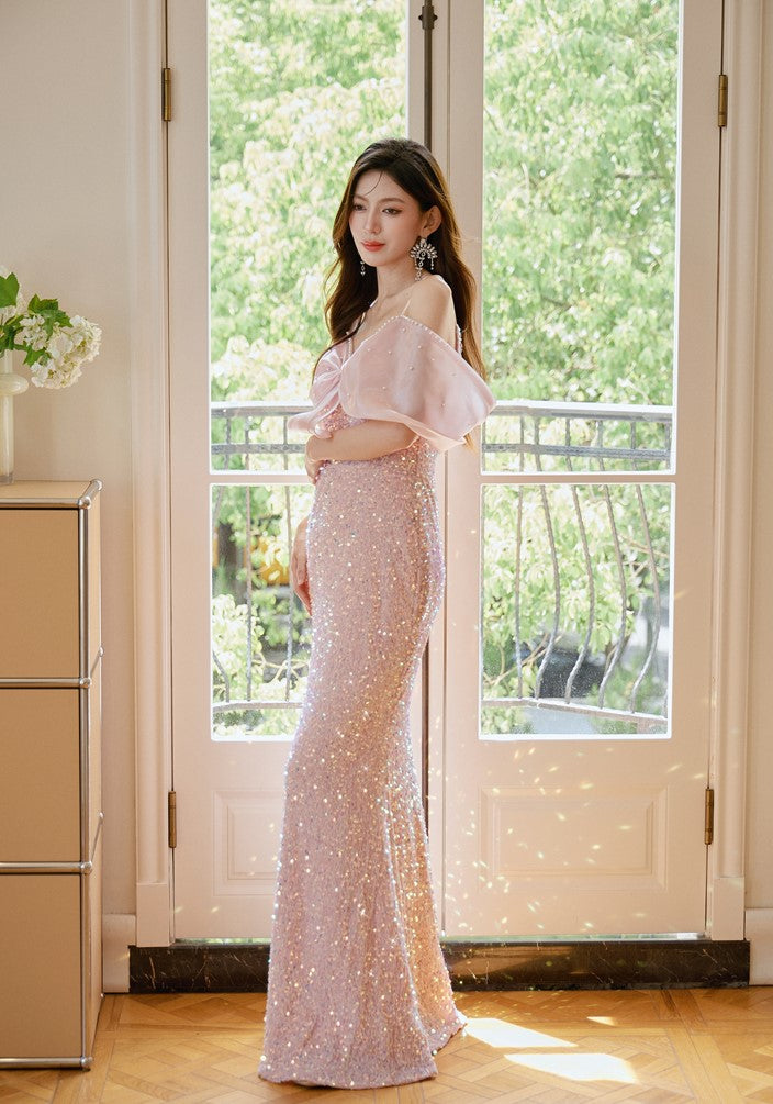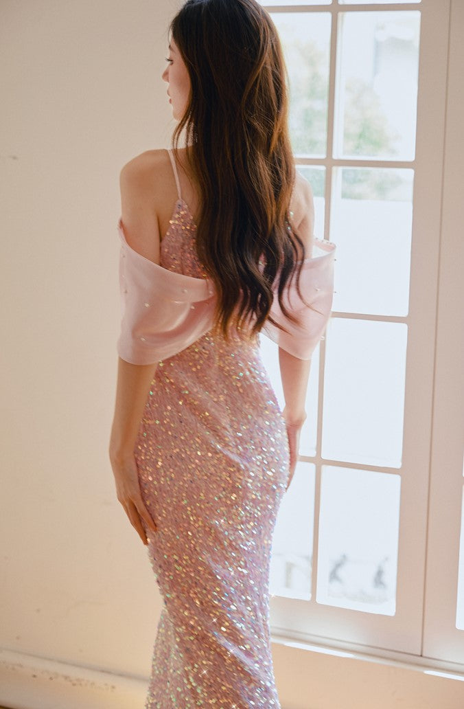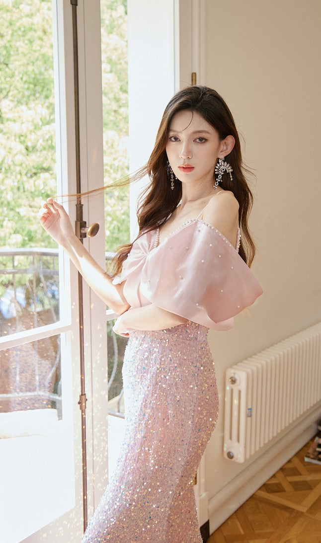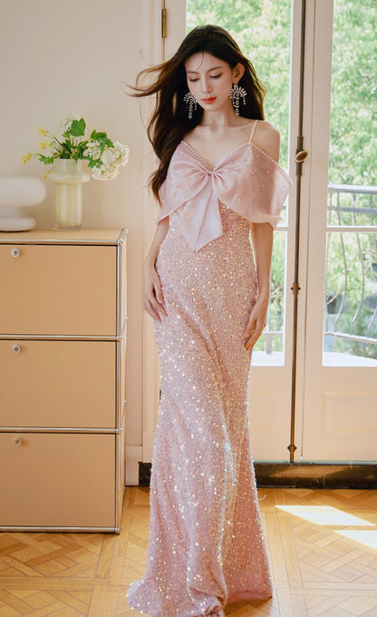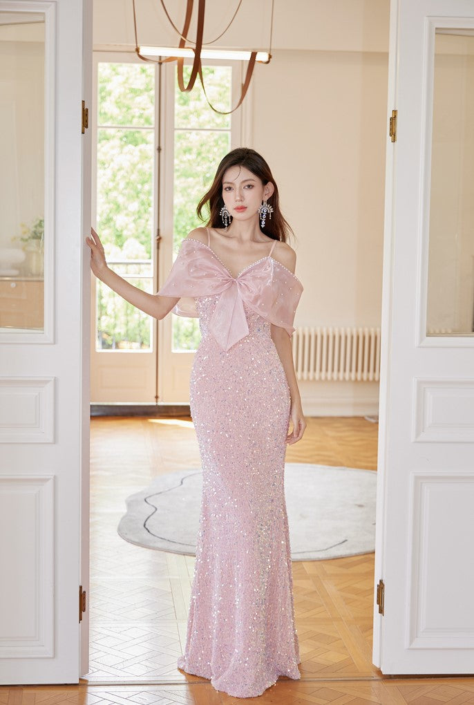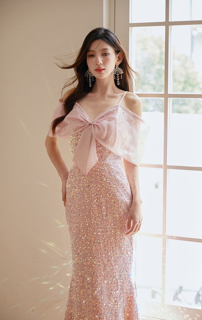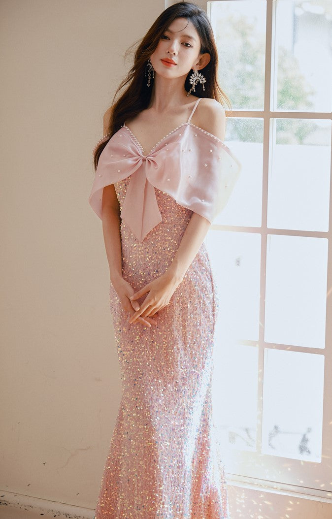 DOLLY Luxury Pink Off Shoulder Big Bow Body Shape Long Formal Dinner Dress-KATHY