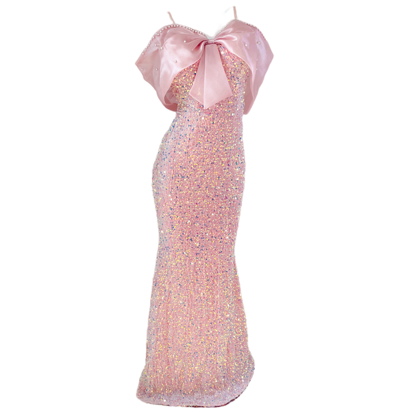 Expertly tailored with an off-shoulder design and a big bow accent, the DOLLY Luxury Pink Dress embodies elegance and glamour. Perfect for formal dinners, this dress enhances your body shape with style. (v)